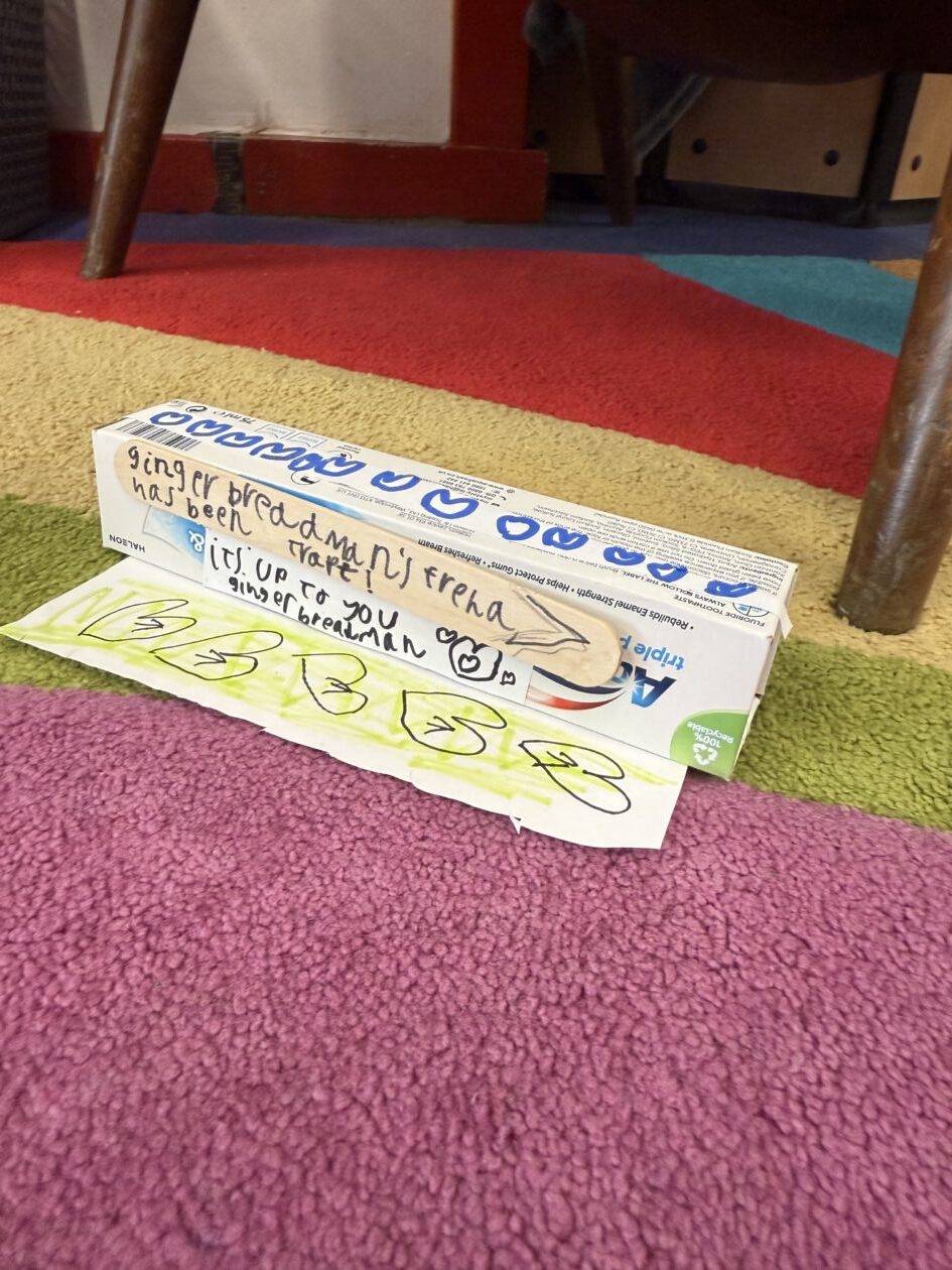 We also watched a video of gingerbread men invading our classroom, which caused great excitement and sparked imaginative ideas for our writing. This also sparked great enthusiasm for creating gingerbread men traps which have been set around the class in case they return.