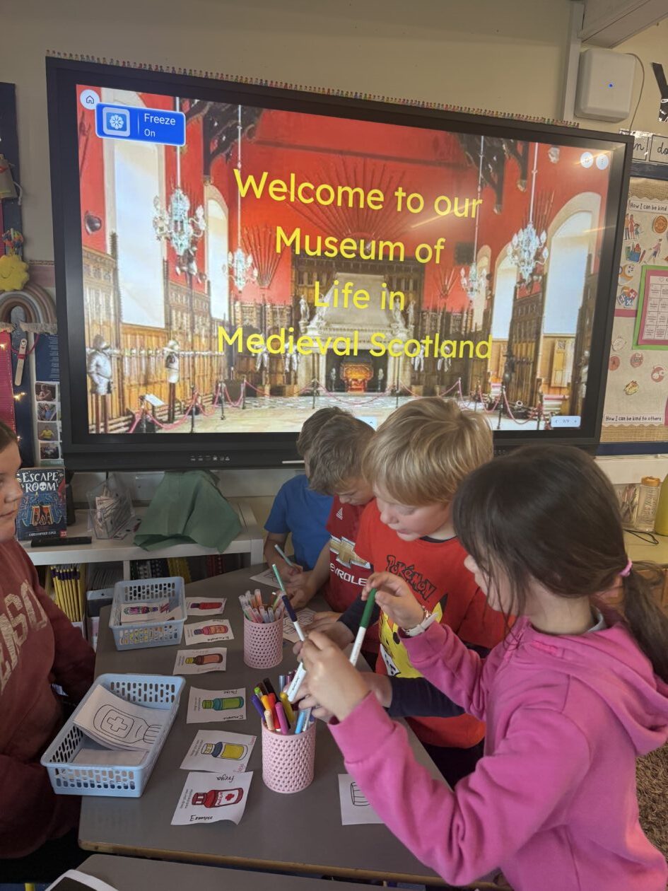 This week, Primary 3/4 were invited to visit the P5/6/7 Museum of Life in Medieval Scotland. The older pupils had transformed their classroom into a fantastic museum space, filled with exhibits, artefacts, and information displays.