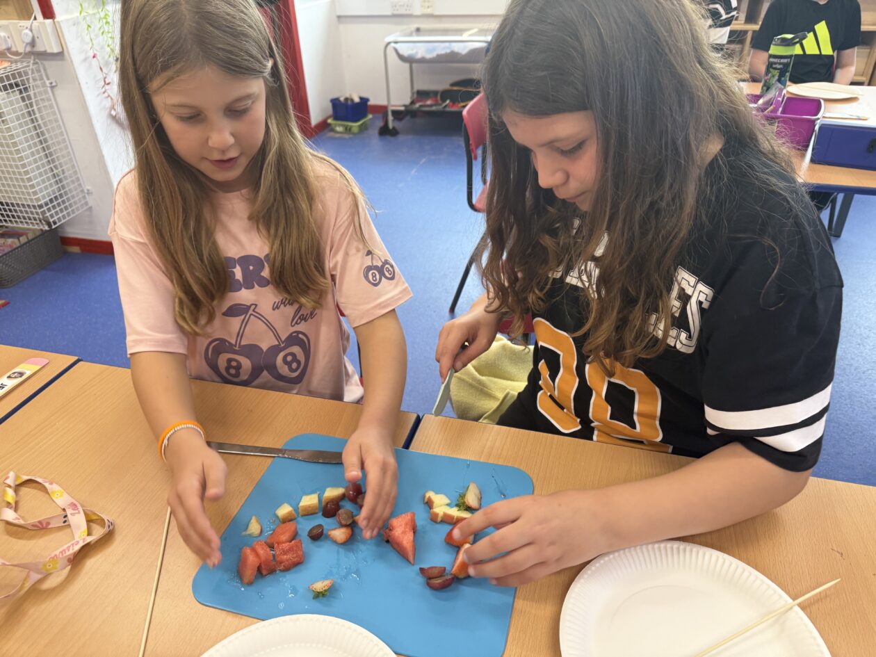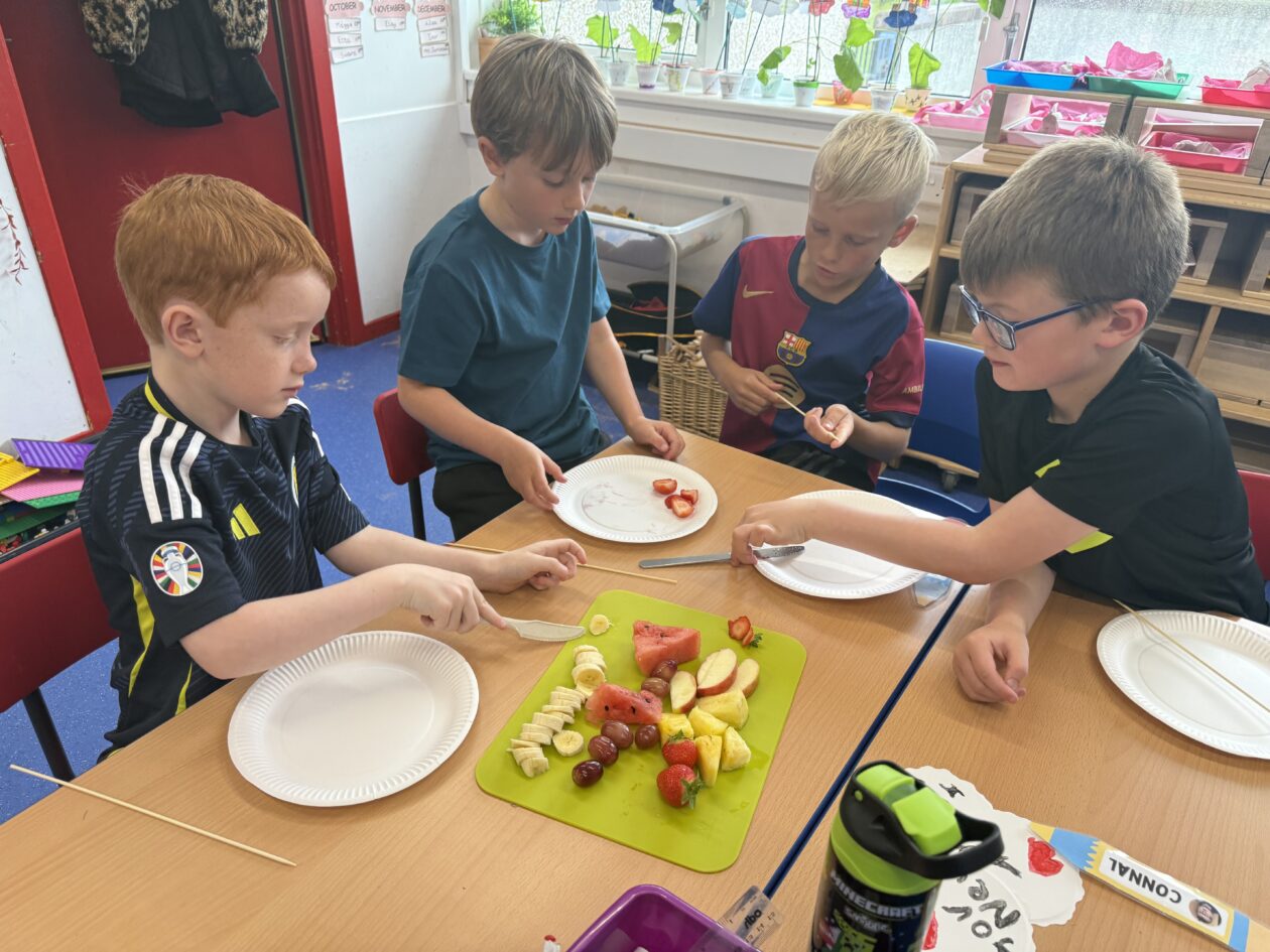 We read Eat Your Greens, Goldilocks and discussed the importance of healthy eating. The children then made their own fruit kebabs, which were both colourful and delicious!
