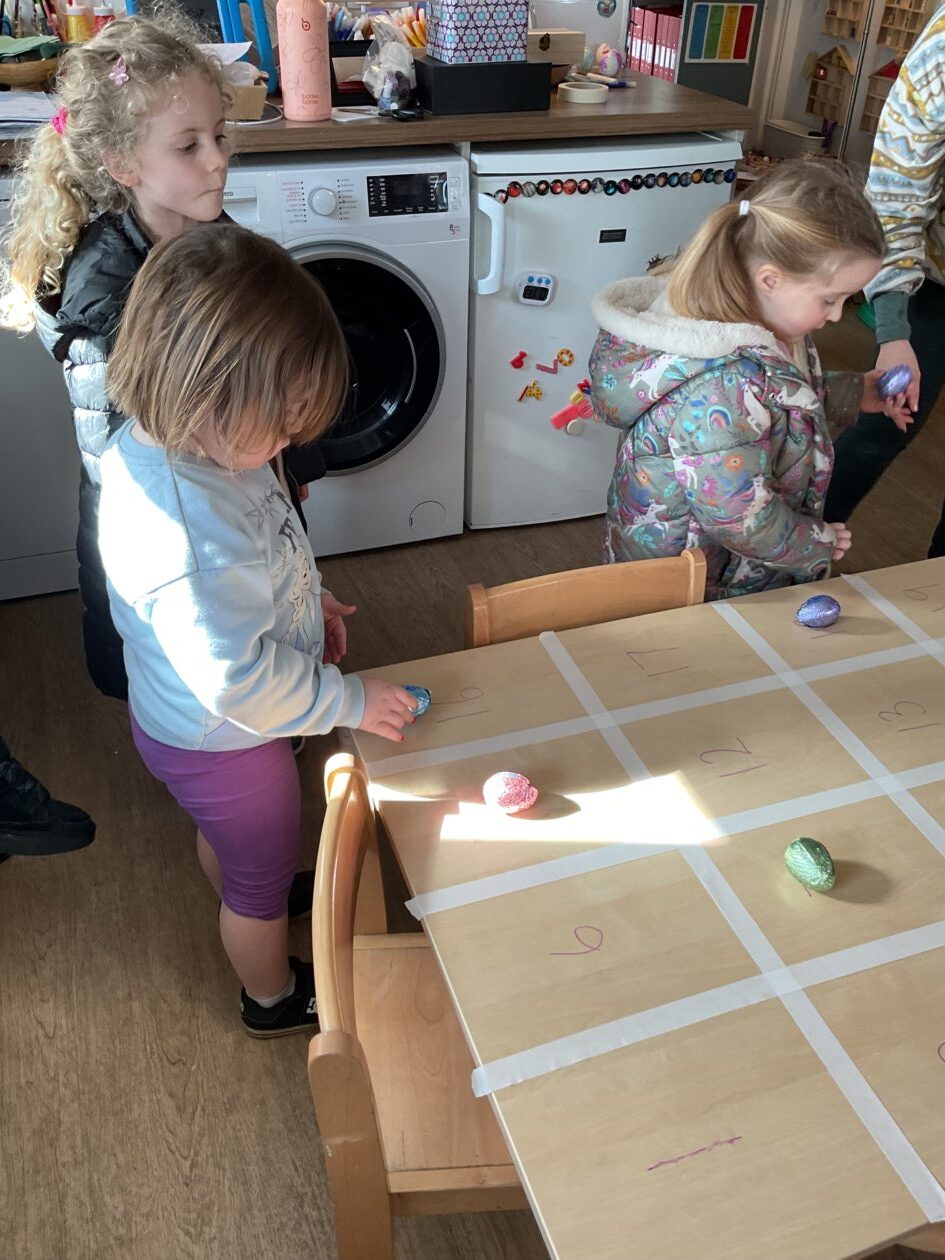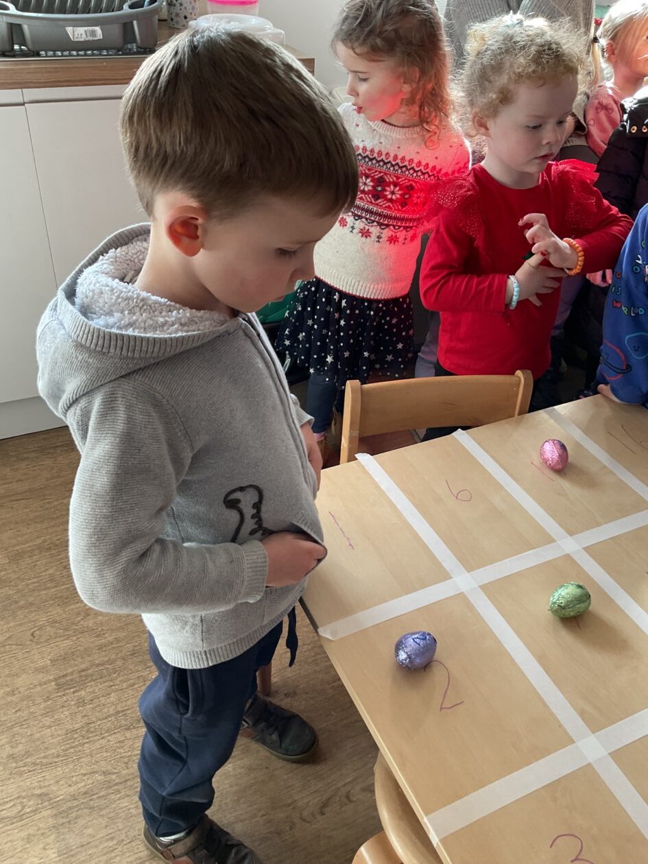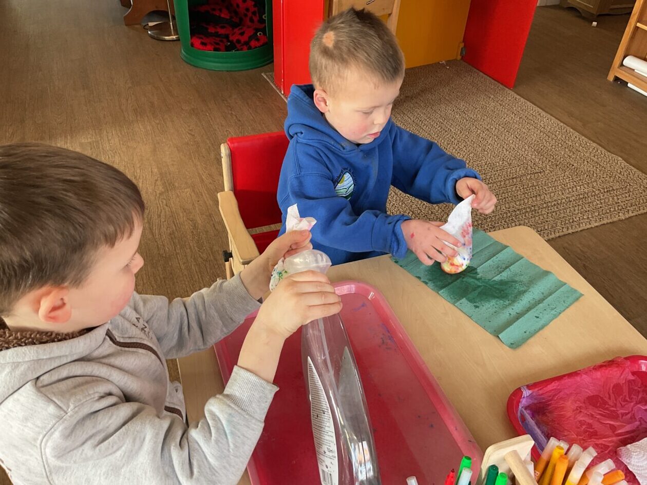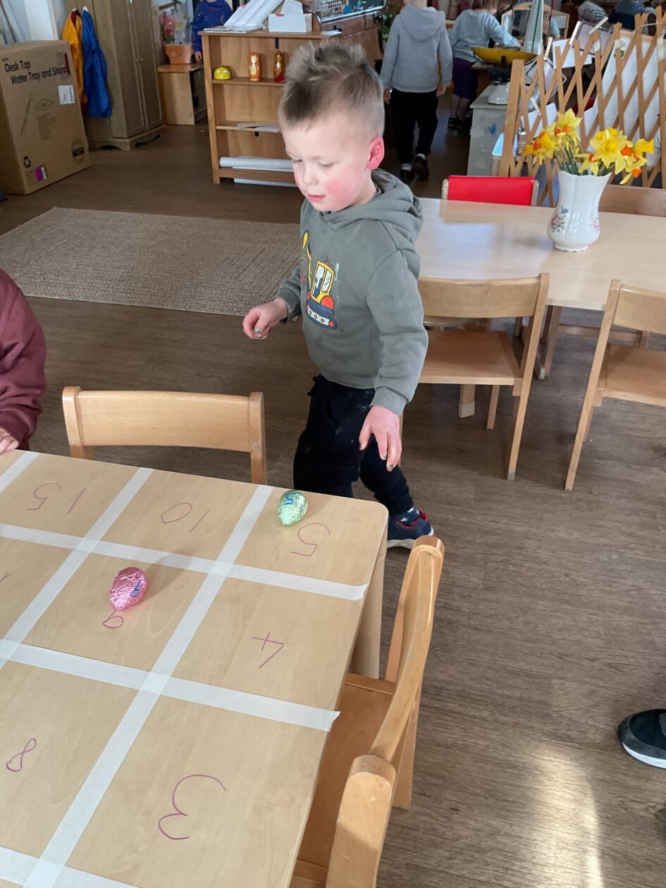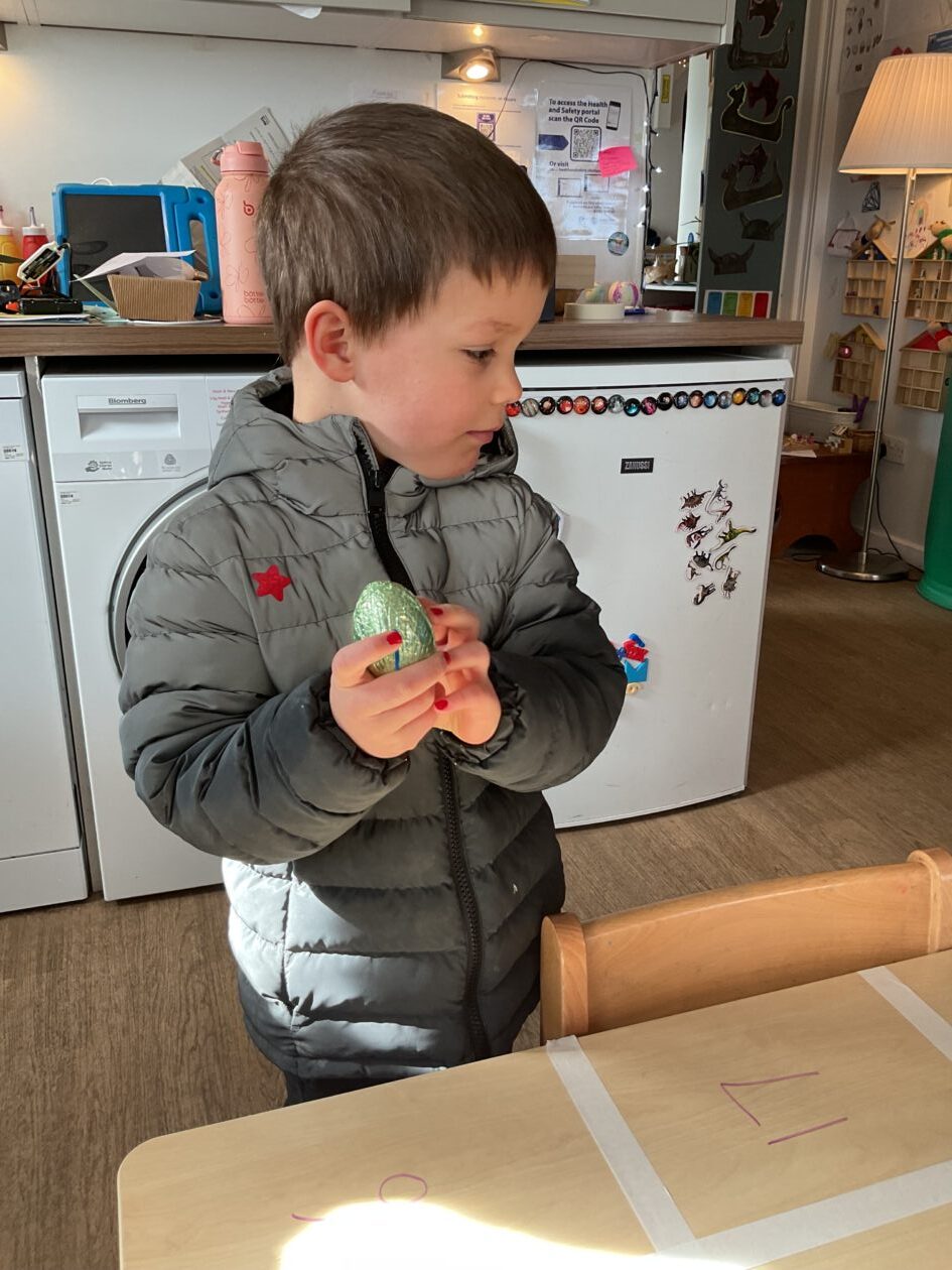 The bairns asked if we could deliver something to our neighbours next to nursery. They settled on Easter chick cards using shredded paper for feathers. The bairns also decorated eggs by drawing a pattern on a piece of kitchen roll, wrapping up their egg and spraying it with water to transfer the colour to their egg shell. The bairns asked for an egg hunt. We numbered the eggs and they matched them up the numbers on the table. Some of the eggs were very well hidden but not well enough for our intrepid hunters!