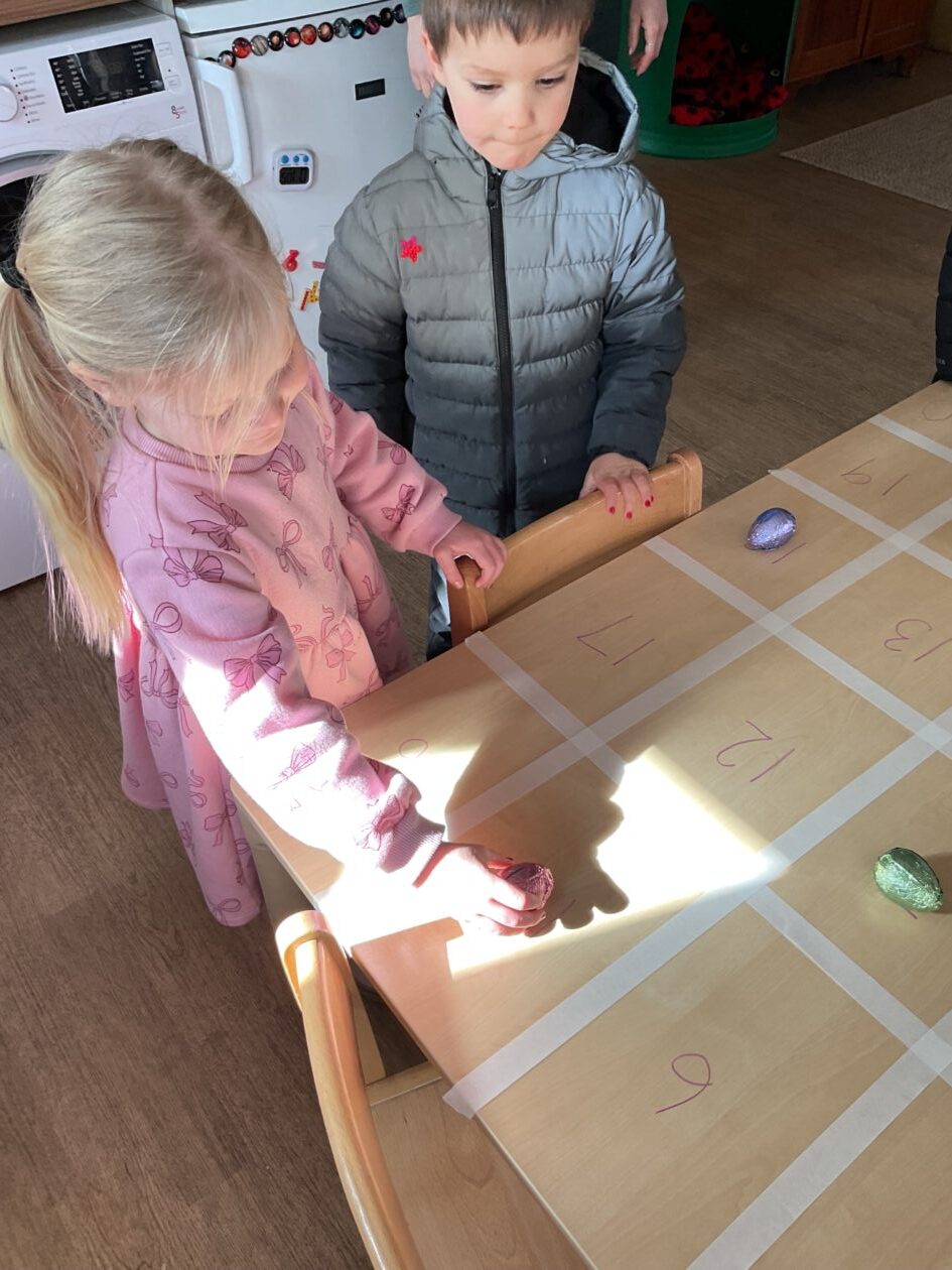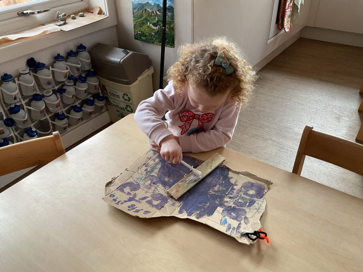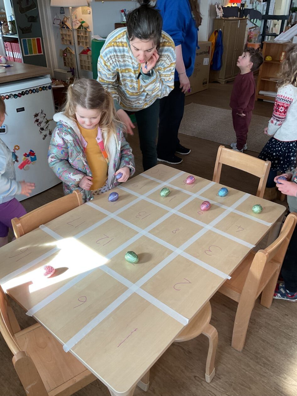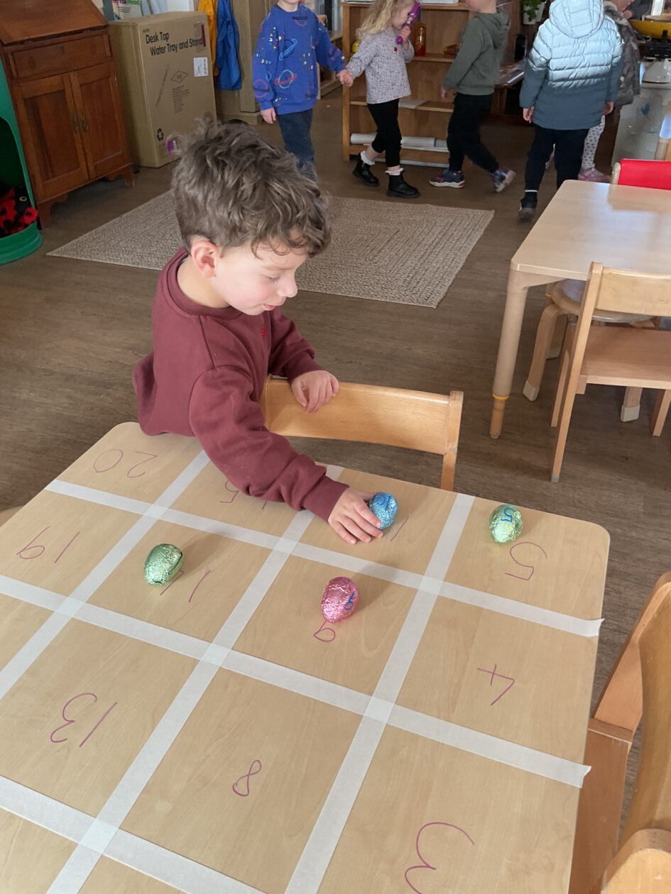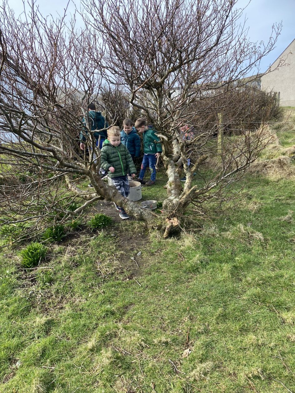 The bairns asked if we could deliver something to our neighbours next to nursery. They settled on Easter chick cards using shredded paper for feathers. The bairns also decorated eggs by drawing a pattern on a piece of kitchen roll, wrapping up their egg and spraying it with water to transfer the colour to their egg shell. The bairns asked for an egg hunt. We numbered the eggs and they matched them up the numbers on the table. Some of the eggs were very well hidden but not well enough for our intrepid hunters!