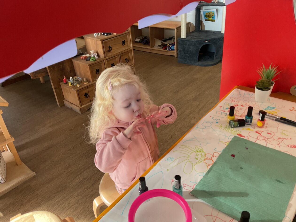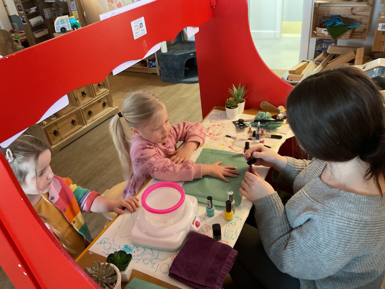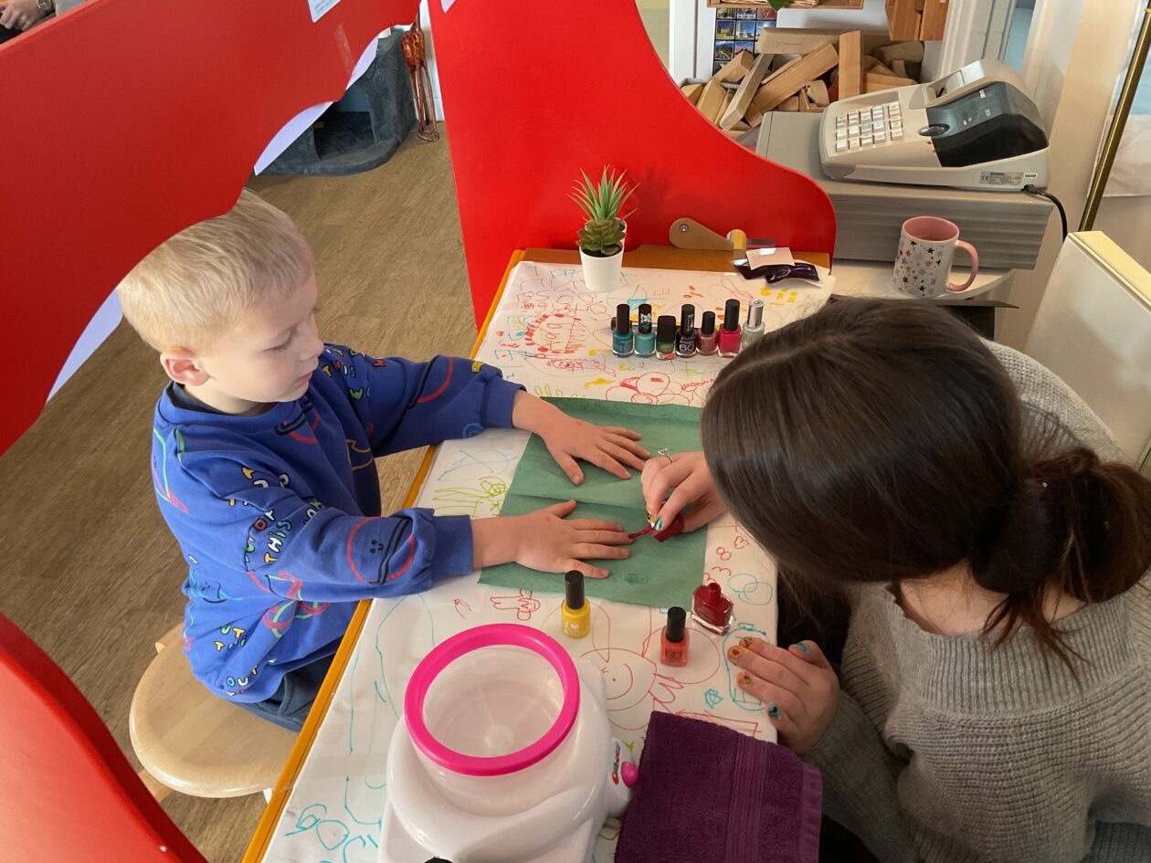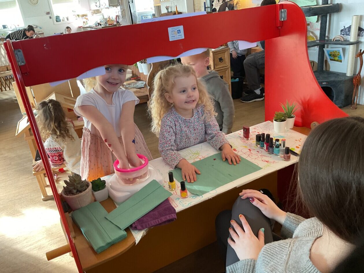 The bairns set about decorating their spa with pictures and signs. They laid out towels, blankets and mats. The bairns phoned to make an appointment for their treatment. When they arrived at the spa, they chose their nail polish colour, a tattoo and they could use the Orbeez hand and nail spa. The spa was a very popular place and there were even some appointments left for the adults!