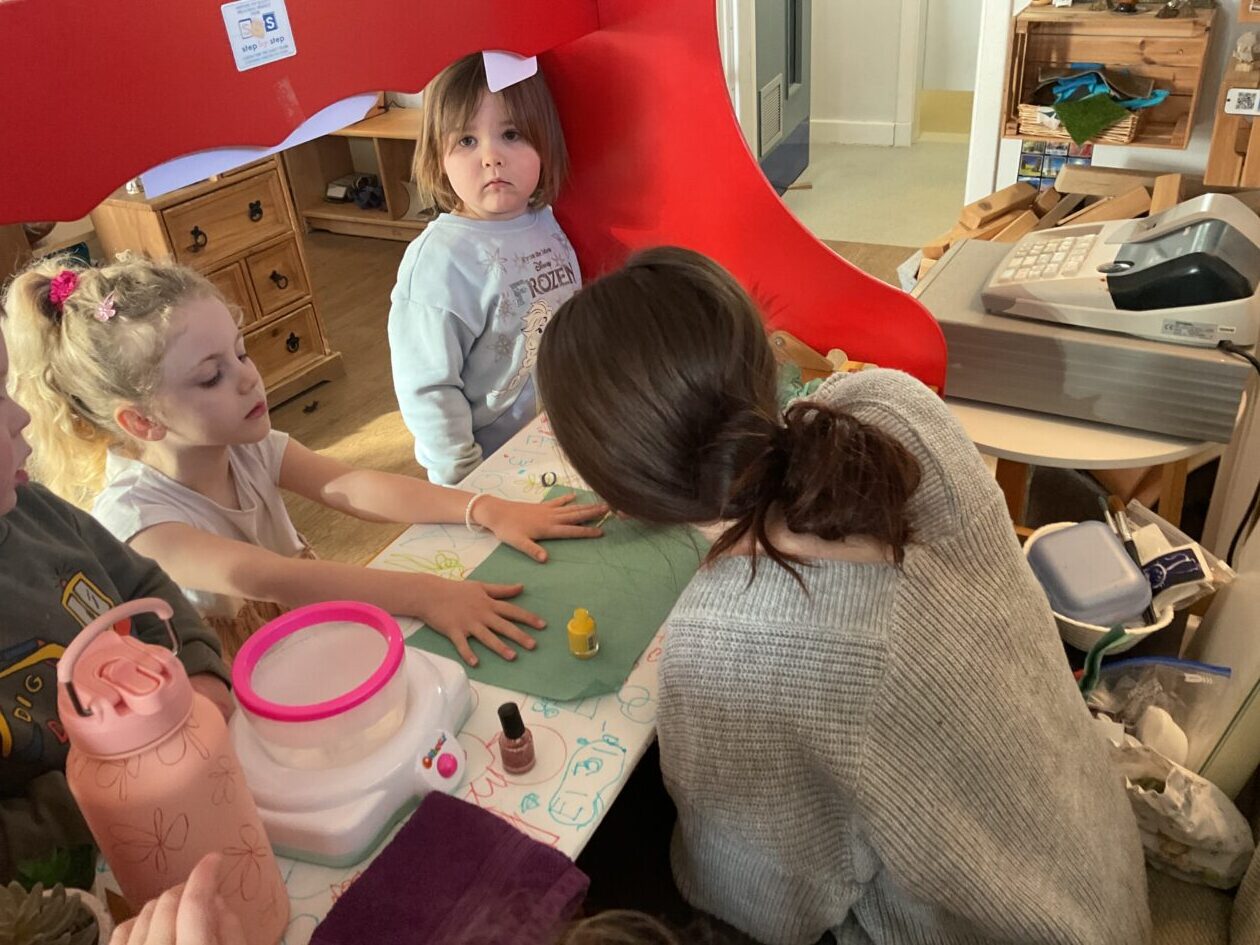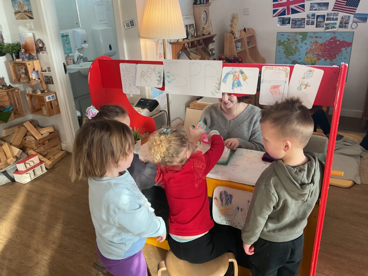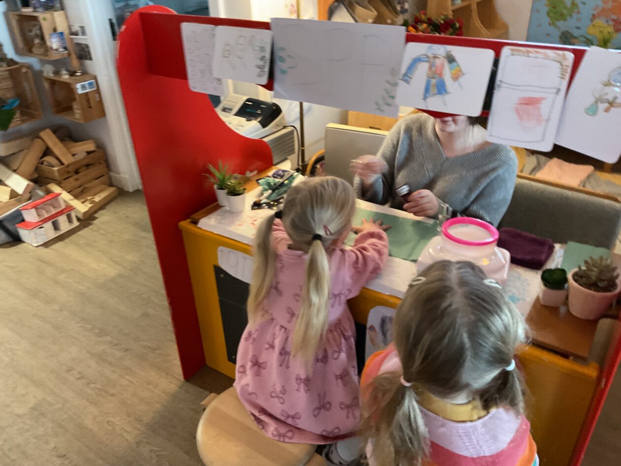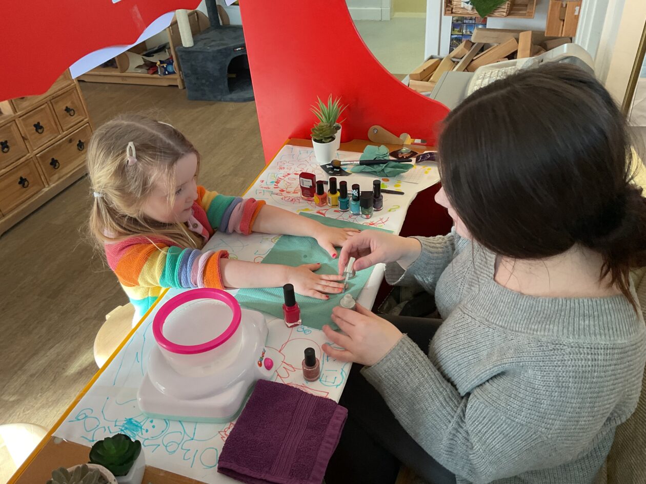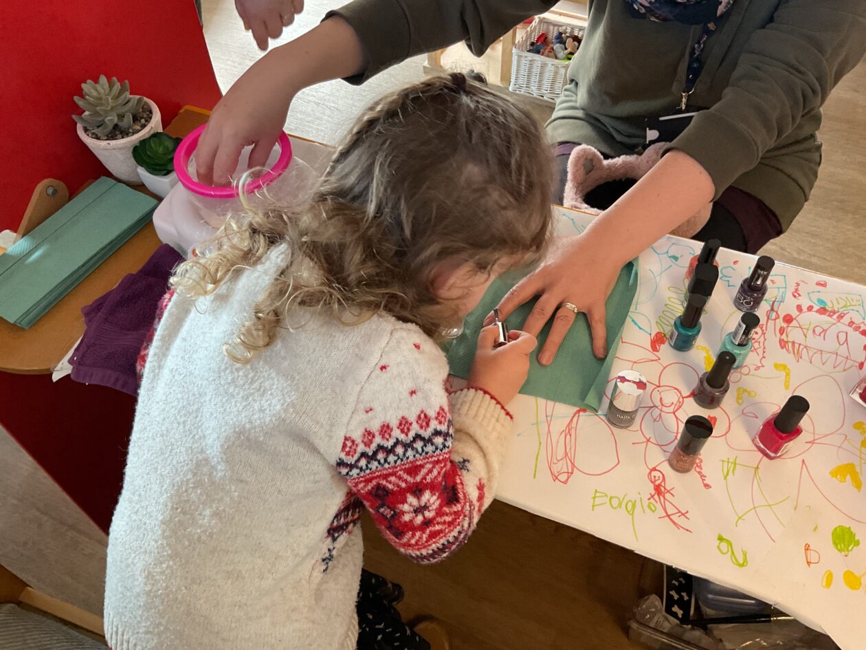 The bairns set about decorating their spa with pictures and signs. They laid out towels, blankets and mats. The bairns phoned to make an appointment for their treatment. When they arrived at the spa, they chose their nail polish colour, a tattoo and they could use the Orbeez hand and nail spa. The spa was a very popular place and there were even some appointments left for the adults!
