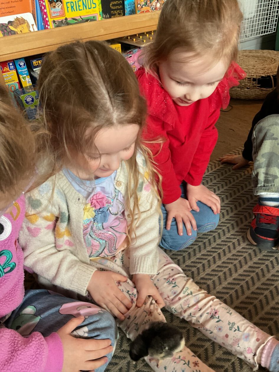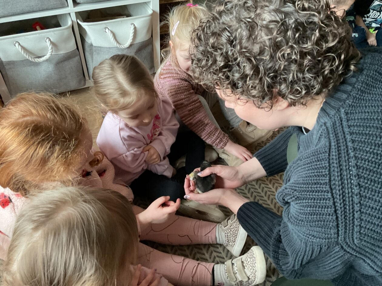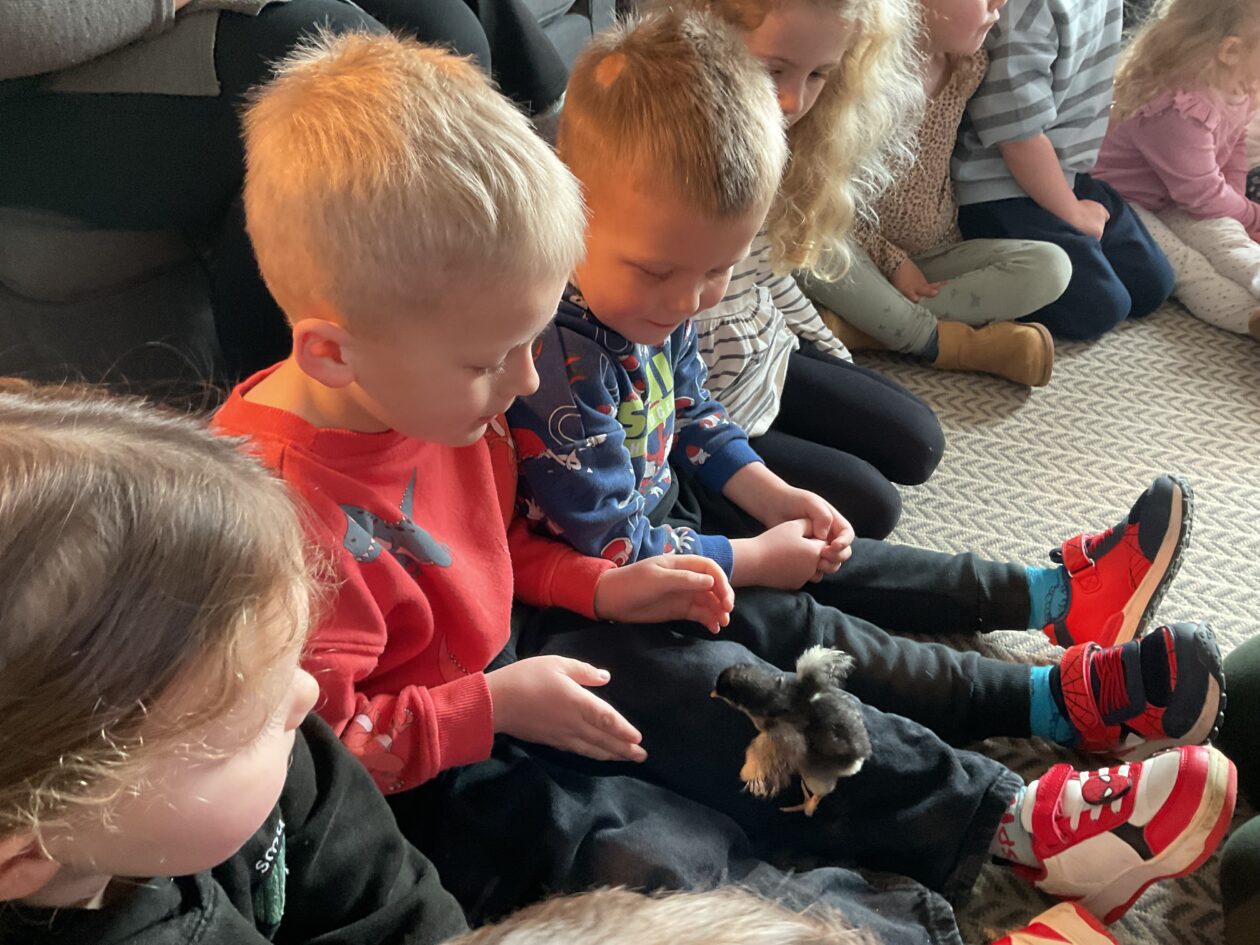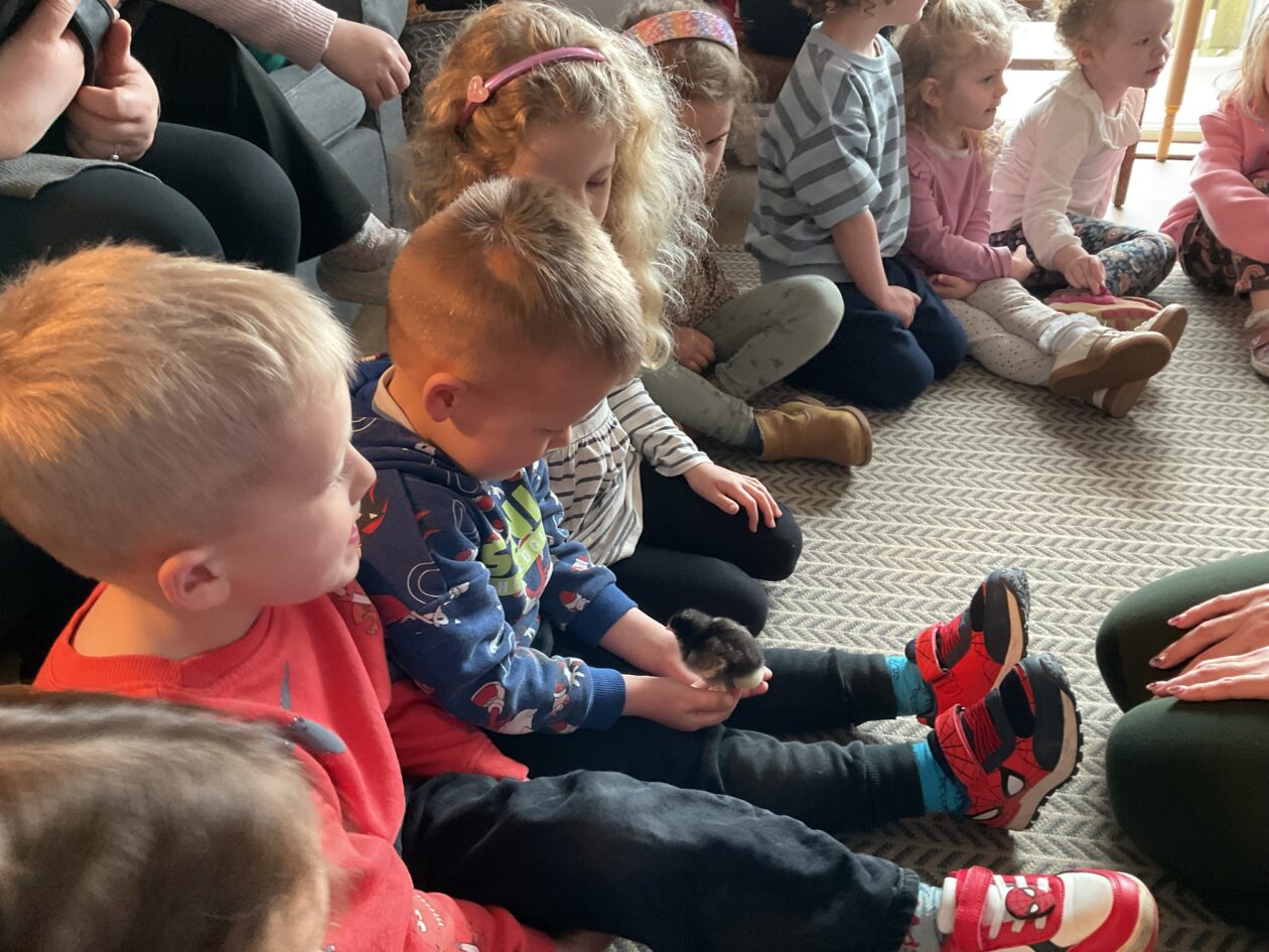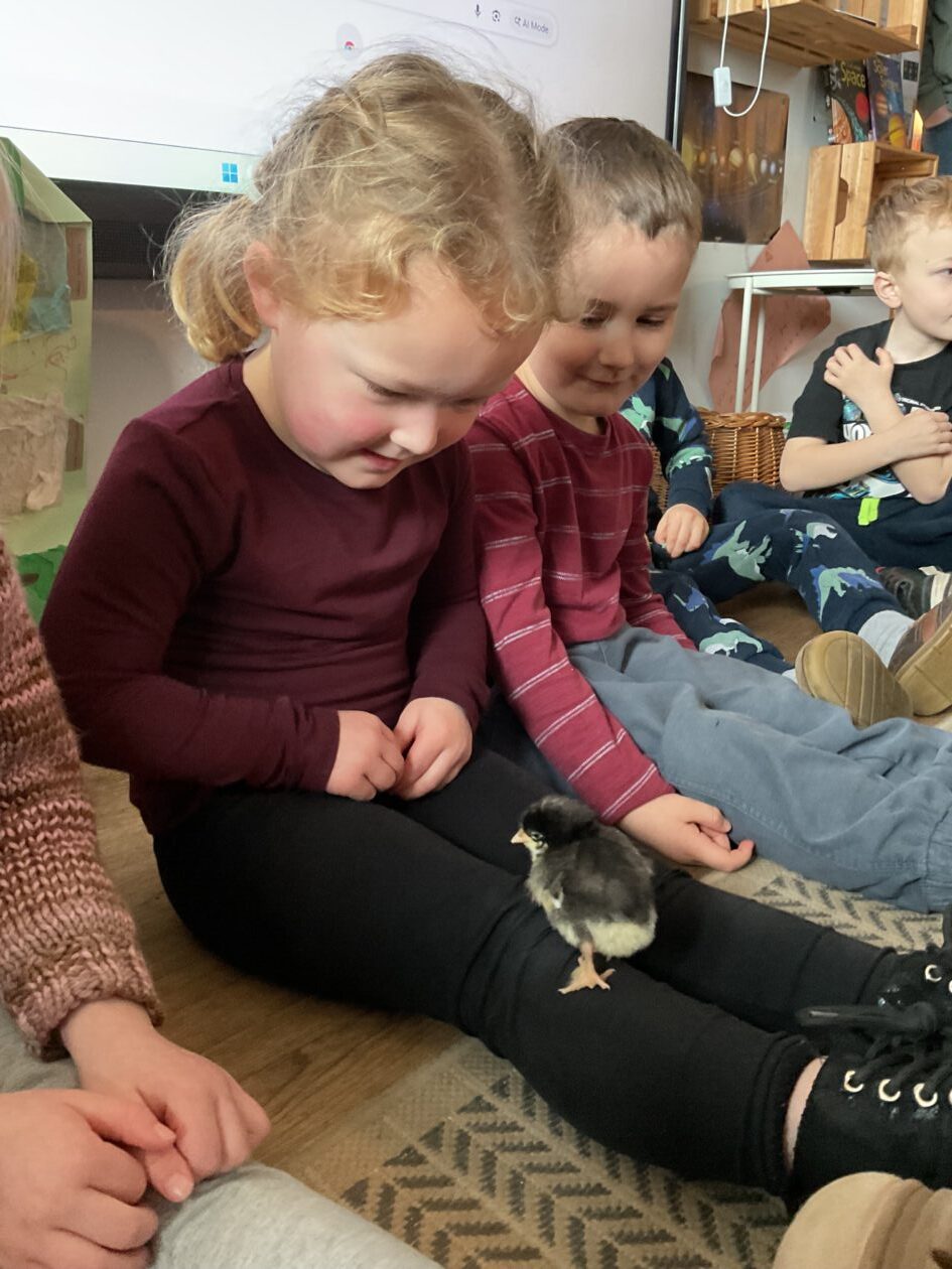 One of our families brought in their chicks from home, we heard about what they eat, drink, that they have to stay warm and we got to look at their new feathers growing on their wings. Those who wanted had a little cuddle with the chicks, being careful not to squeeze them. To help the chicks feel safe we used both hands to held them, one under their feet and one over their backs. We then all washed our hands afterwards. ‘They are sooo fluffy.’ ‘The feet tickles on my hand.’ ‘He might poop on me.’