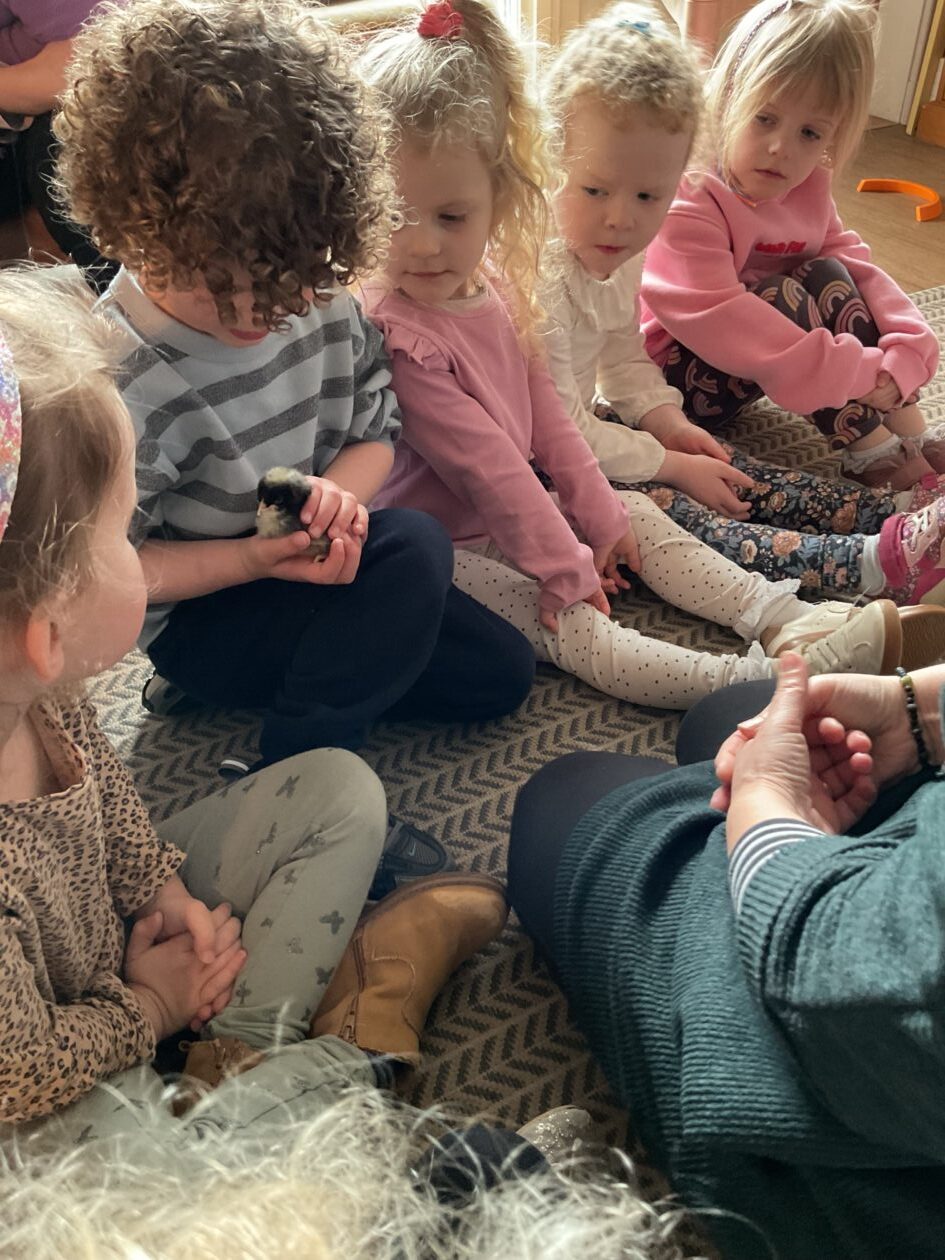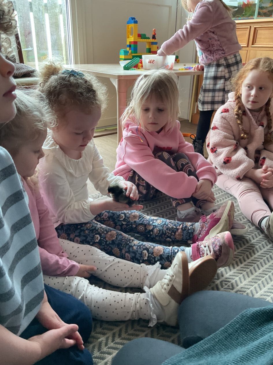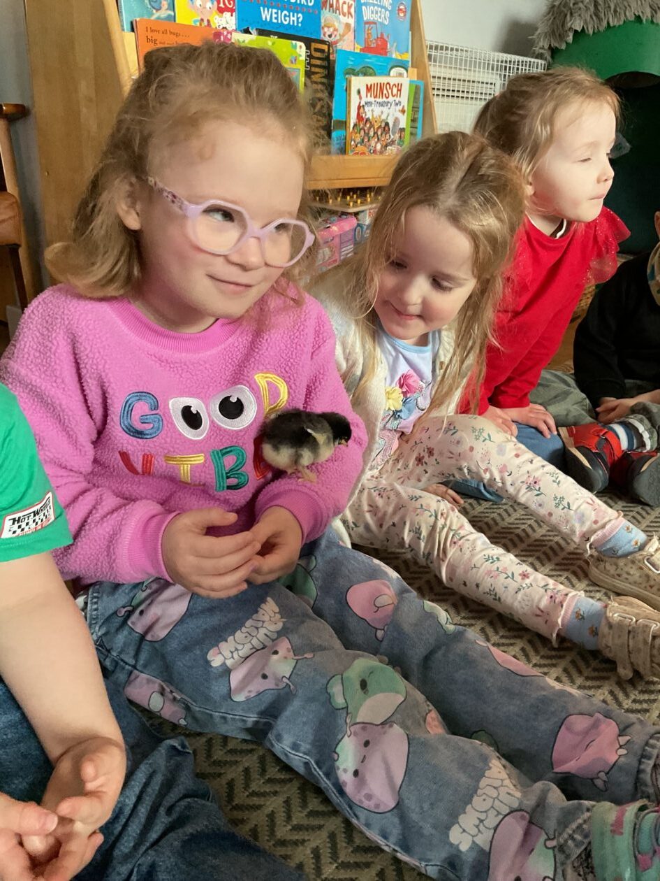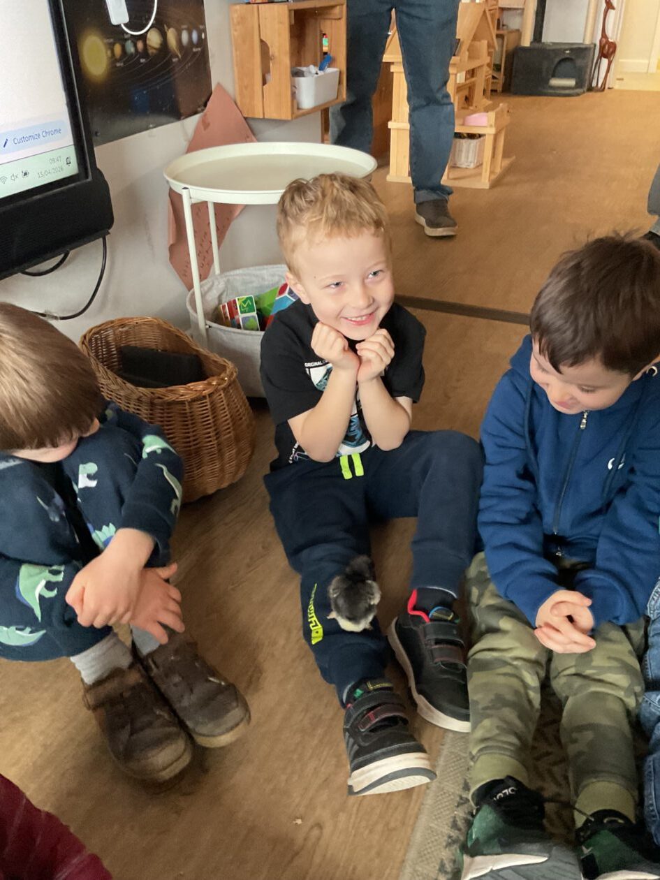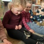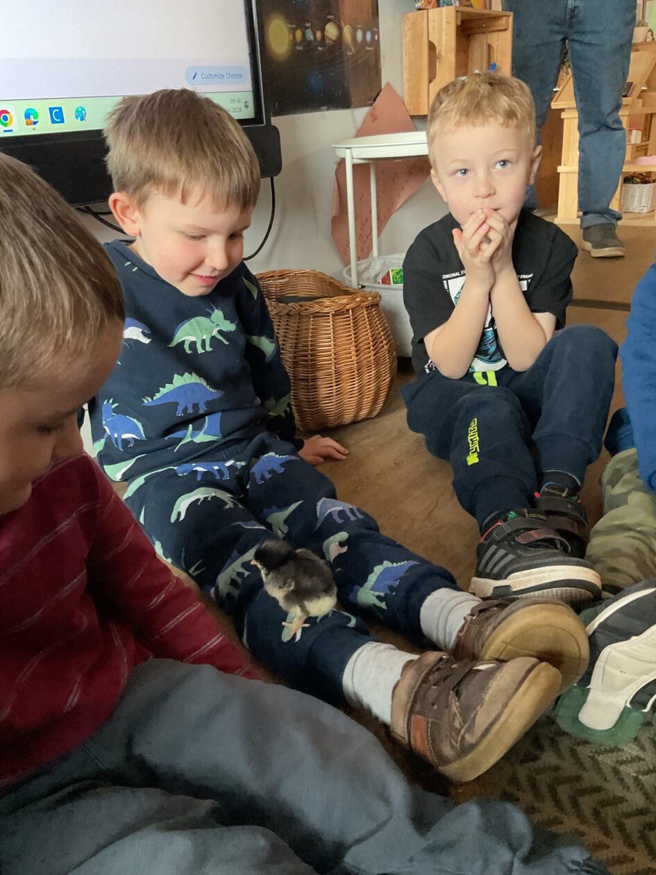 One of our families brought in their chicks from home, we heard about what they eat, drink, that they have to stay warm and we got to look at their new feathers growing on their wings. Those who wanted had a little cuddle with the chicks, being careful not to squeeze them. To help the chicks feel safe we used both hands to held them, one under their feet and one over their backs. We then all washed our hands afterwards. ‘They are sooo fluffy.’ ‘The feet tickles on my hand.’ ‘He might poop on me.’
