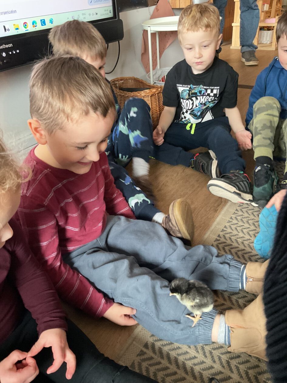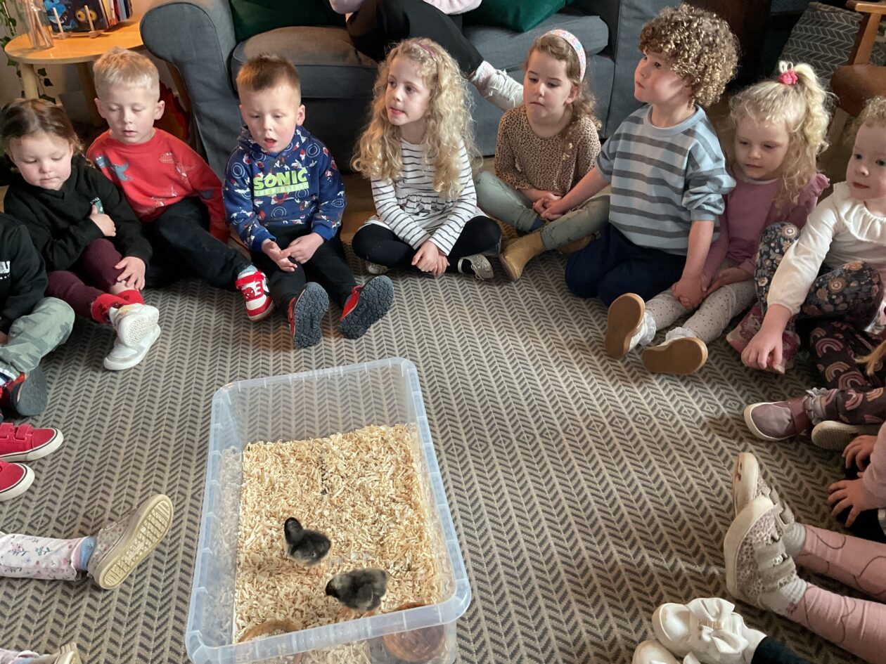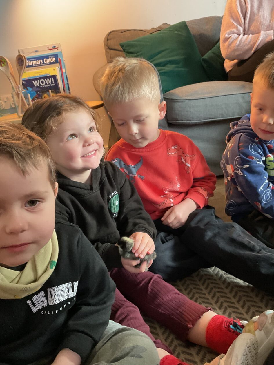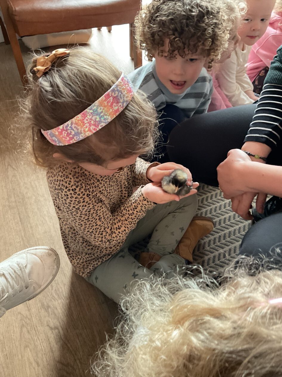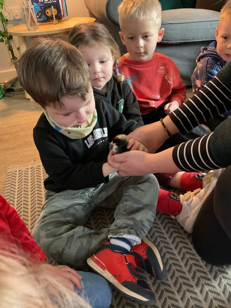 One of our families brought in their chicks from home, we heard about what they eat, drink, that they have to stay warm and we got to look at their new feathers growing on their wings. Those who wanted had a little cuddle with the chicks, being careful not to squeeze them. To help the chicks feel safe we used both hands to held them, one under their feet and one over their backs. We then all washed our hands afterwards. ‘They are sooo fluffy.’ ‘The feet tickles on my hand.’ ‘He might poop on me.’