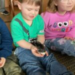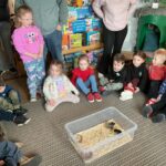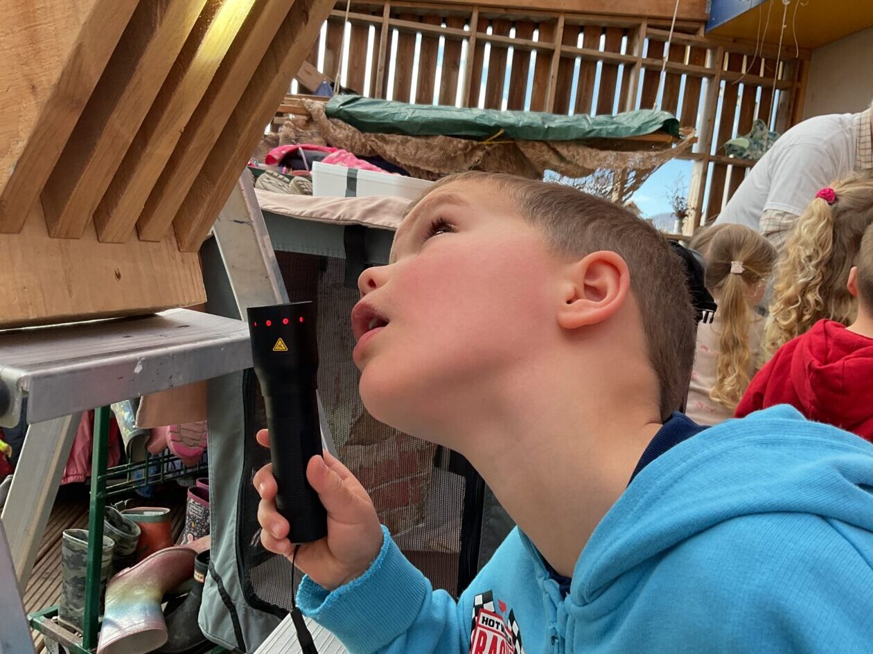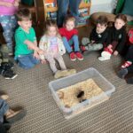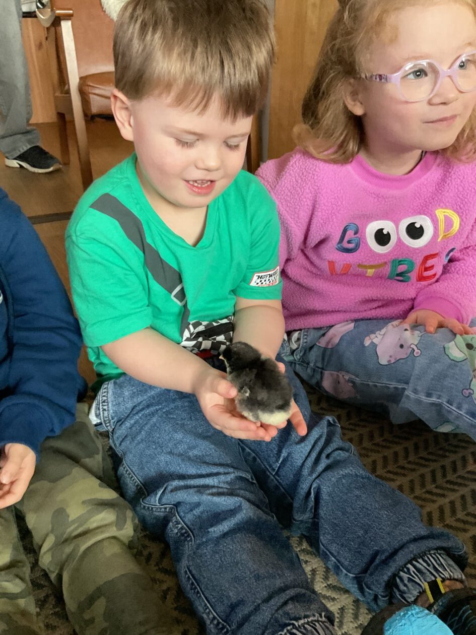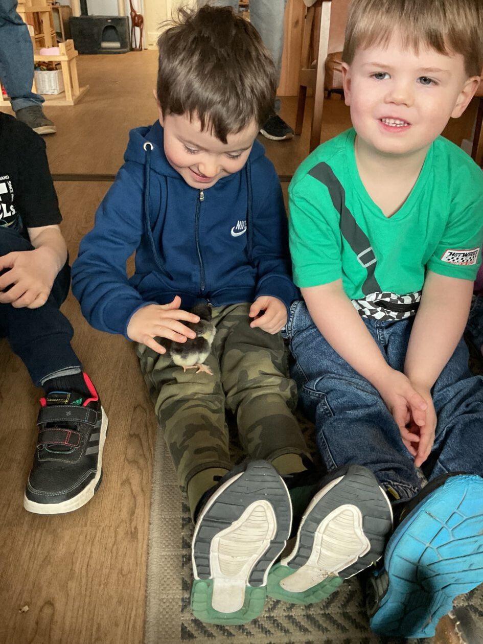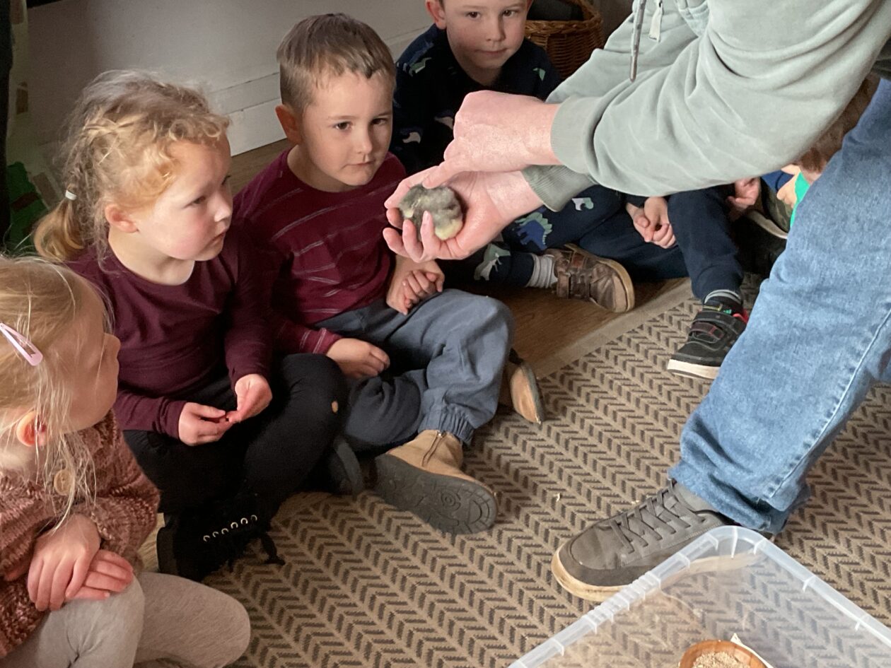 One of our families brought in their chicks from home, we heard about what they eat, drink, that they have to stay warm and we got to look at their new feathers growing on their wings. Those who wanted had a little cuddle with the chicks, being careful not to squeeze them. To help the chicks feel safe we used both hands to held them, one under their feet and one over their backs. We then all washed our hands afterwards. ‘They are sooo fluffy.’ ‘The feet tickles on my hand.’ ‘He might poop on me.’