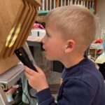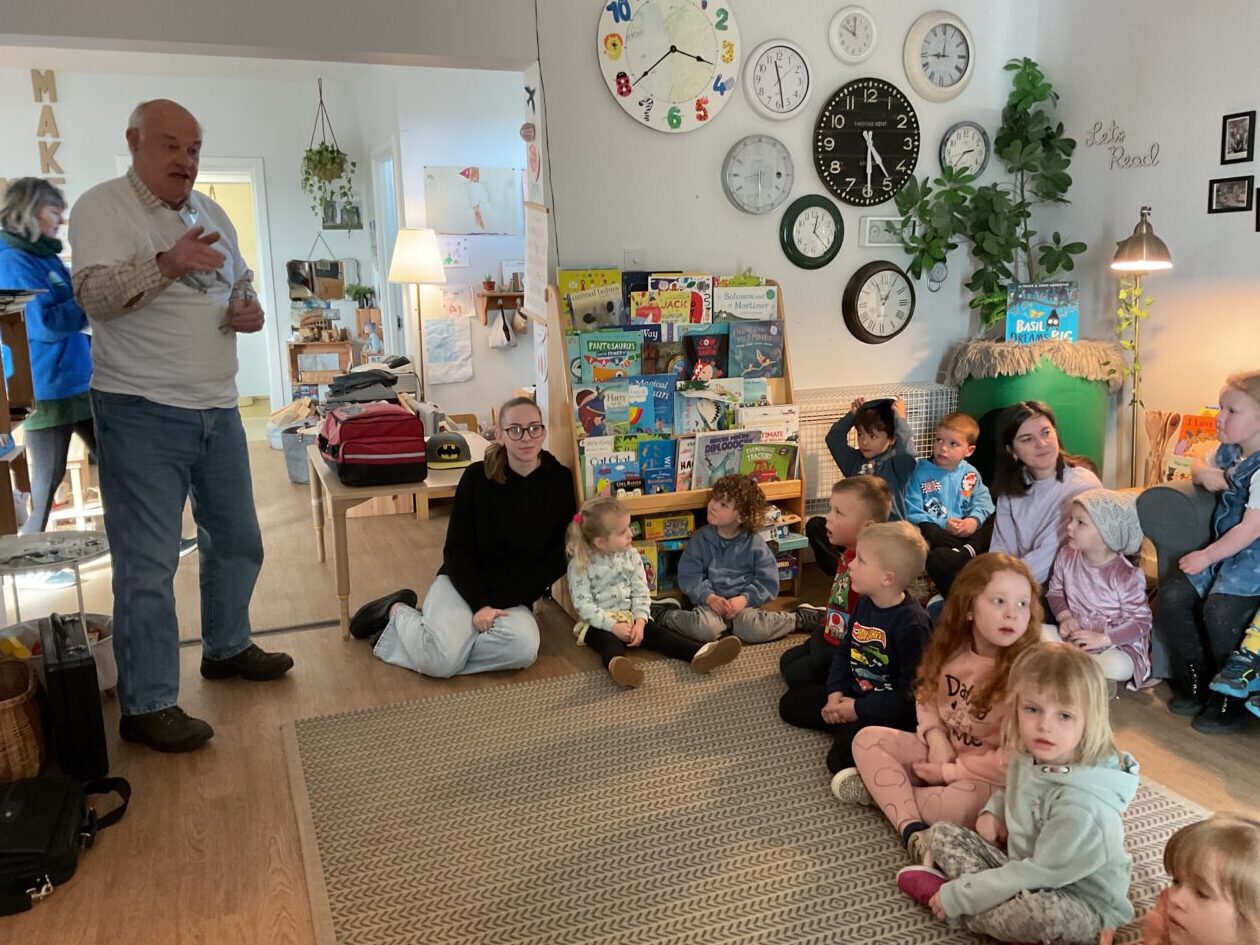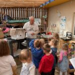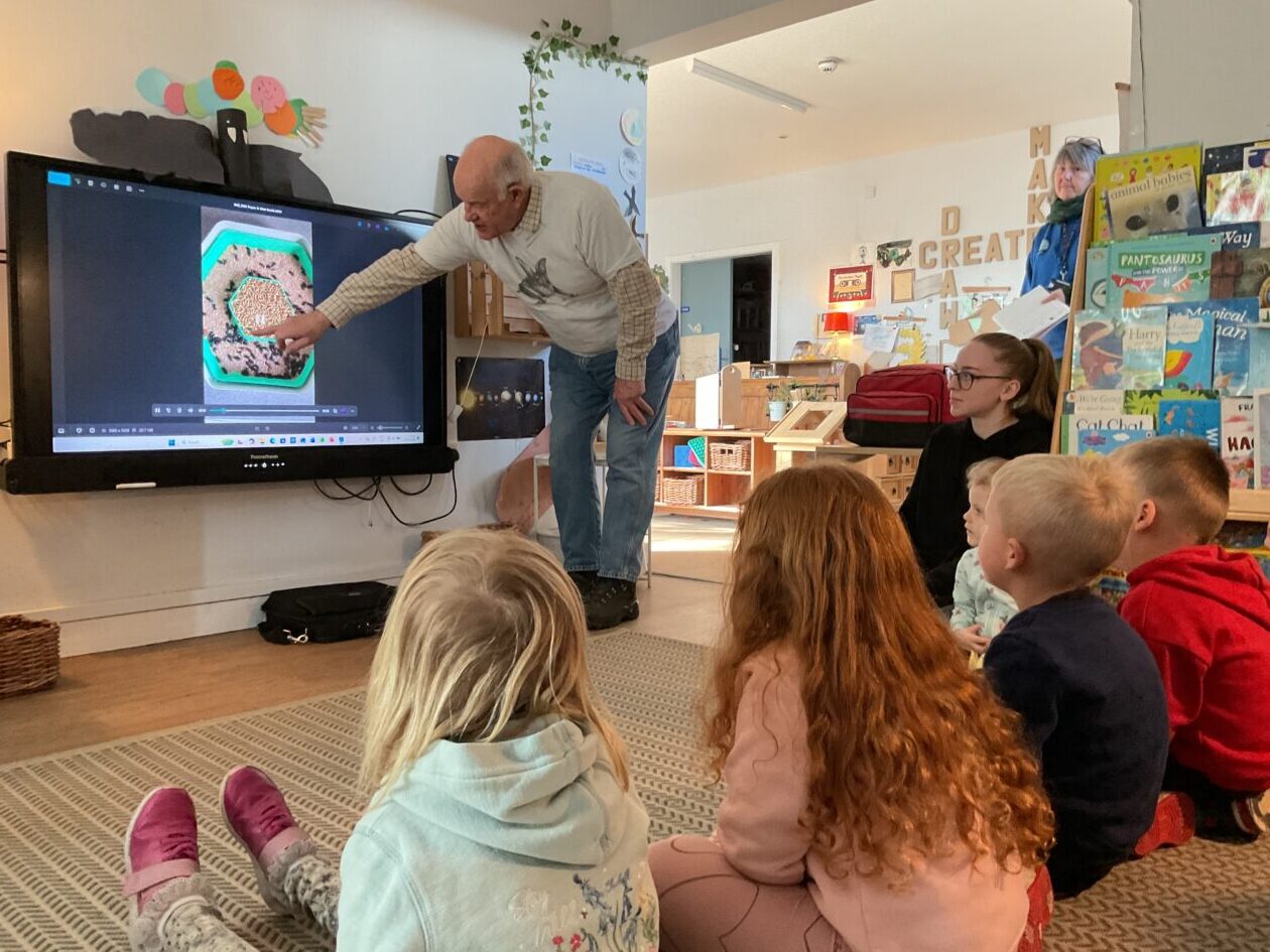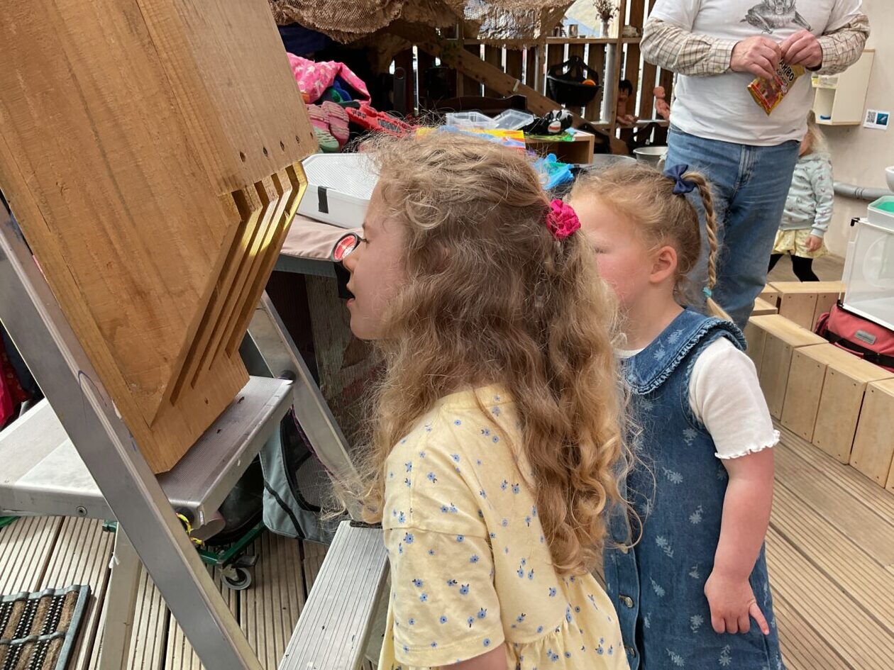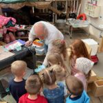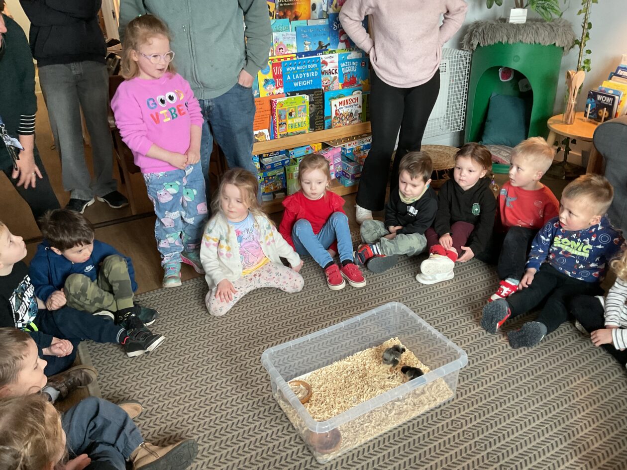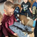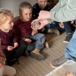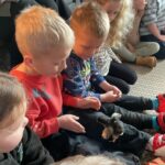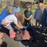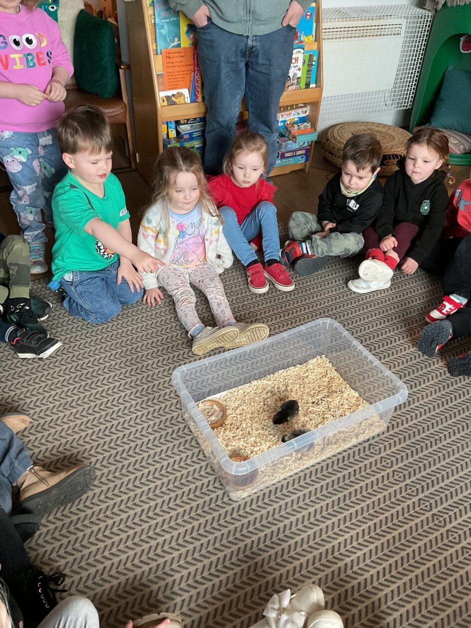 One of our families brought in their chicks from home, we heard about what they eat, drink, that they have to stay warm and we got to look at their new feathers growing on their wings. Those who wanted had a little cuddle with the chicks, being careful not to squeeze them. To help the chicks feel safe we used both hands to held them, one under their feet and one over their backs. We then all washed our hands afterwards. ‘They are sooo fluffy.’ ‘The feet tickles on my hand.’ ‘He might poop on me.’