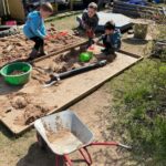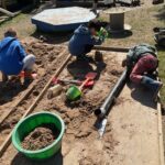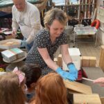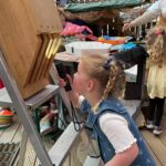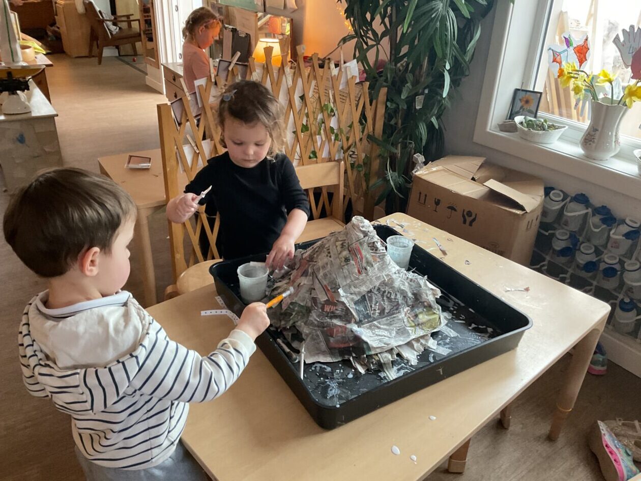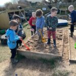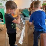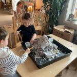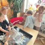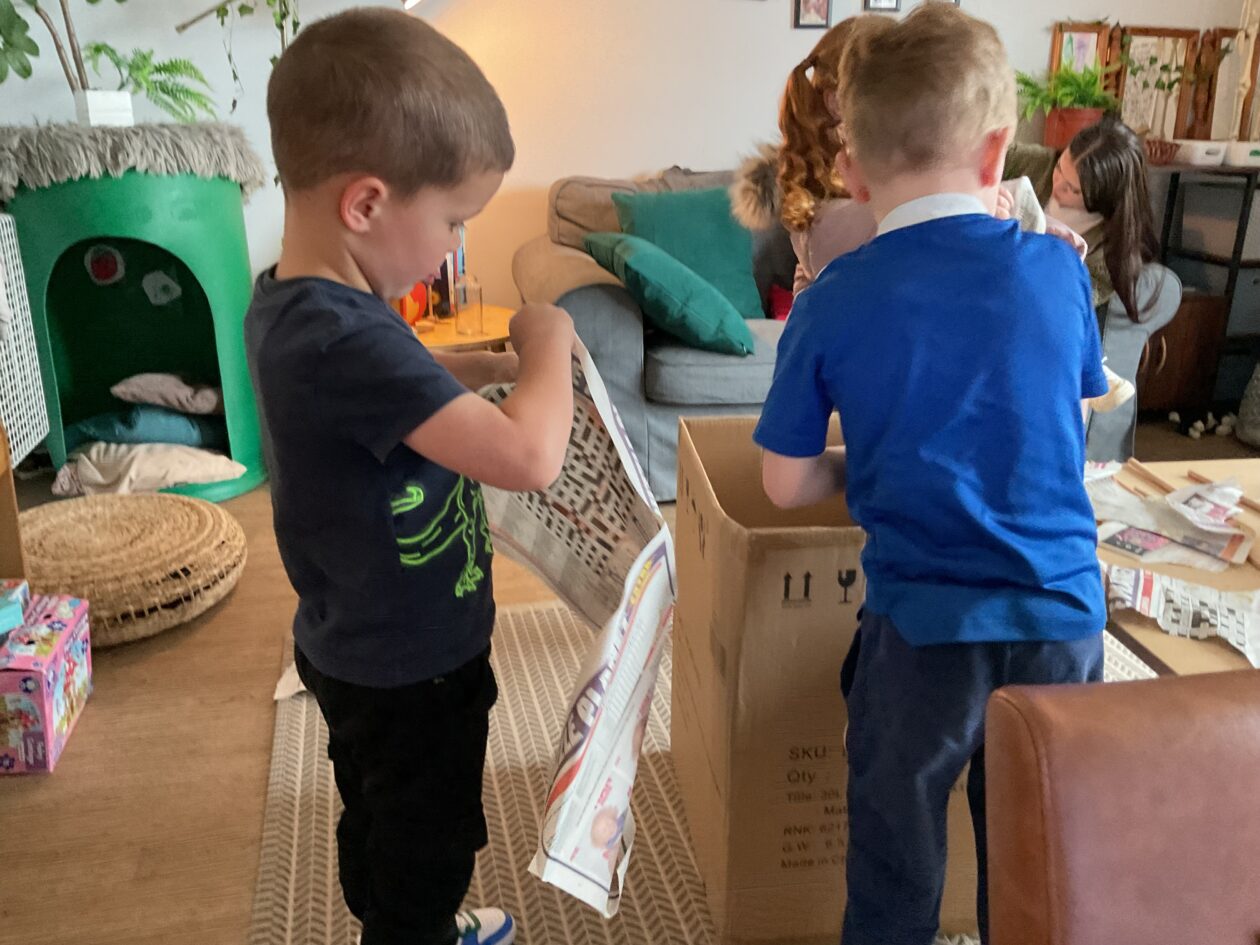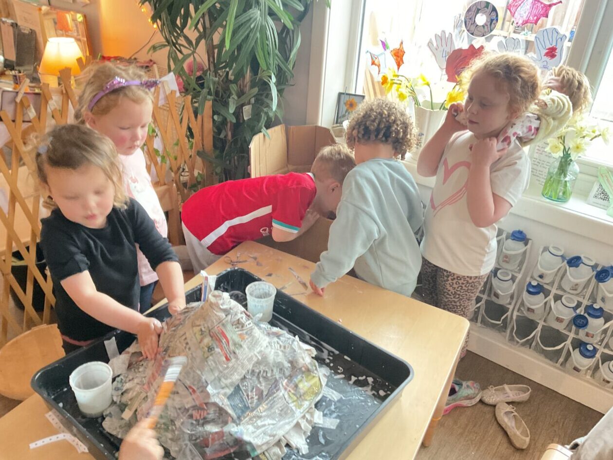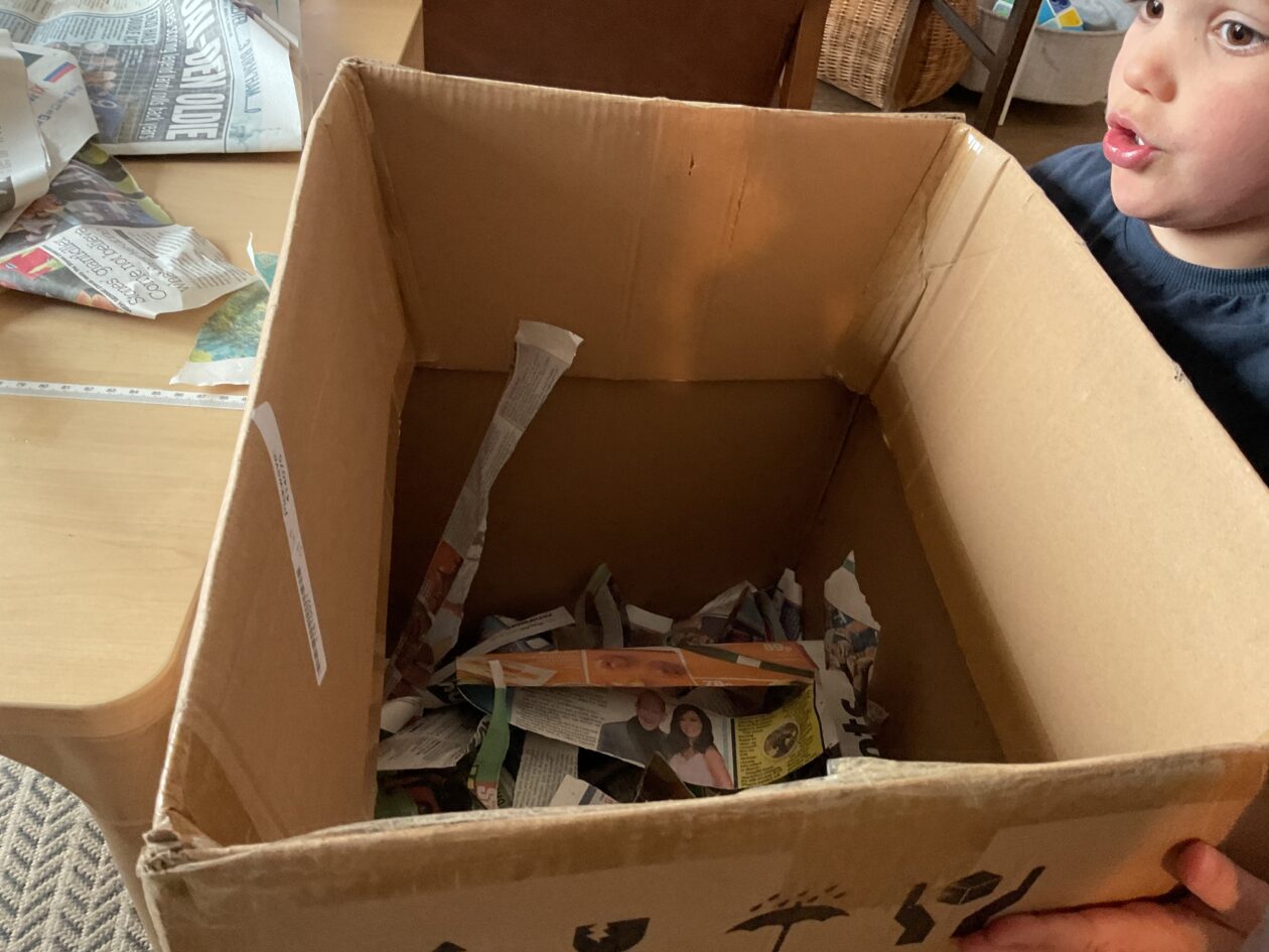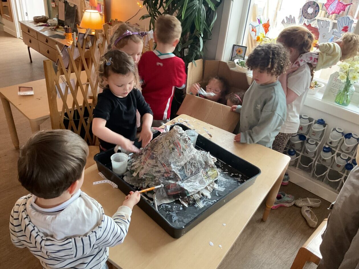 Working together on the volcano offers STEM learning, social development, and sensory exploration in one engaging project. Problem solving, to decide on the shape. ‘It needs to be pointy at da top.’ ‘And da bottom is bigger.’ ‘Dats lik a triangle, isn it.’ The volcano will hopefully be erupting next week.
