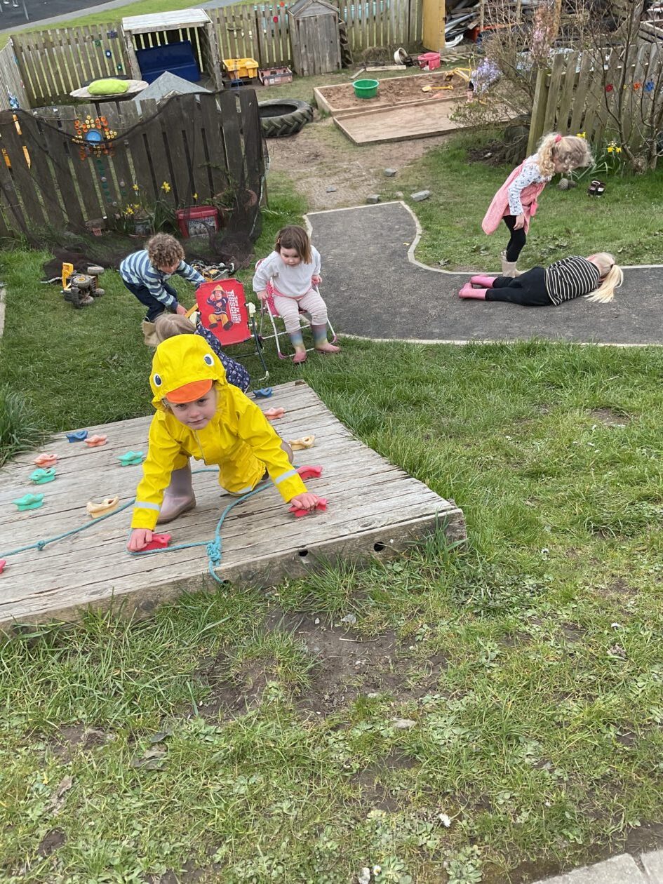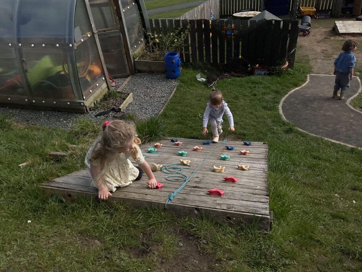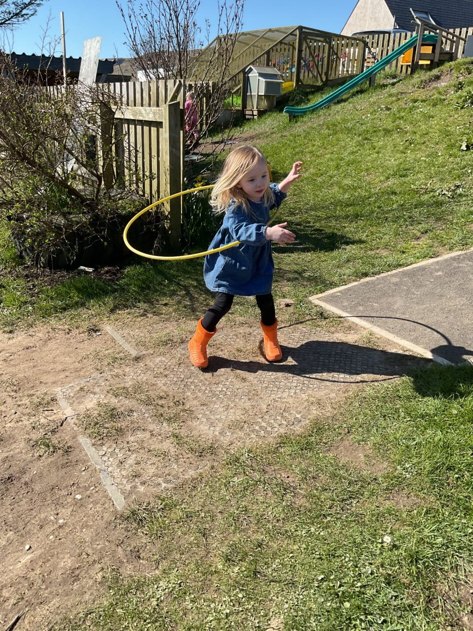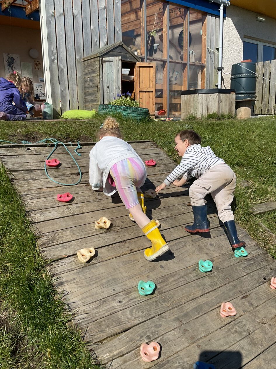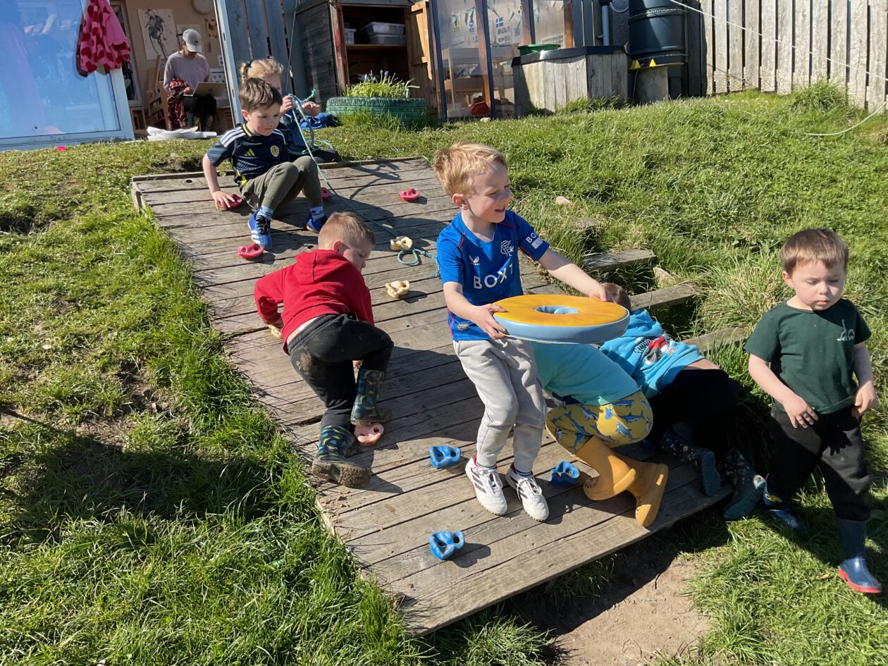 The bairns have been engaged for extended periods of outdoor play this week.  They have been creative with chalk and paint, travelled very fast down the slide, chased each other during role play, had a tea party, practiced using hula hoops and dug in the topped-up sand pit.  They share ideas and the play evolves over time.  There has been a lot of fishing boat construction using the large hollow blocks in the outdoor room.  This week, the bairns used the outdoor climbing wall as the side of a boat, saving people who had fallen into the ocean.