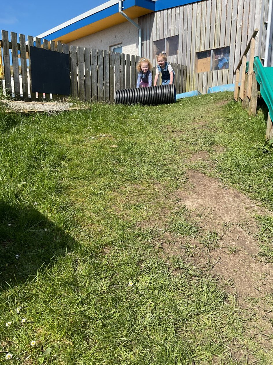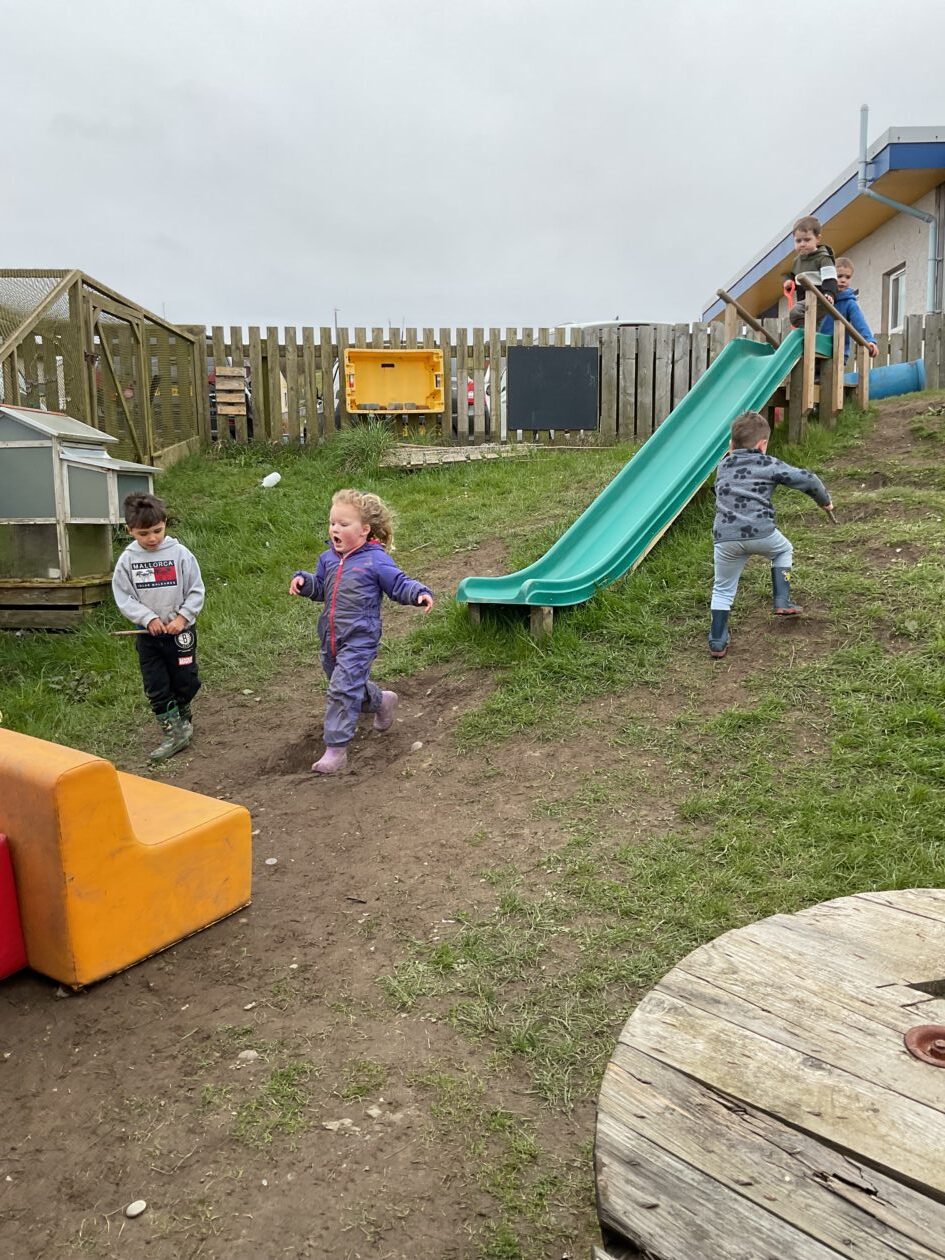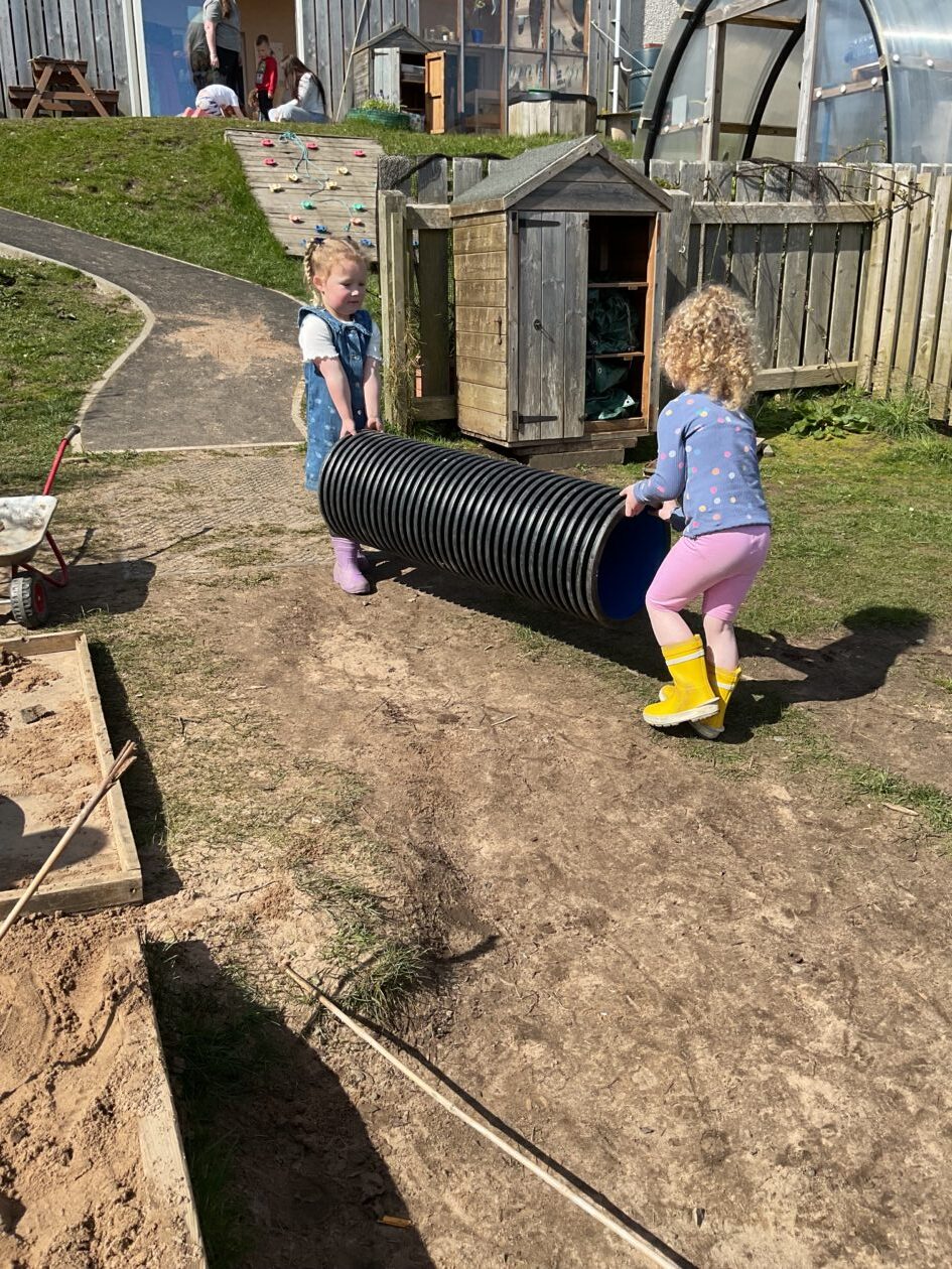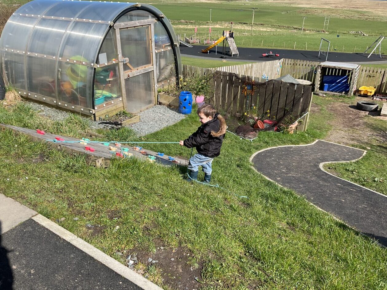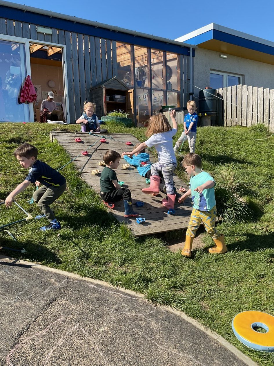 The bairns have been engaged for extended periods of outdoor play this week.  They have been creative with chalk and paint, travelled very fast down the slide, chased each other during role play, had a tea party, practiced using hula hoops and dug in the topped-up sand pit.  They share ideas and the play evolves over time.  There has been a lot of fishing boat construction using the large hollow blocks in the outdoor room.  This week, the bairns used the outdoor climbing wall as the side of a boat, saving people who had fallen into the ocean.