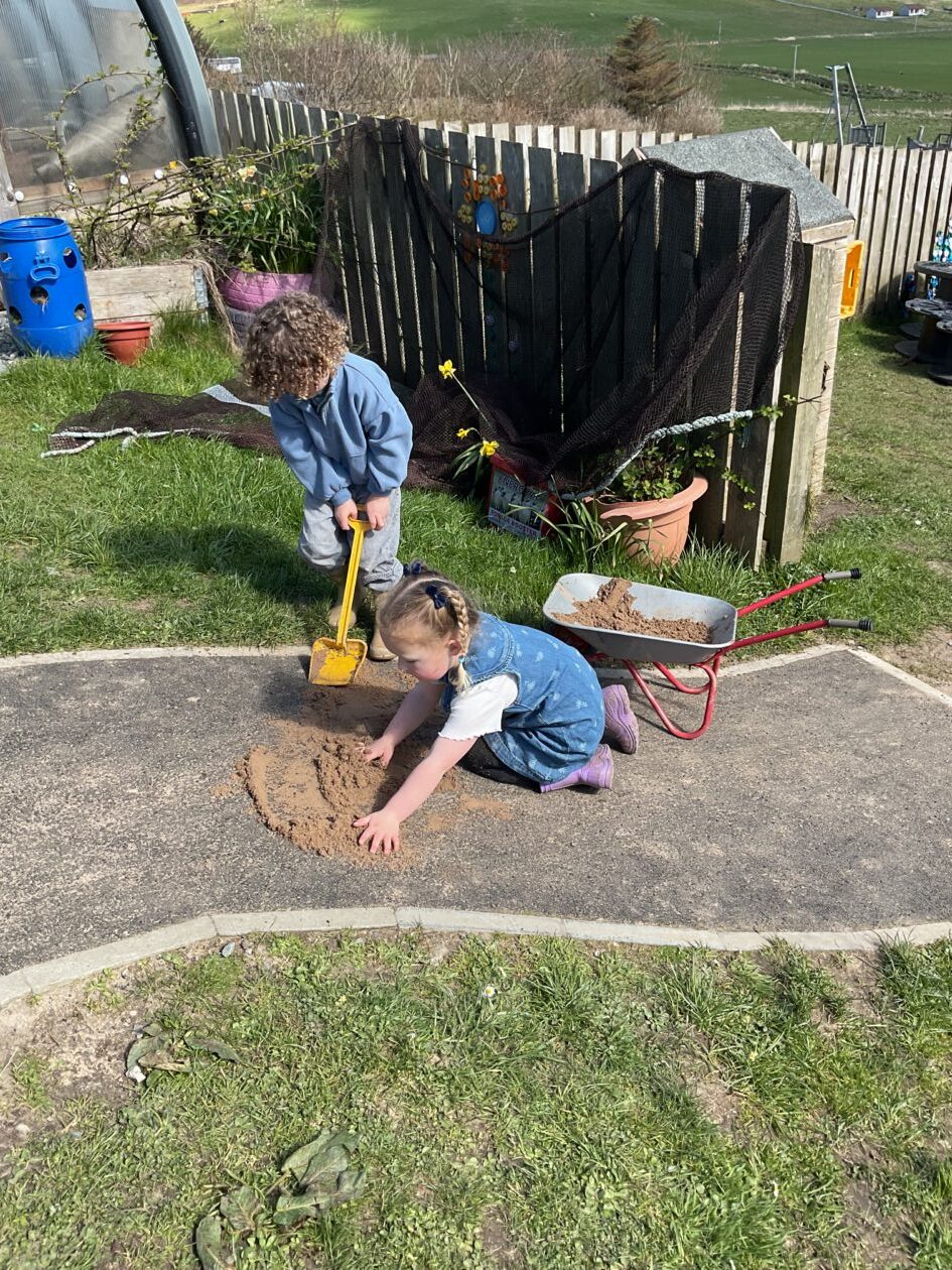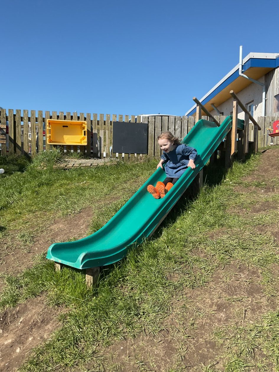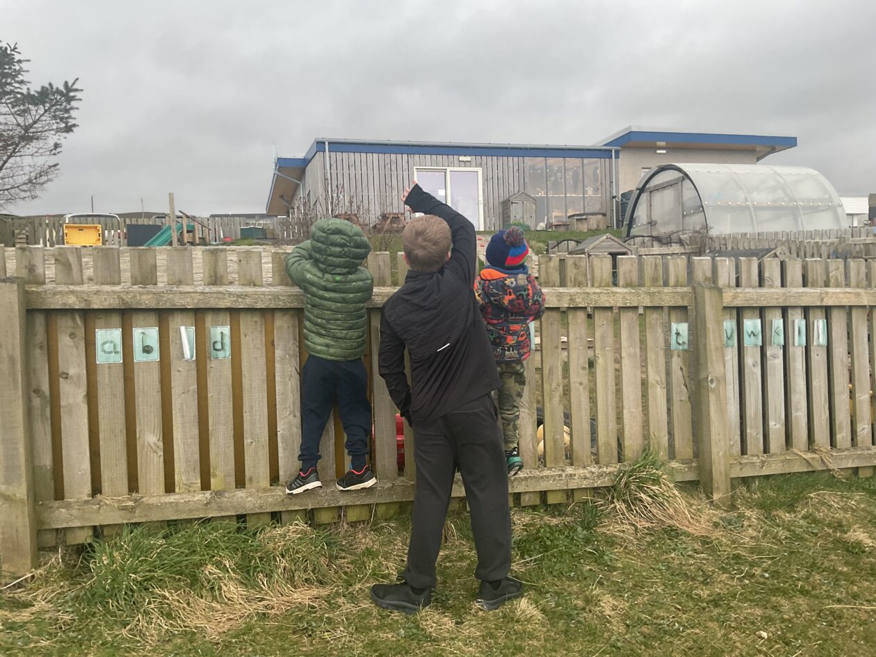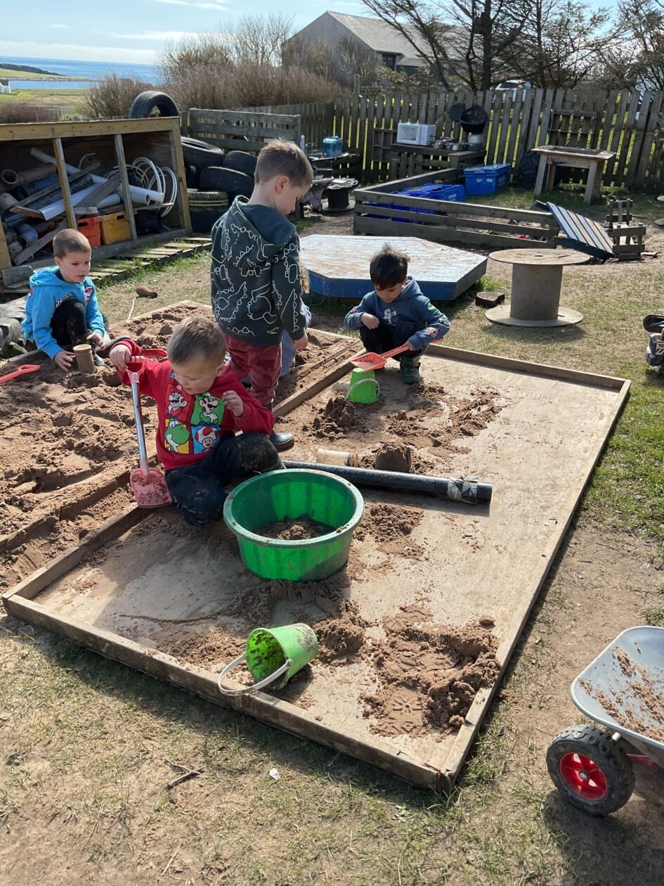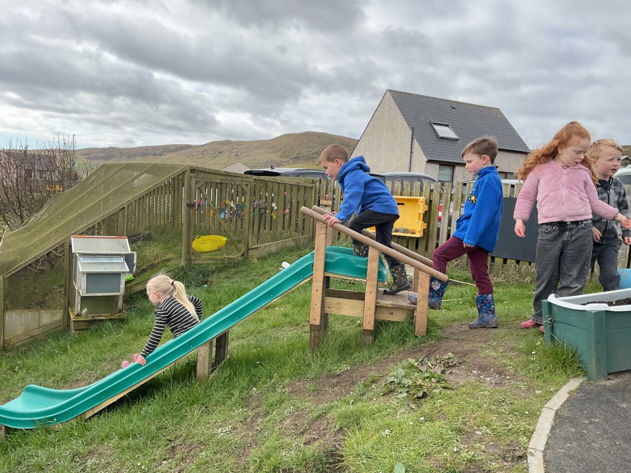 The bairns have been engaged for extended periods of outdoor play this week.  They have been creative with chalk and paint, travelled very fast down the slide, chased each other during role play, had a tea party, practiced using hula hoops and dug in the topped-up sand pit.  They share ideas and the play evolves over time.  There has been a lot of fishing boat construction using the large hollow blocks in the outdoor room.  This week, the bairns used the outdoor climbing wall as the side of a boat, saving people who had fallen into the ocean.