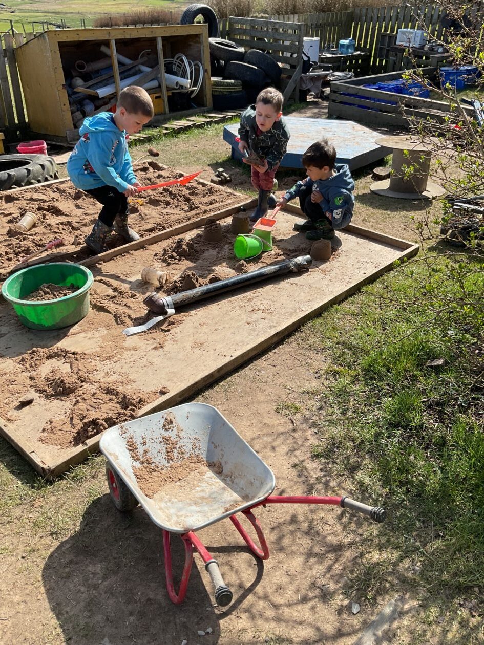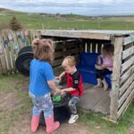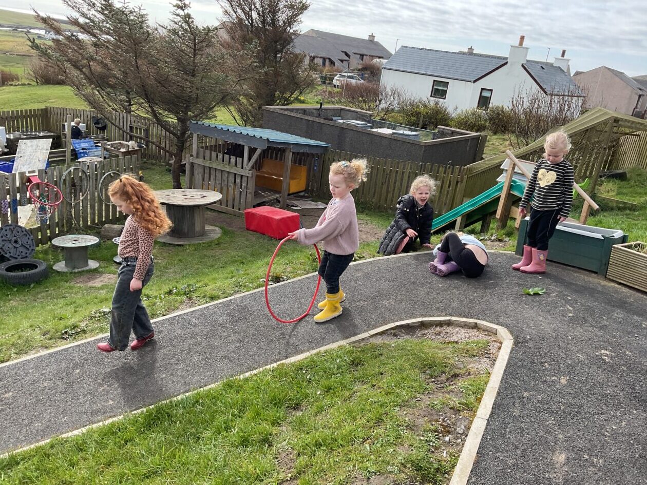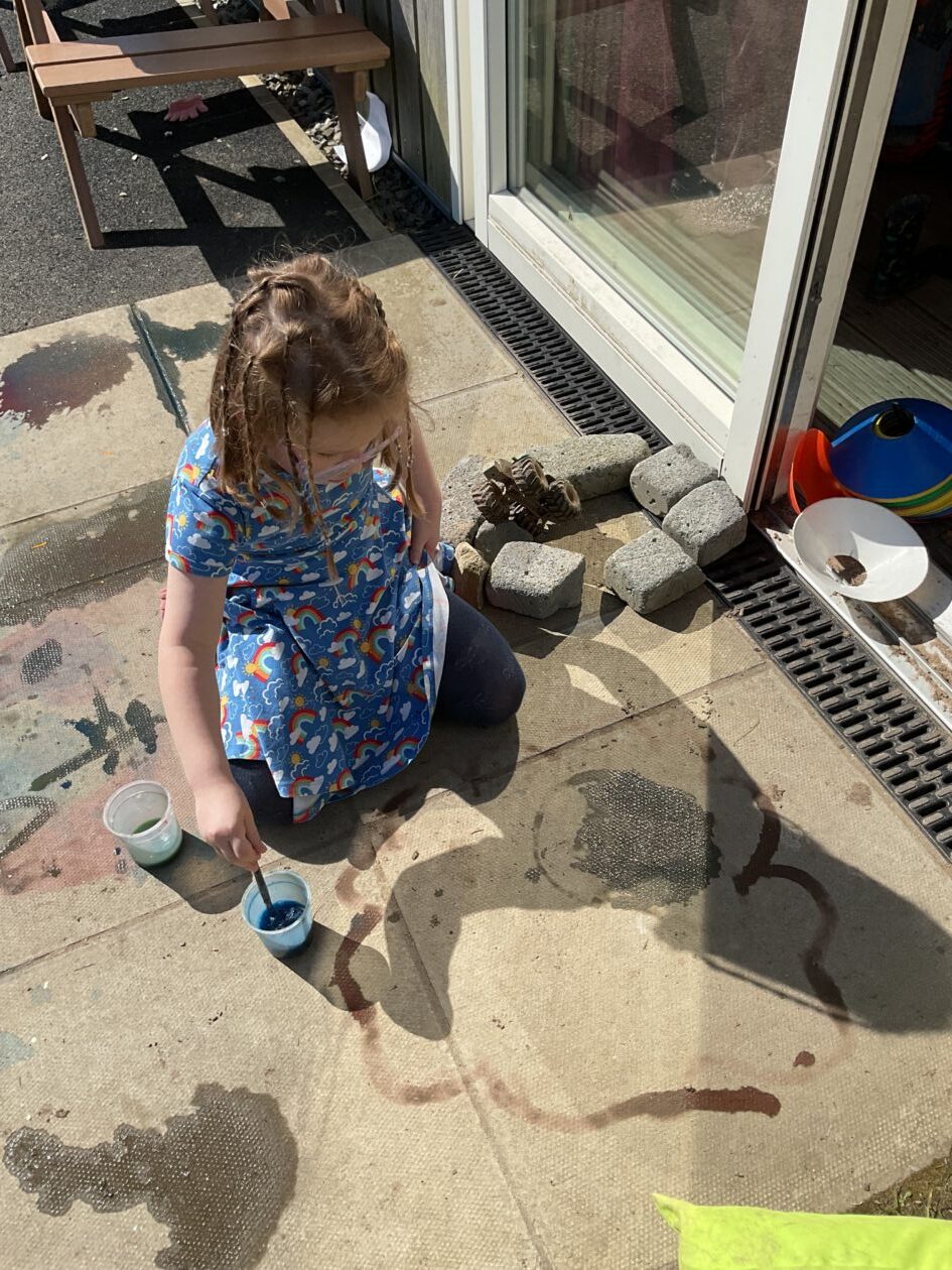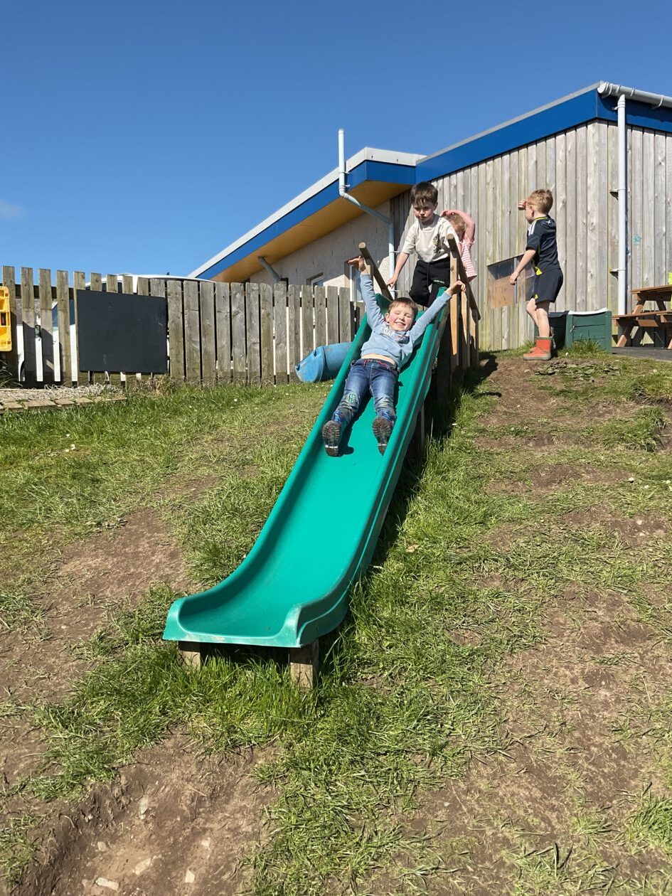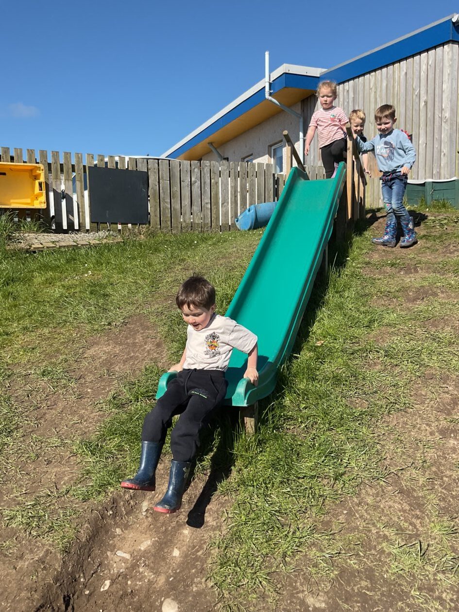 The bairns have been engaged for extended periods of outdoor play this week.  They have been creative with chalk and paint, travelled very fast down the slide, chased each other during role play, had a tea party, practiced using hula hoops and dug in the topped-up sand pit.  They share ideas and the play evolves over time.  There has been a lot of fishing boat construction using the large hollow blocks in the outdoor room.  This week, the bairns used the outdoor climbing wall as the side of a boat, saving people who had fallen into the ocean.