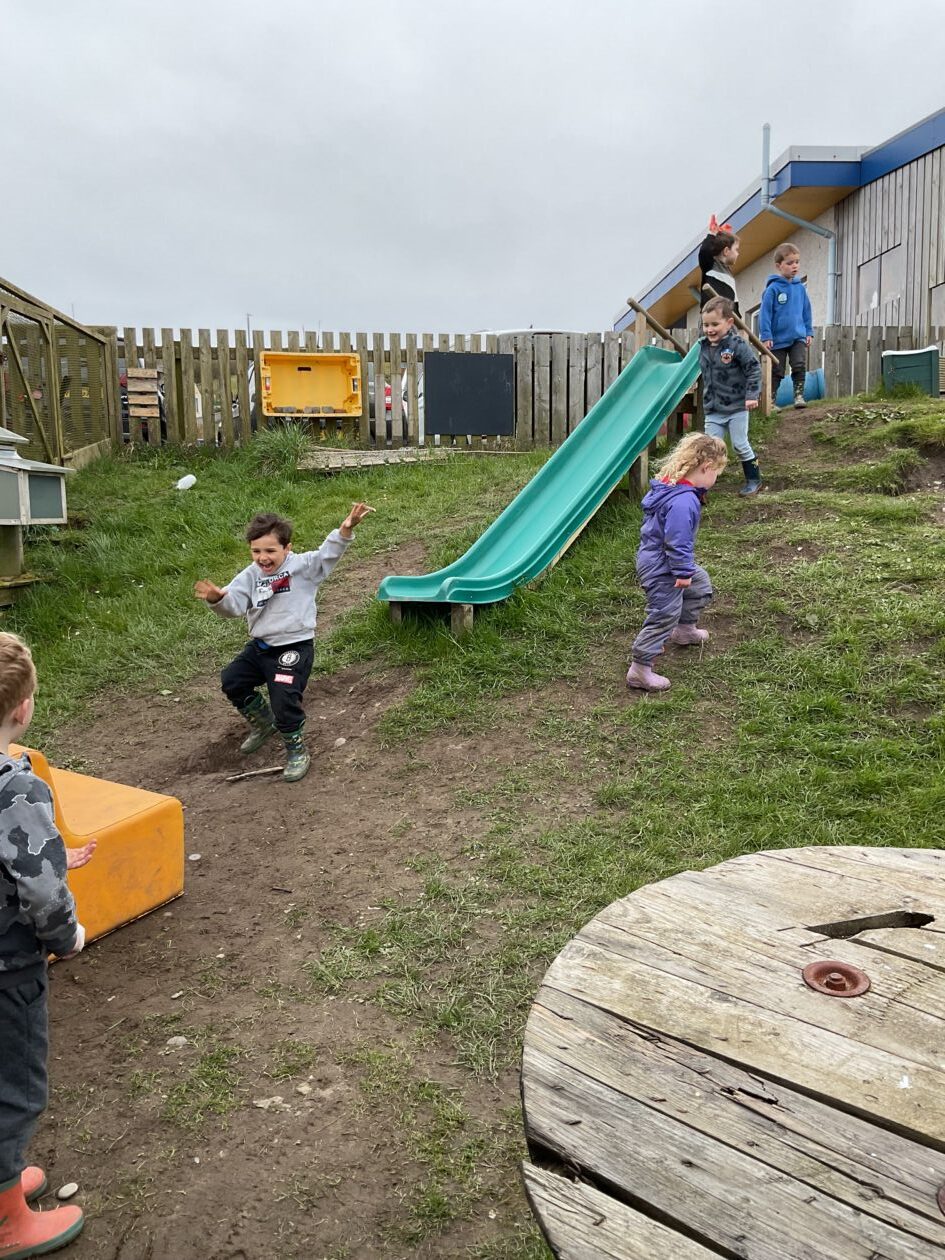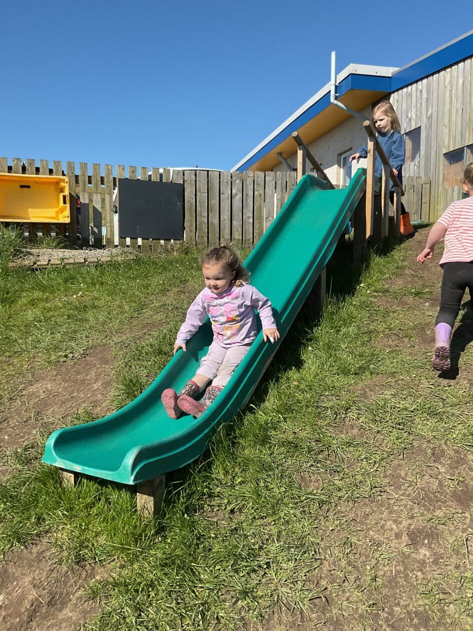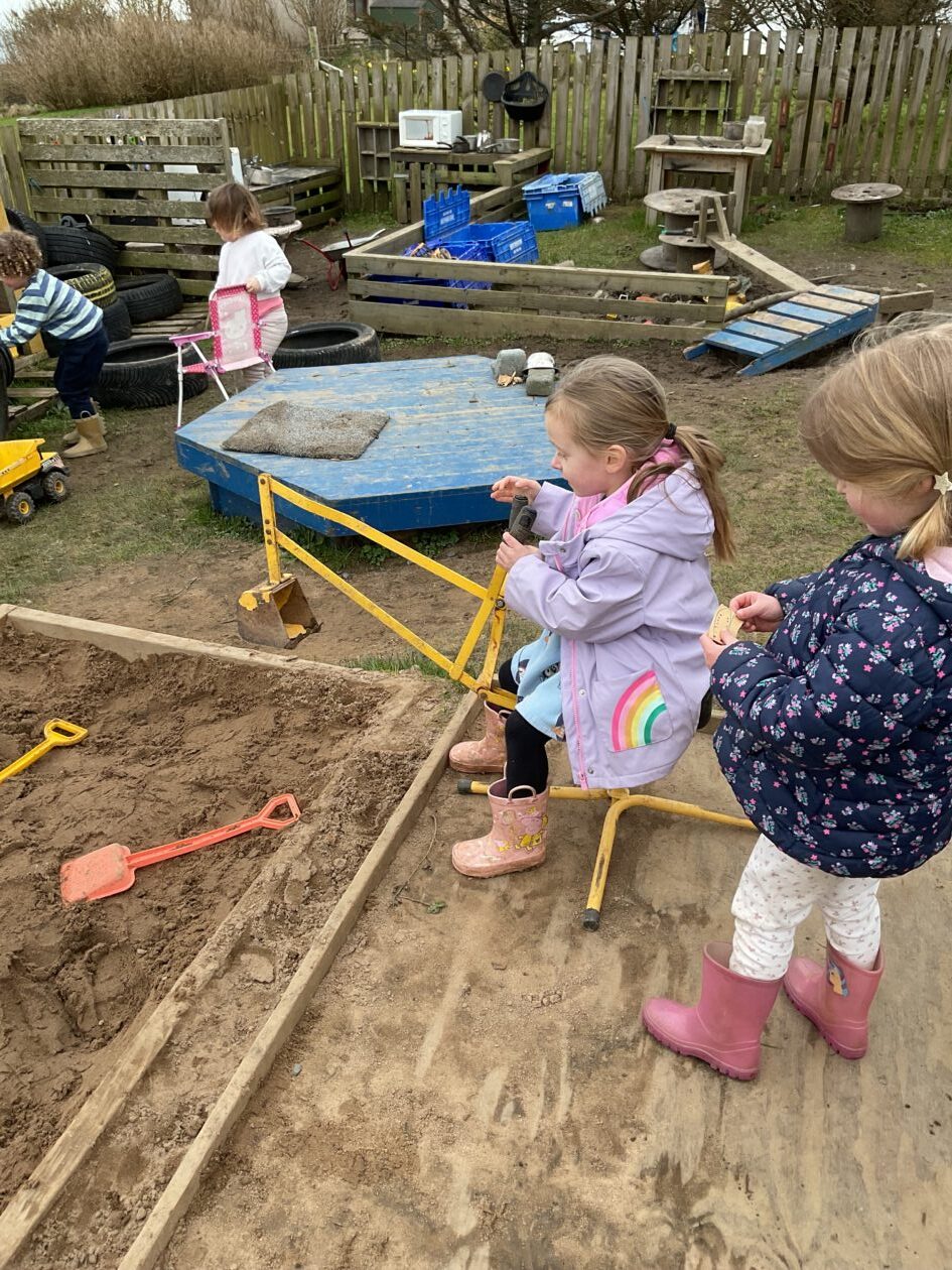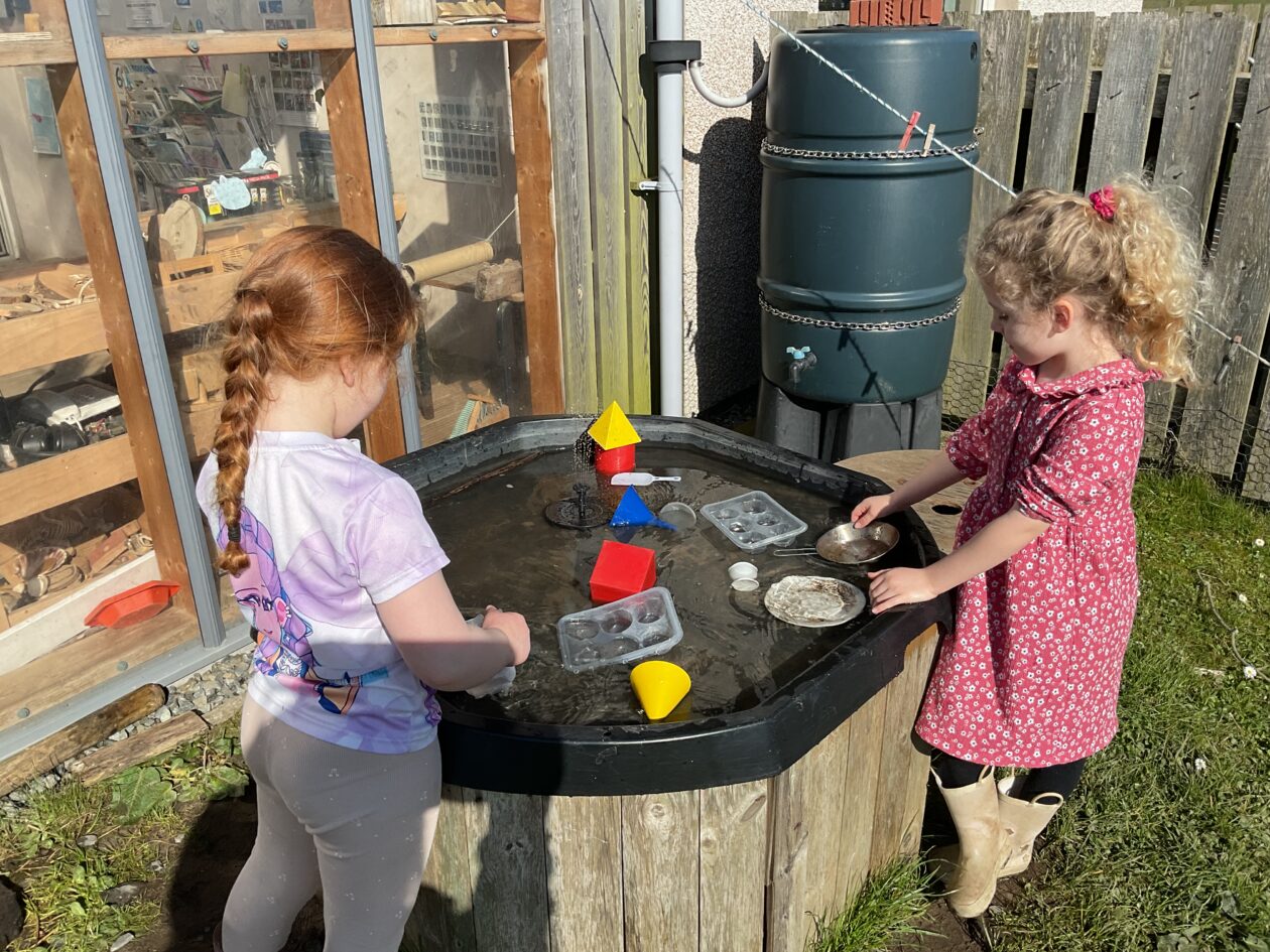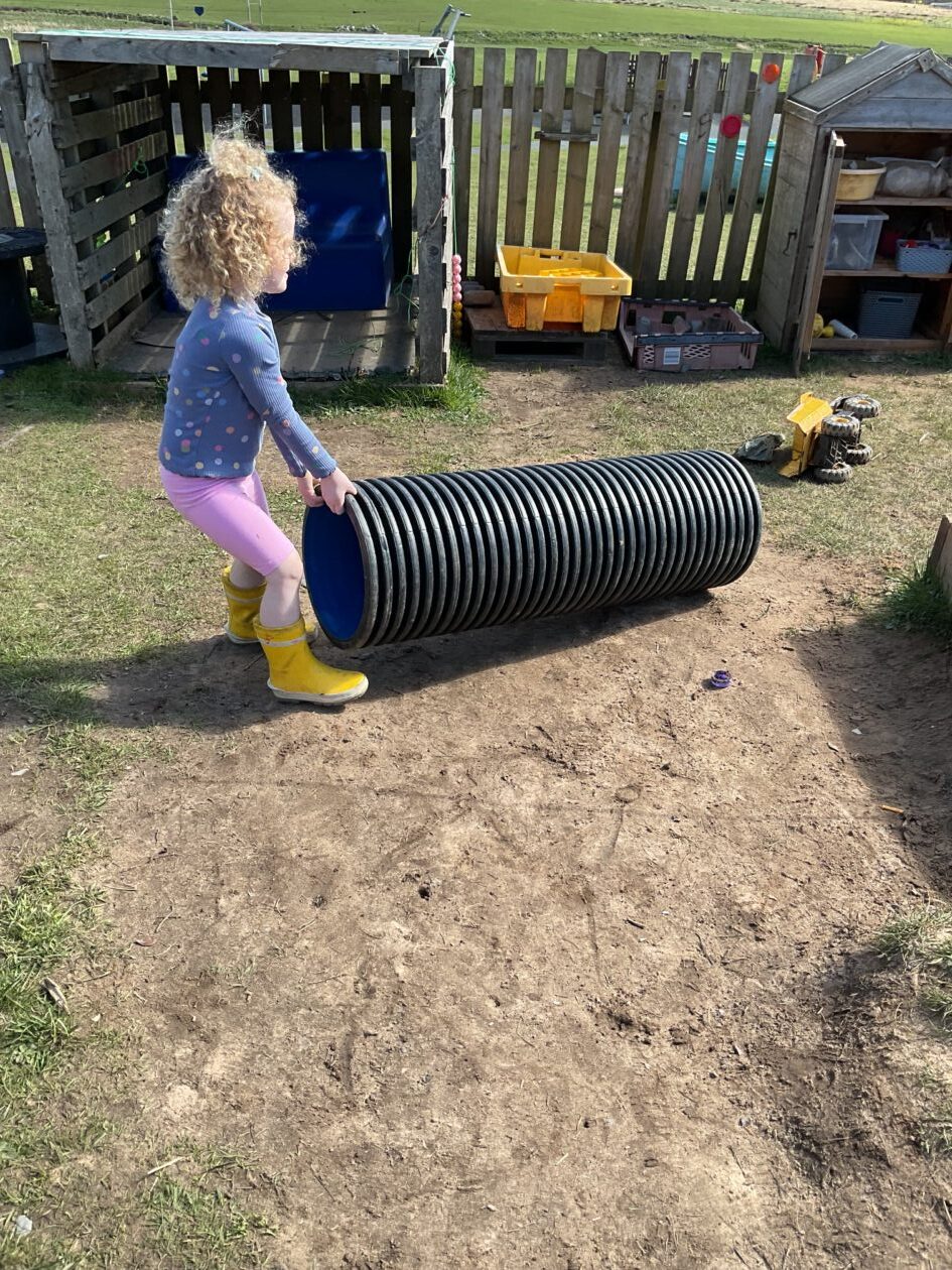 The bairns have been engaged for extended periods of outdoor play this week.  They have been creative with chalk and paint, travelled very fast down the slide, chased each other during role play, had a tea party, practiced using hula hoops and dug in the topped-up sand pit.  They share ideas and the play evolves over time.  There has been a lot of fishing boat construction using the large hollow blocks in the outdoor room.  This week, the bairns used the outdoor climbing wall as the side of a boat, saving people who had fallen into the ocean.