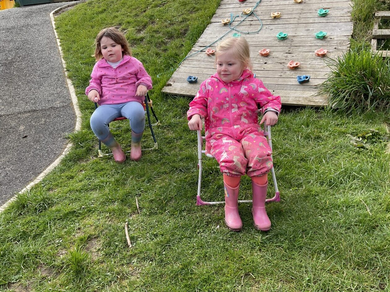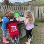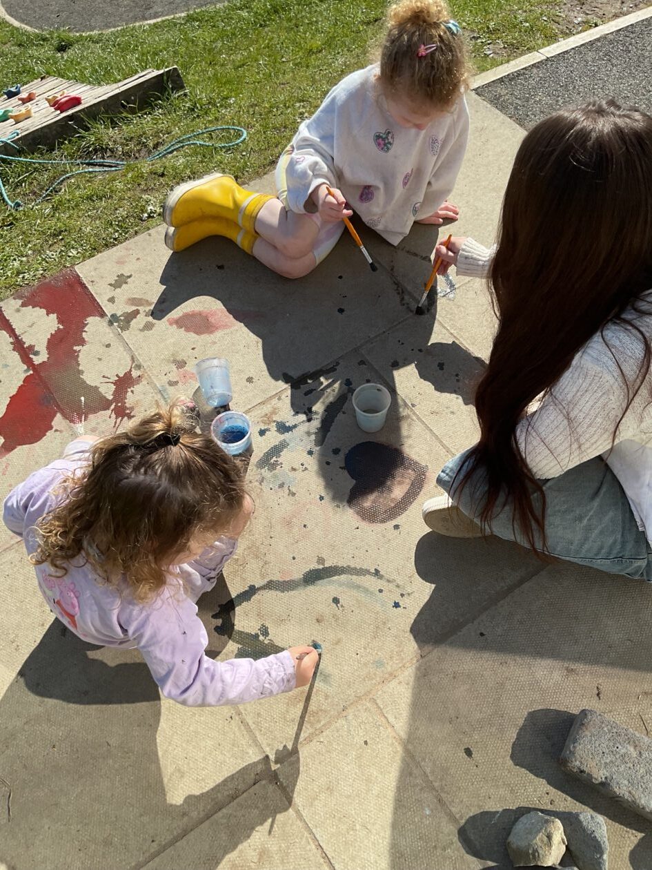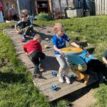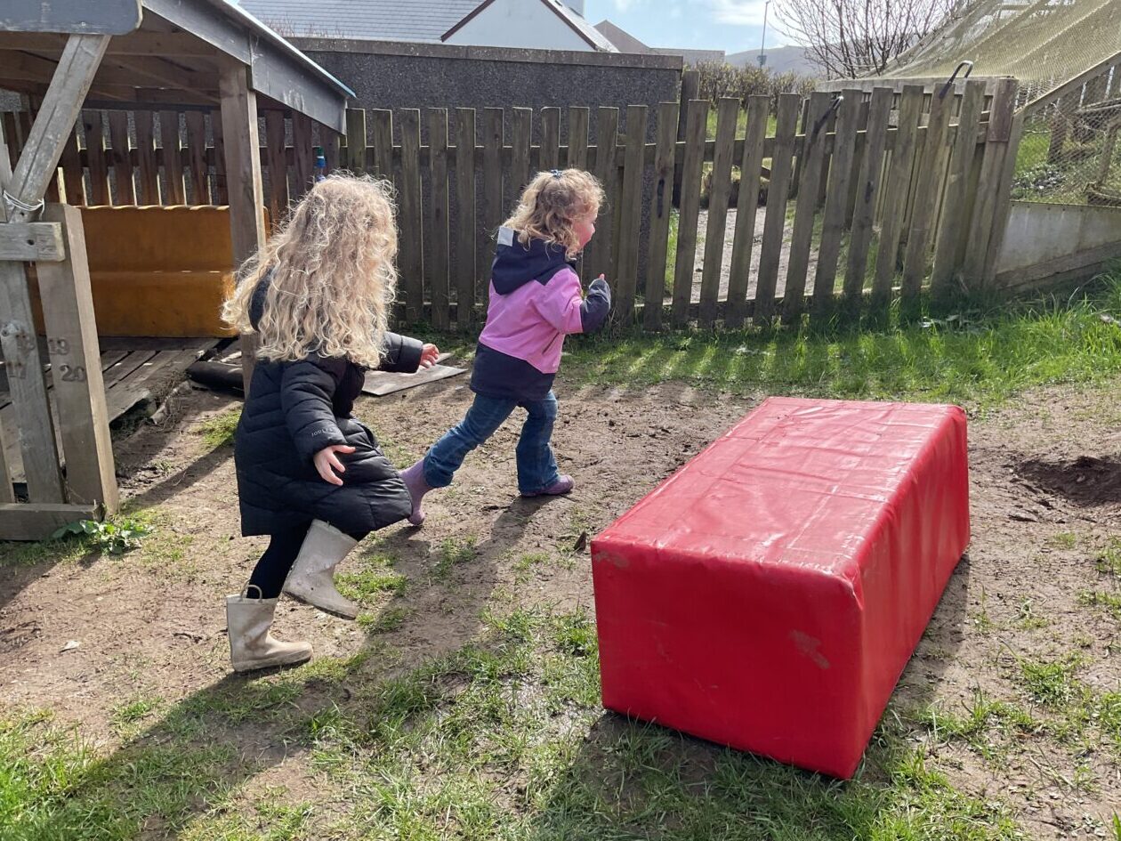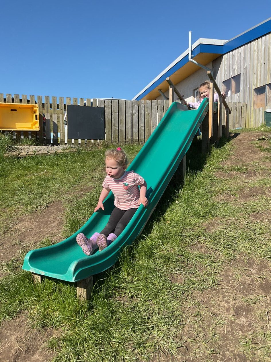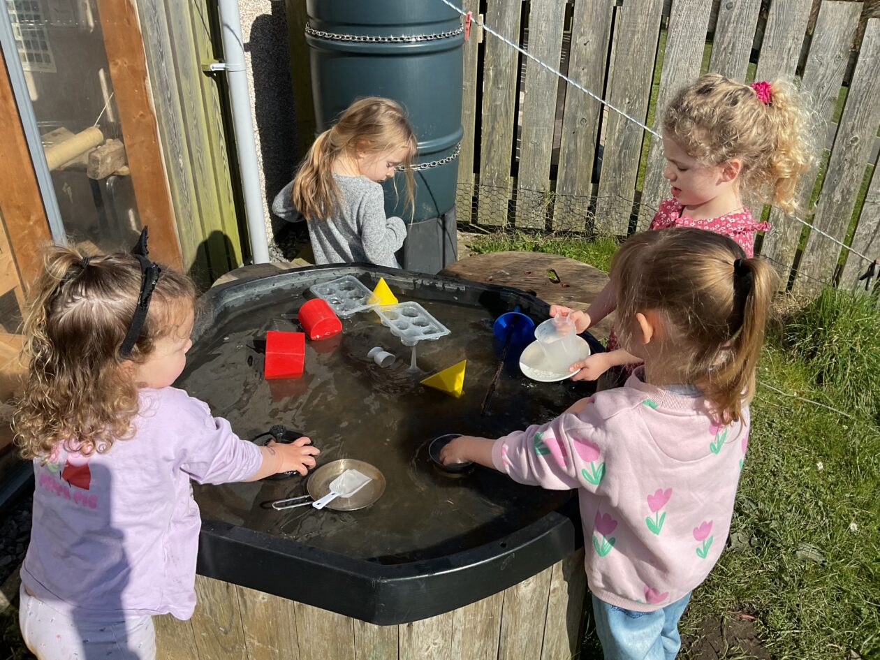 The bairns have been engaged for extended periods of outdoor play this week.  They have been creative with chalk and paint, travelled very fast down the slide, chased each other during role play, had a tea party, practiced using hula hoops and dug in the topped-up sand pit.  They share ideas and the play evolves over time.  There has been a lot of fishing boat construction using the large hollow blocks in the outdoor room.  This week, the bairns used the outdoor climbing wall as the side of a boat, saving people who had fallen into the ocean.