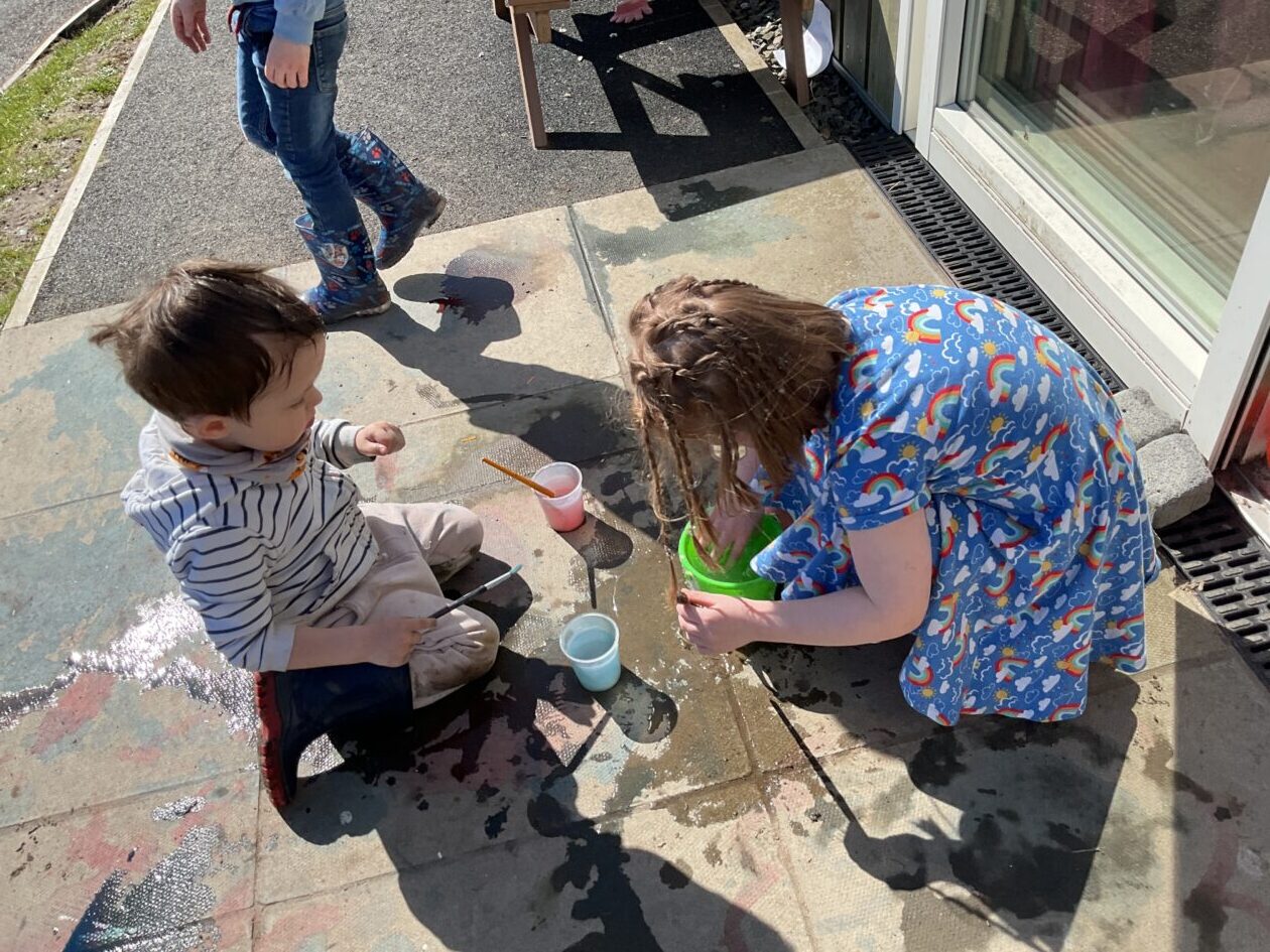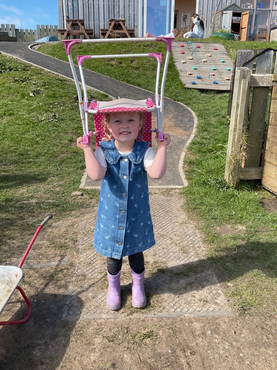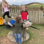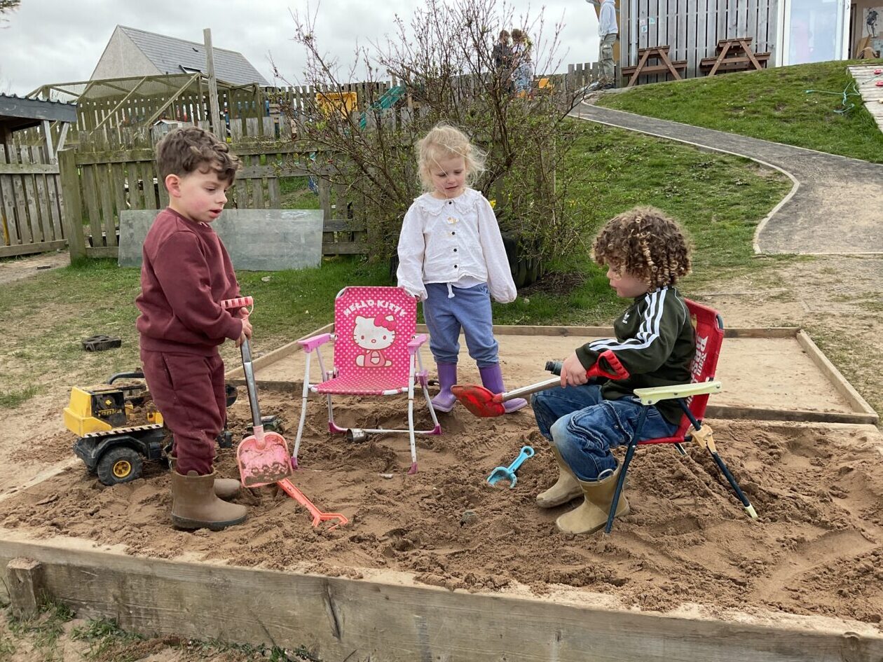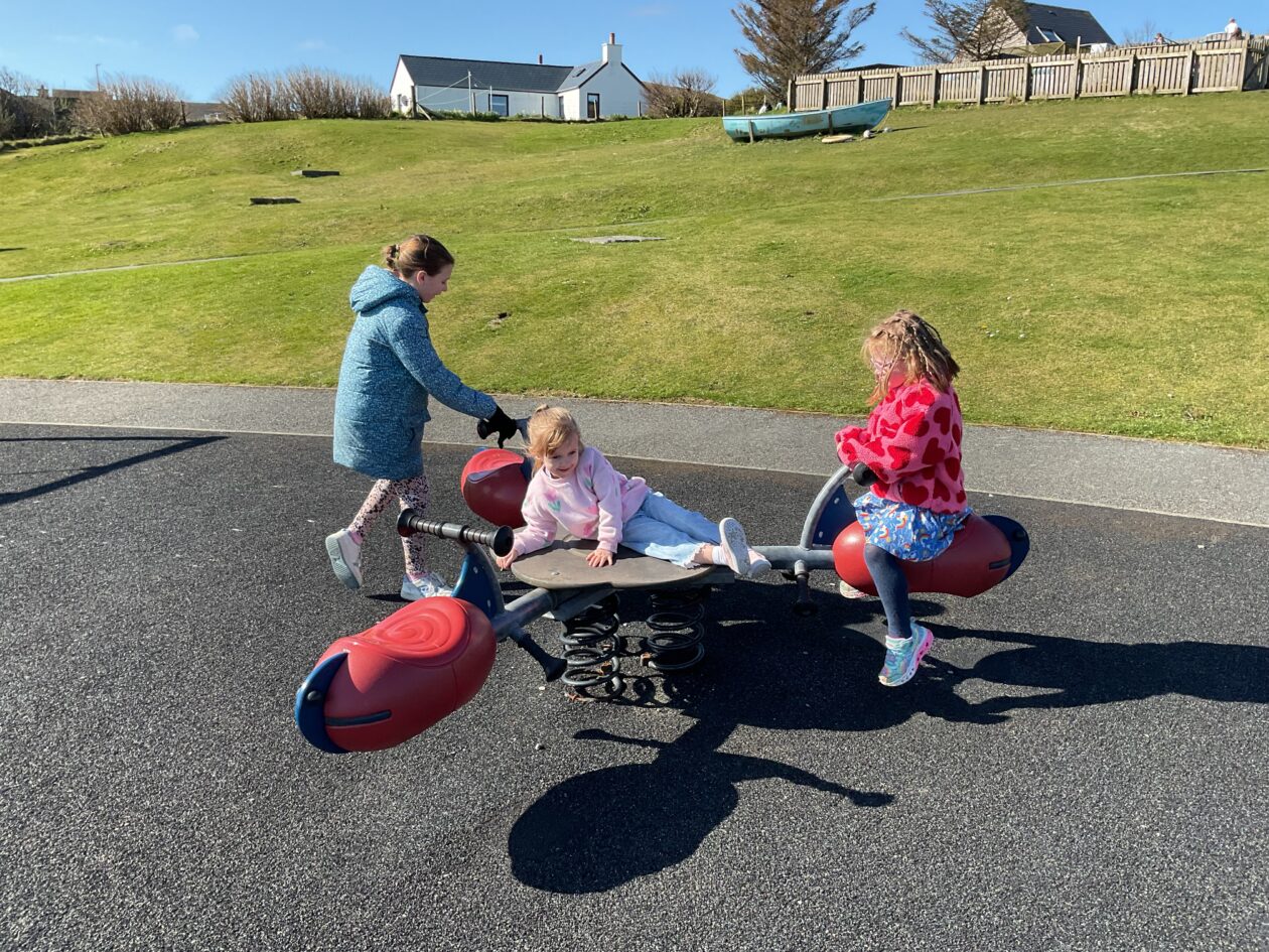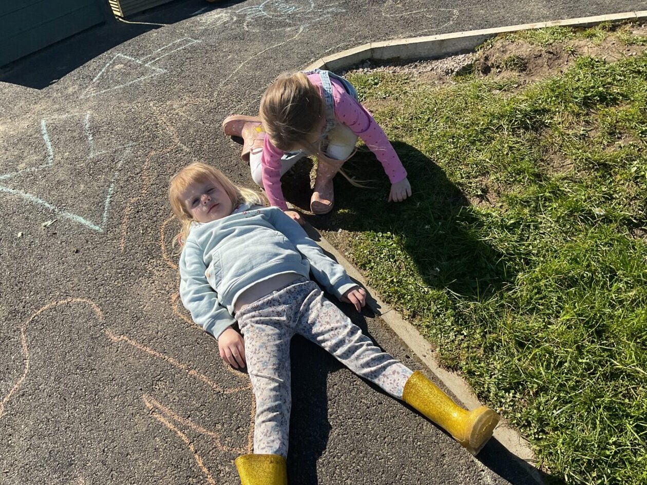The bairns have been engaged for extended periods of outdoor play this week.  They have been creative with chalk and paint, travelled very fast down the slide, chased each other during role play, had a tea party, practiced using hula hoops and dug in the topped-up sand pit.  They share ideas and the play evolves over time.  There has been a lot of fishing boat construction using the large hollow blocks in the outdoor room.  This week, the bairns used the outdoor climbing wall as the side of a boat, saving people who had fallen into the ocean.
