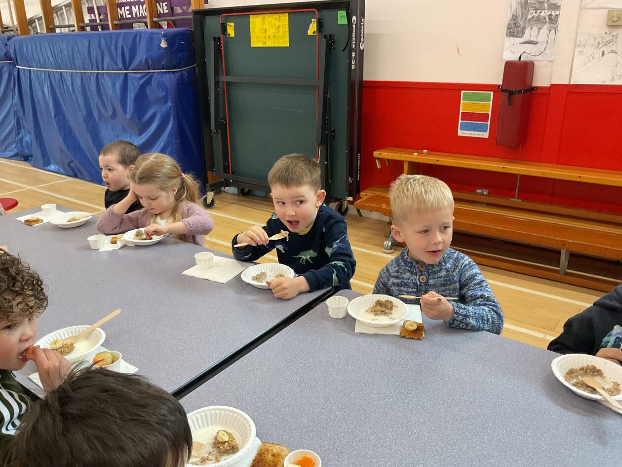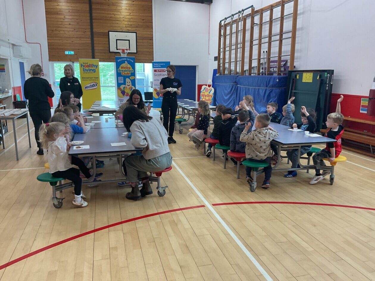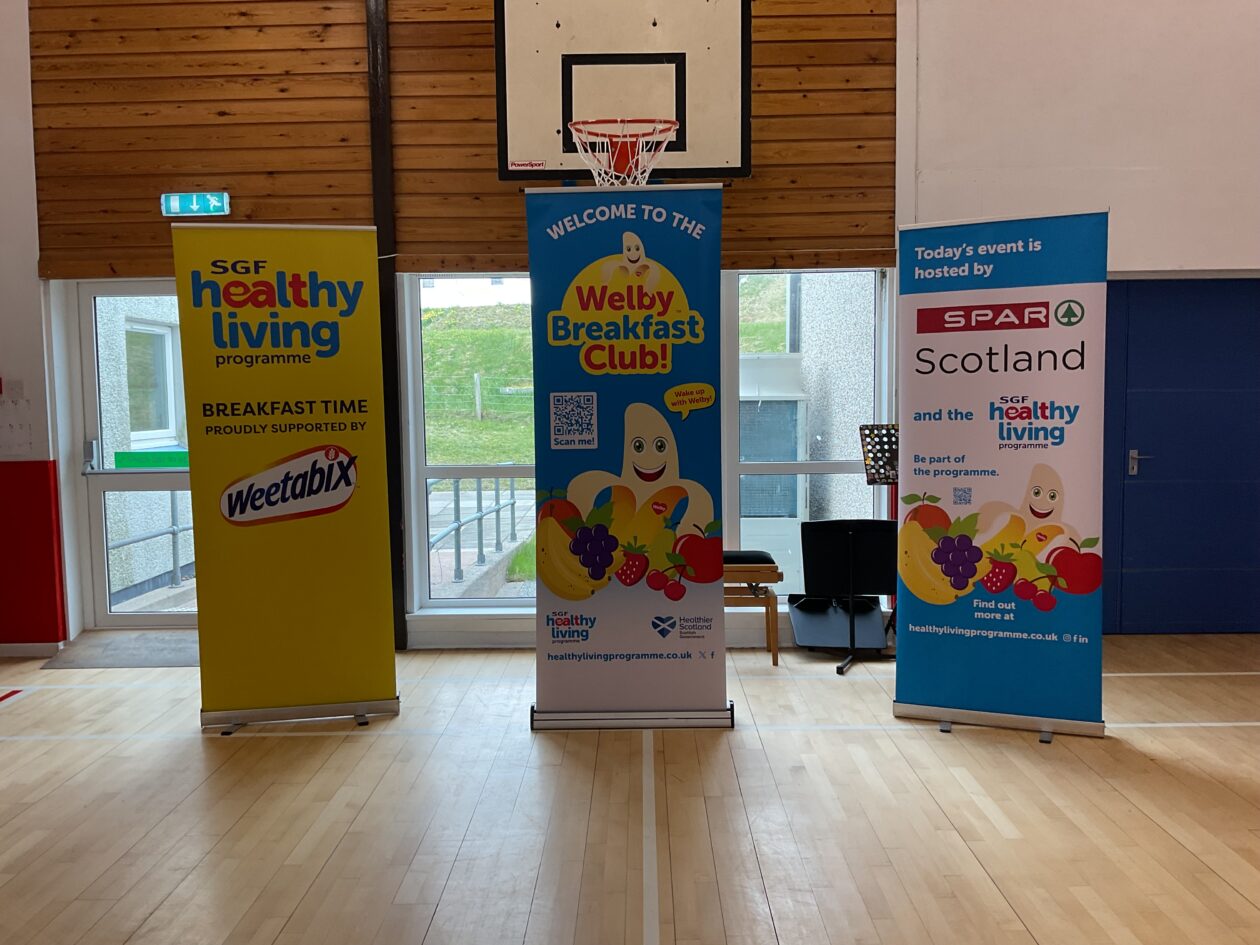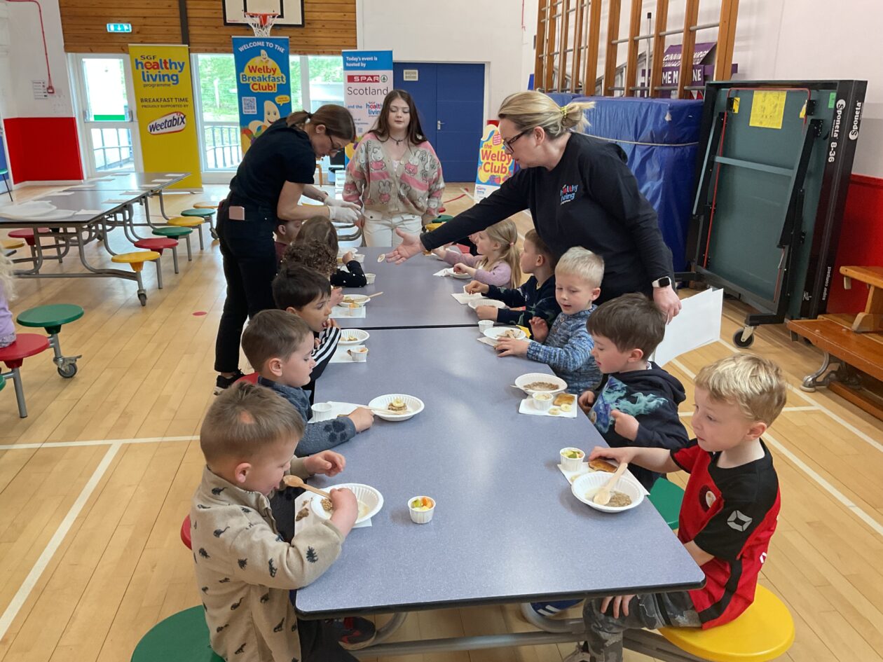 The bairns were invited to breakfast club in the school hall.  They enjoyed a breakfast of toast, weetabix, banana and a pot of mixed fruit.  The bairns gathered at the end of the hall to sing happy birthday to our birthday boy turning five!  The food was provided by the Spar (Sandwick Bake Shop) and their mission was shared through three posters.