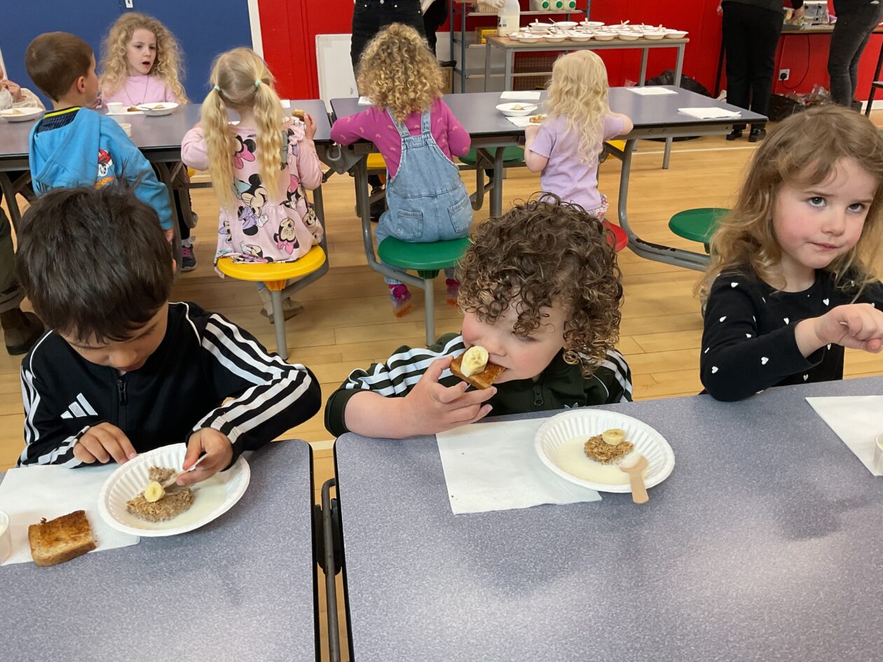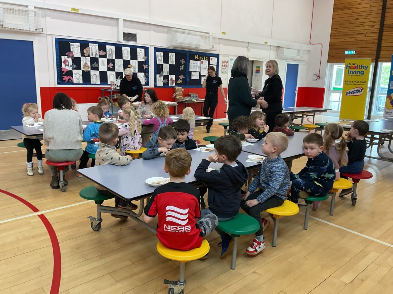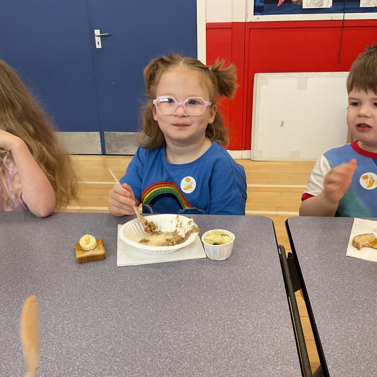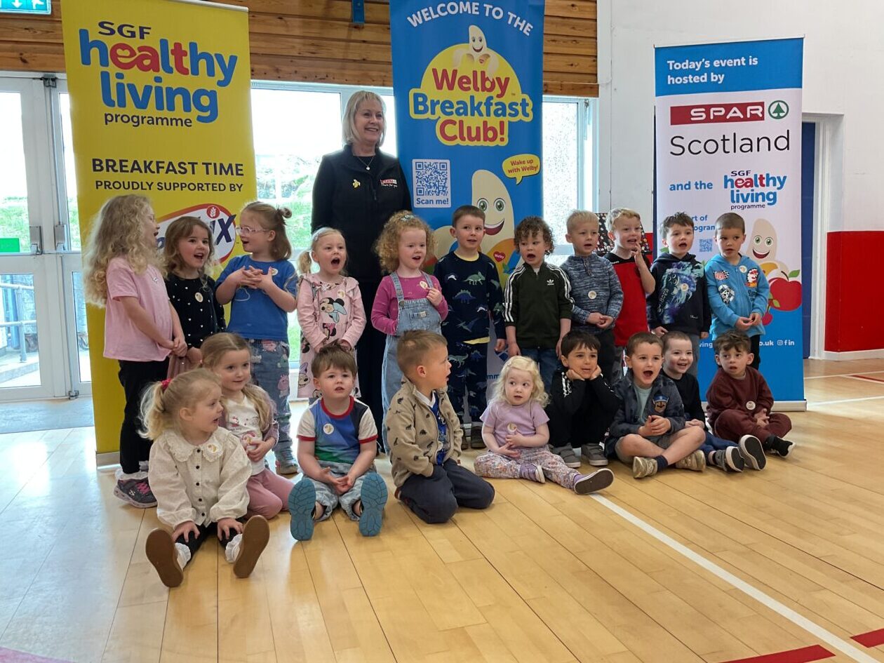 The bairns were invited to breakfast club in the school hall.  They enjoyed a breakfast of toast, weetabix, banana and a pot of mixed fruit.  The bairns gathered at the end of the hall to sing happy birthday to our birthday boy turning five!  The food was provided by the Spar (Sandwick Bake Shop) and their mission was shared through three posters.