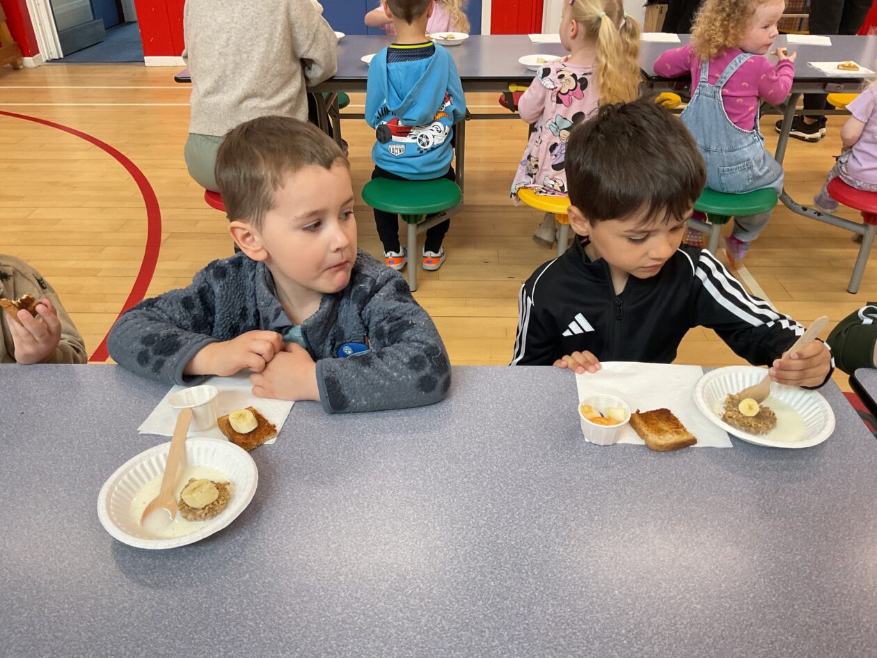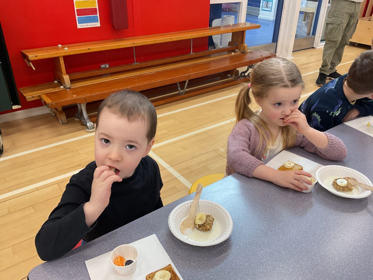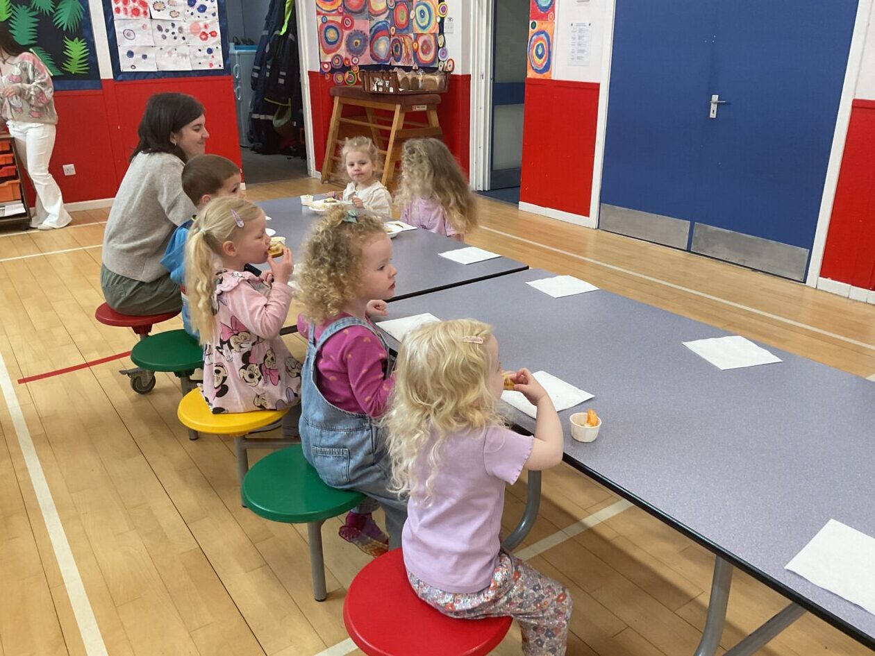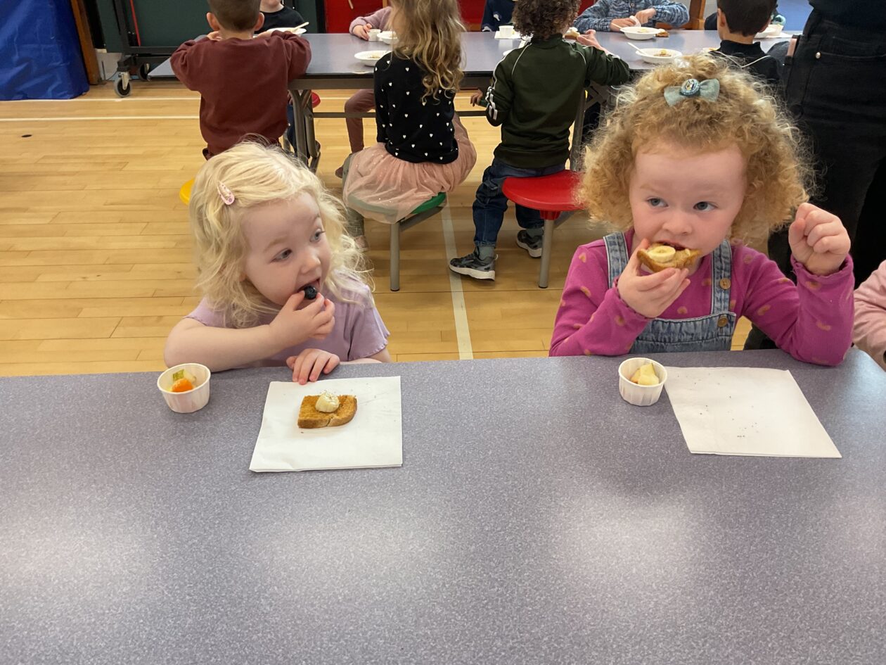 The bairns were invited to breakfast club in the school hall.  They enjoyed a breakfast of toast, weetabix, banana and a pot of mixed fruit.  The bairns gathered at the end of the hall to sing happy birthday to our birthday boy turning five!  The food was provided by the Spar (Sandwick Bake Shop) and their mission was shared through three posters.