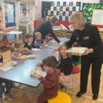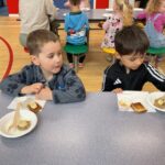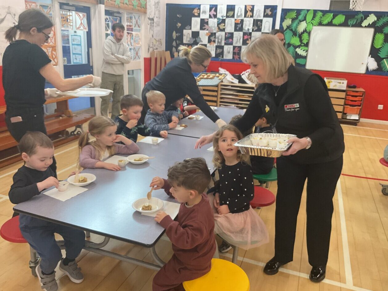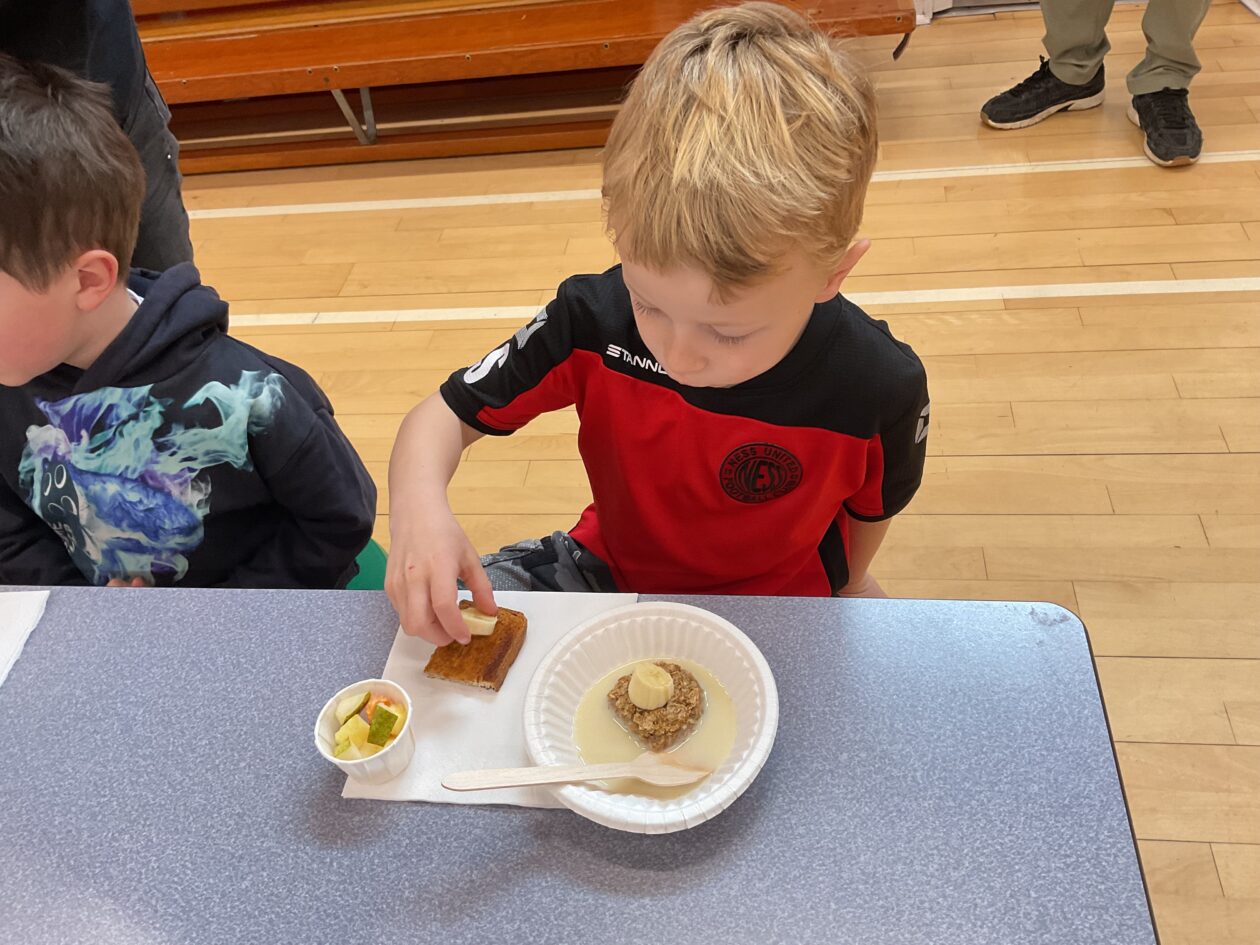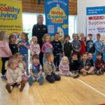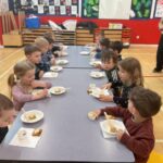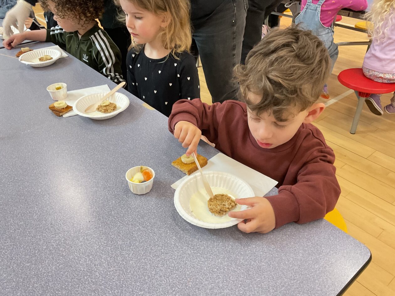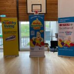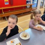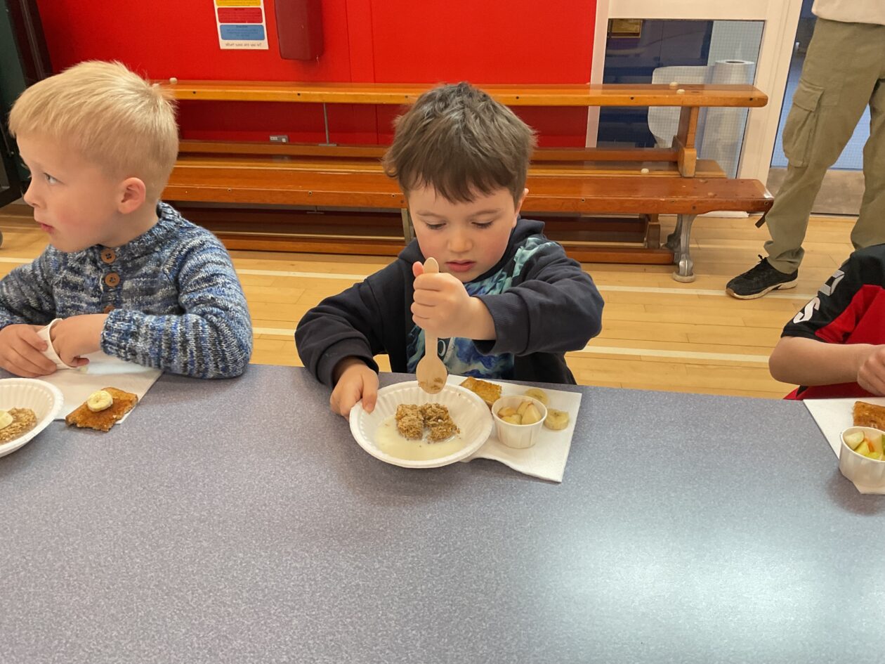 The bairns were invited to breakfast club in the school hall.  They enjoyed a breakfast of toast, weetabix, banana and a pot of mixed fruit.  The bairns gathered at the end of the hall to sing happy birthday to our birthday boy turning five!  The food was provided by the Spar (Sandwick Bake Shop) and their mission was shared through three posters.