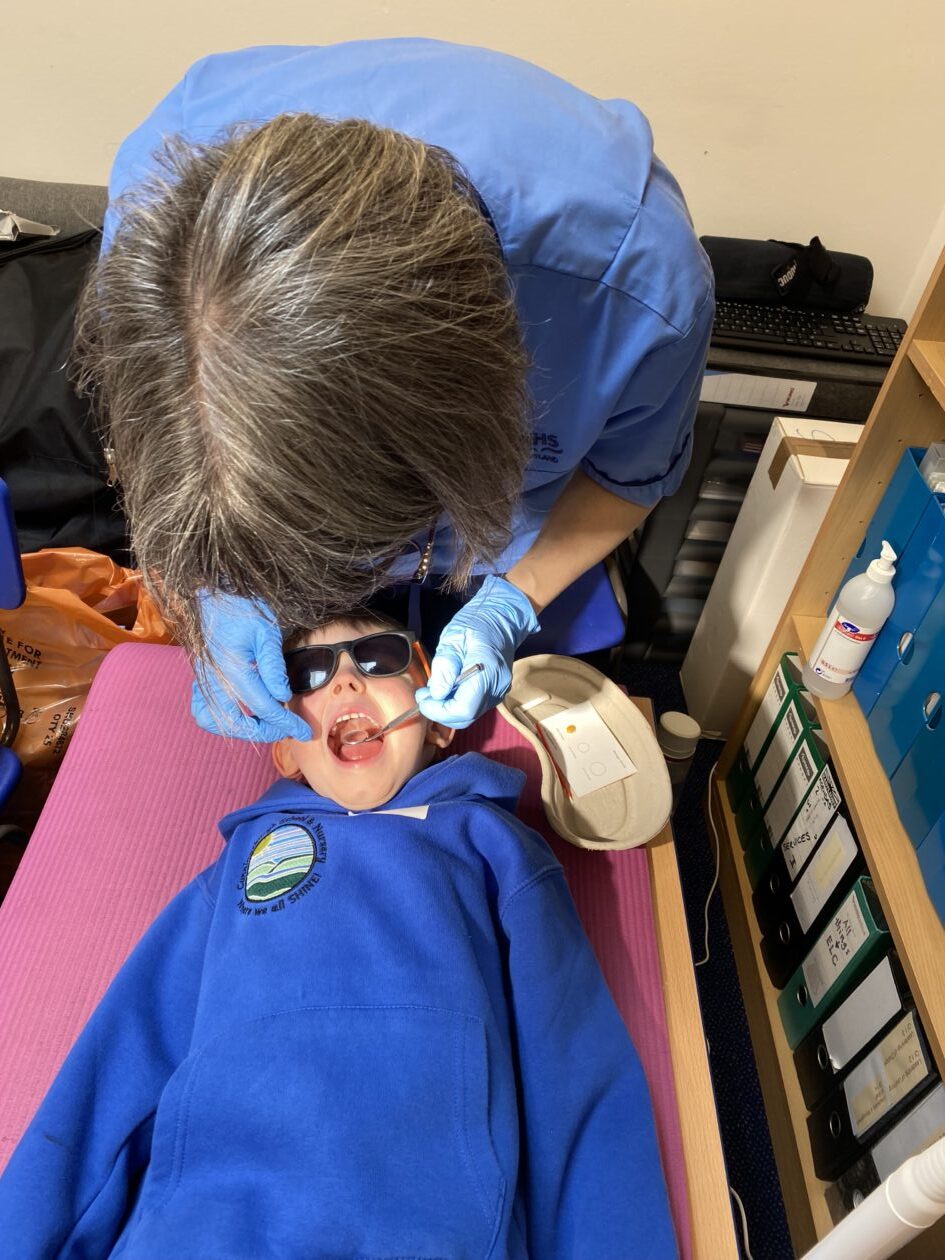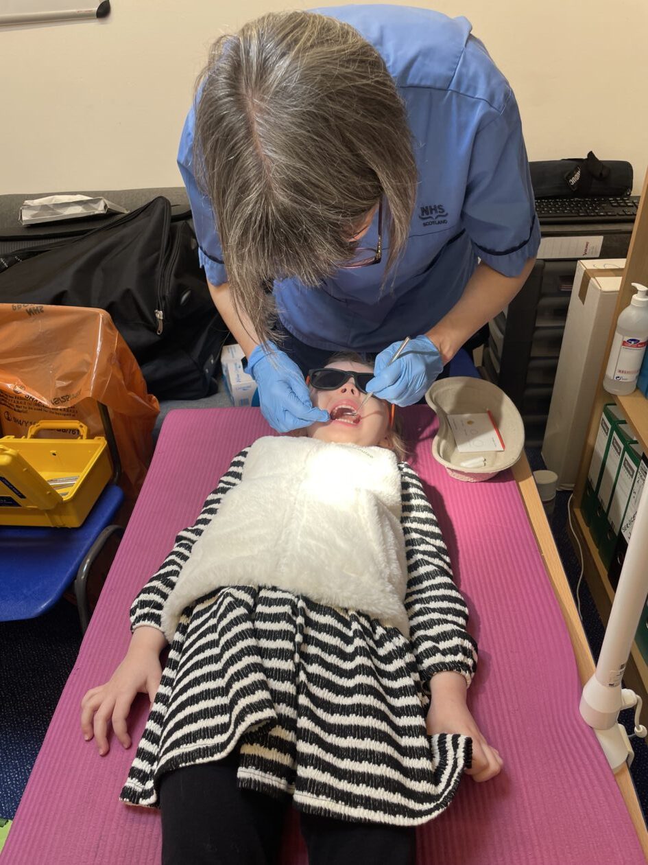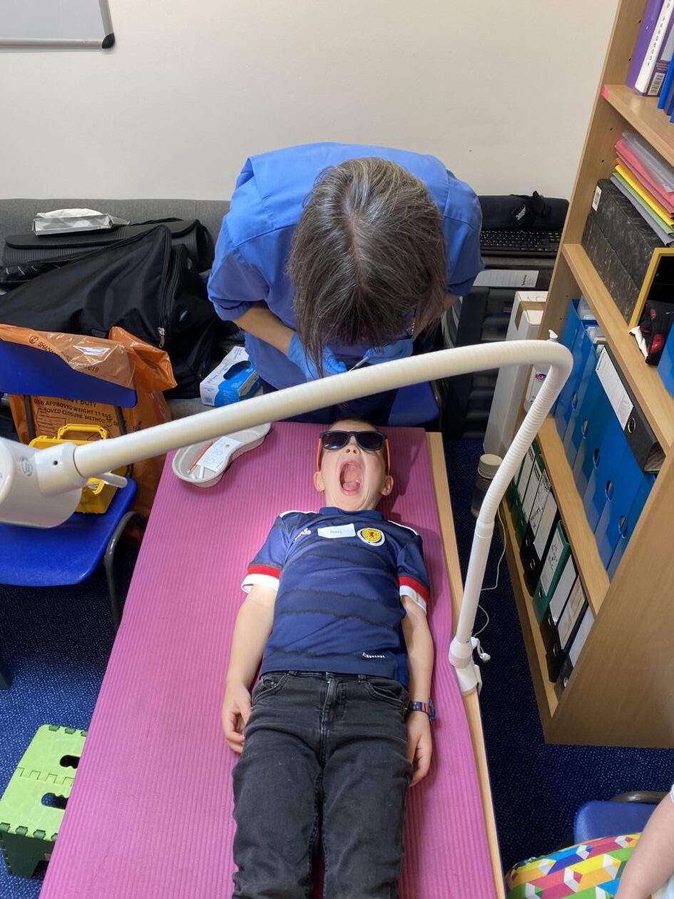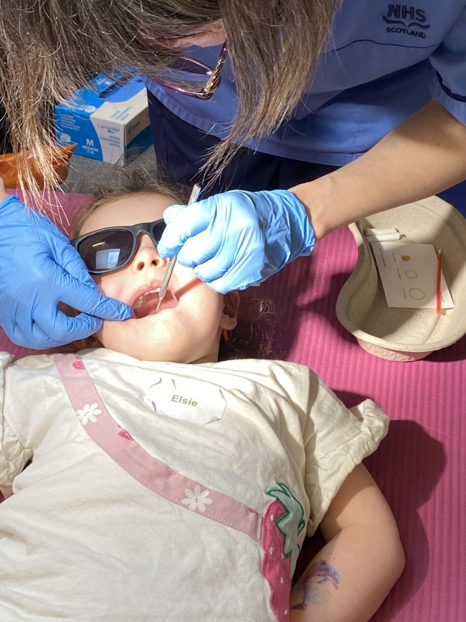 Childsmile applied fluoride varnish to the bairns’ teeth which helps to provide protection against decay and reduces sensitivity.  There was lots of discussion about tastebuds.  The bairns noticed that their mouths were producing more saliva and wondered why.  We spoke about the flavour of the fluoride varnish and how the brain thinks that it’s food so it produces more saliva to help break down the food for digestion.  “It’s yellow.”