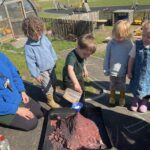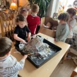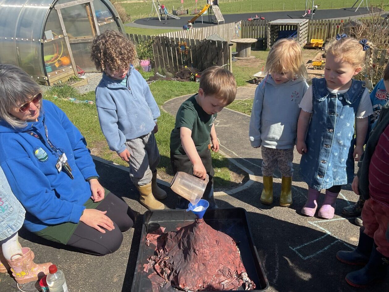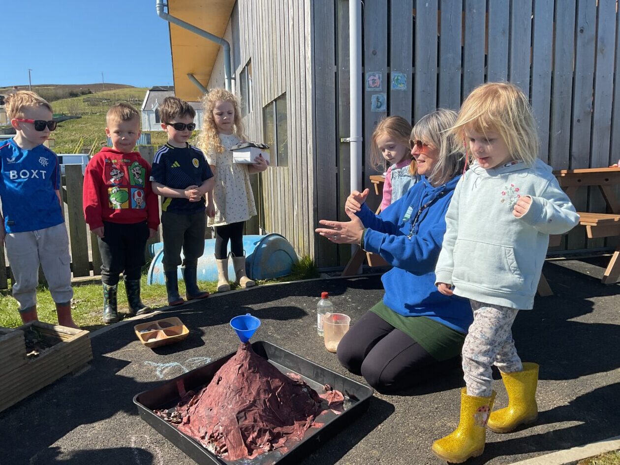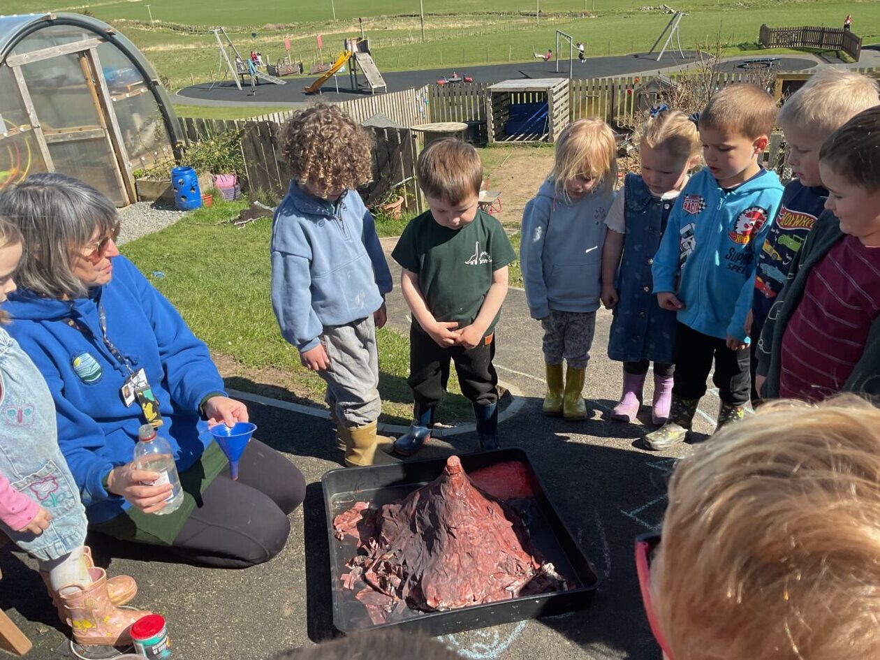 The bairns continued their STEM experiment and erupted their volcano using a chemical reaction between vinegar and bicarbonate of soda.  There was rich discussion about the types of molten rock – magma inside the volcano and lava after an eruption.  The bairns spoke about the eruption of Mount Etna in Italy last year and how volcanoes can be active, dormant or extinct.  They also learned that many people who live near Mount Etna had to be moved to a safe place.  Our volcano was on a slant and the bairns correctly identified that the lava would flow down the mountain which wasn’t safe.