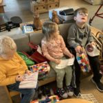 We did our termly visit to the residents of sheltered housing next to the school. We made calendars, peppermint fudge and gave them a small parcel containing a tea bag and biscuit.