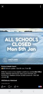 Information just released from Shetland Islands Council.   All Schools and ELC Departments closed on Mon 5th January.