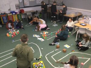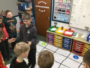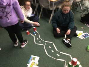 Then we pretended to be robots and followed instructions given to us on a grid. We tried hard to think about the most efficient route to get from A to B and how our instructions need to be very clear.