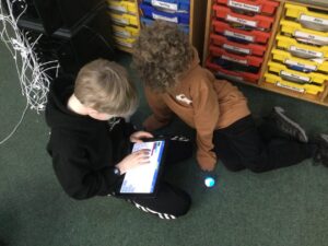 We spent Tuesday afternoon we welcomed Eleanor back to our class and we had fun programming Sphero robots. We pushed back the tables, got into pairs and soon the classroom was busy with everyone exploring the capabilities of their tiny robot.