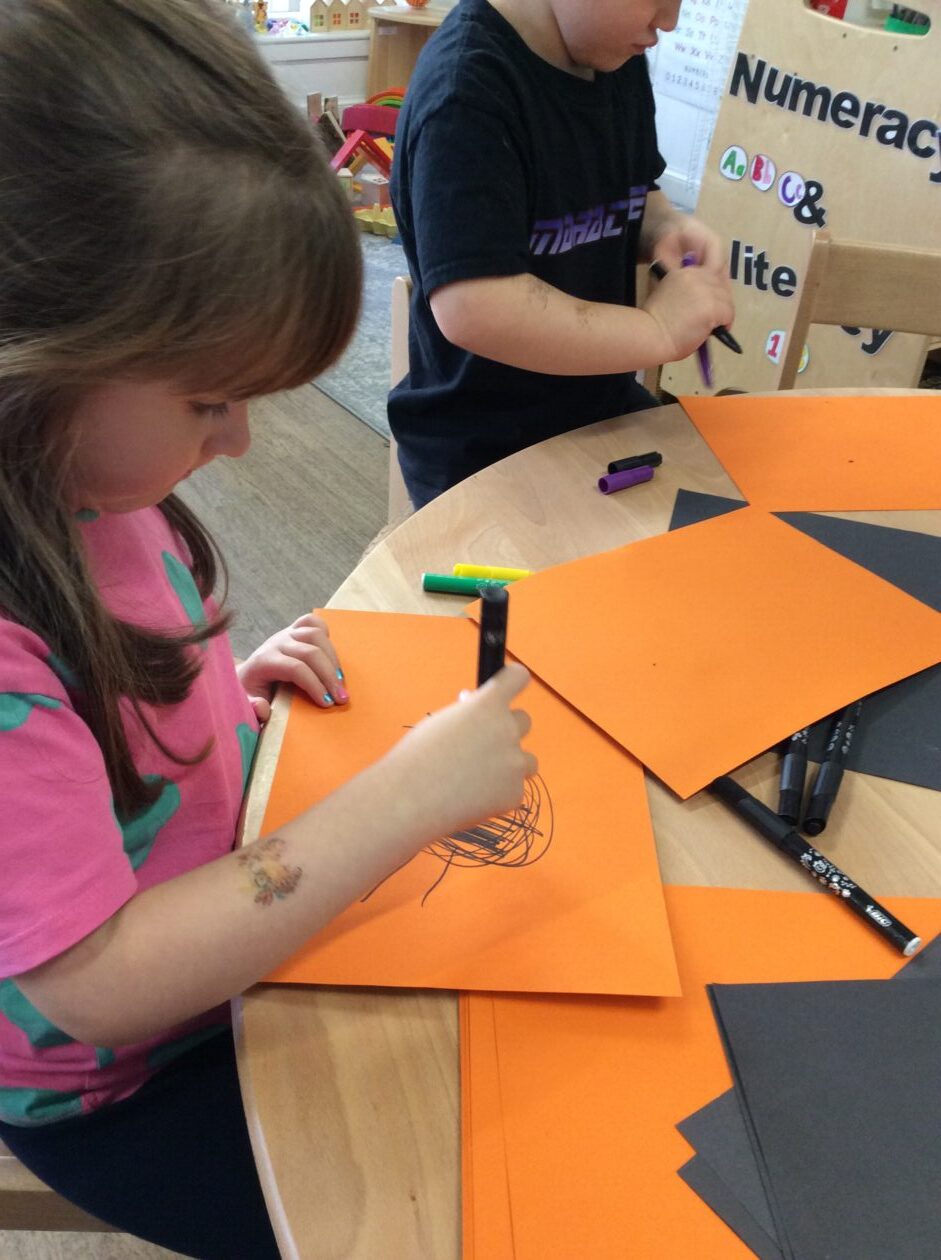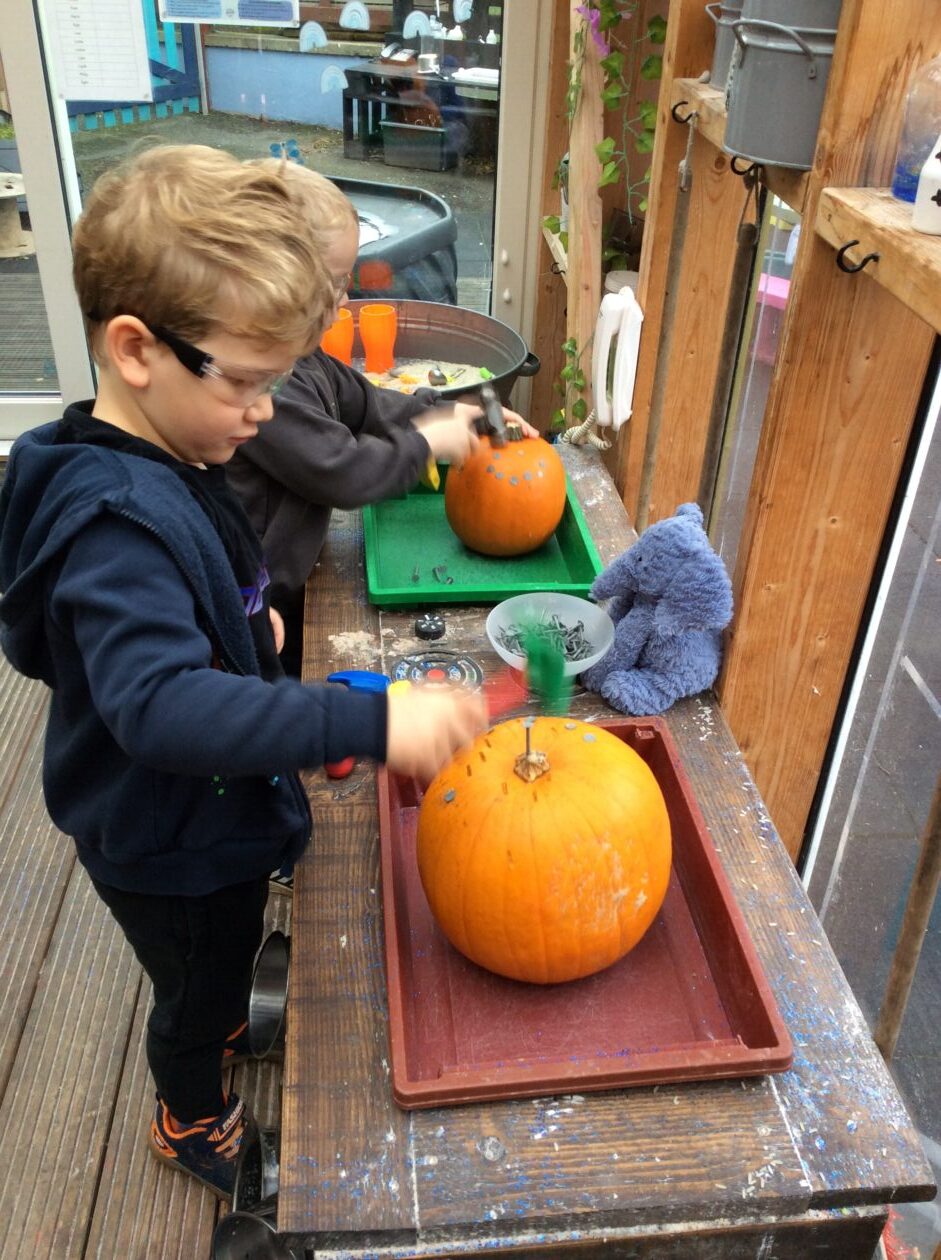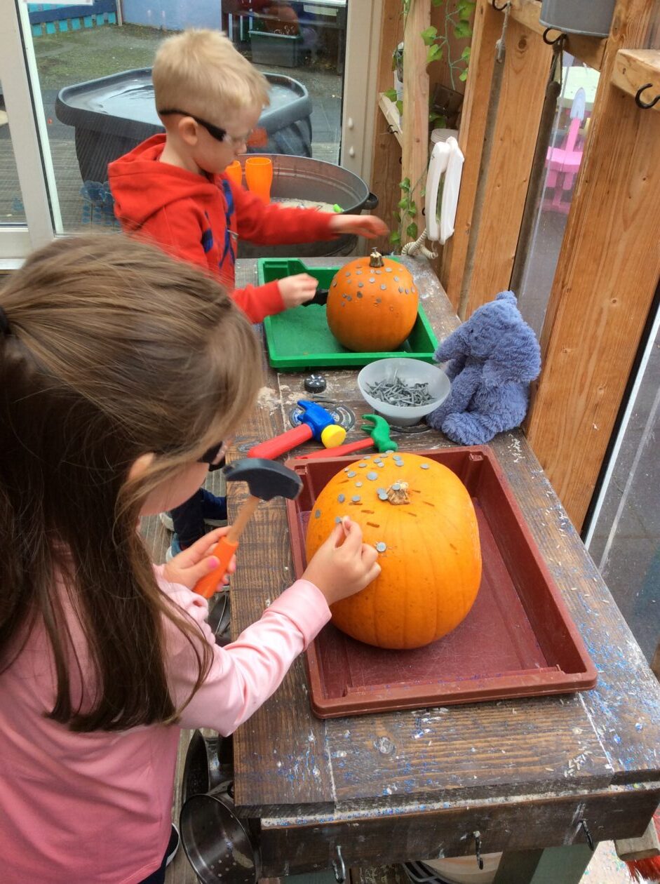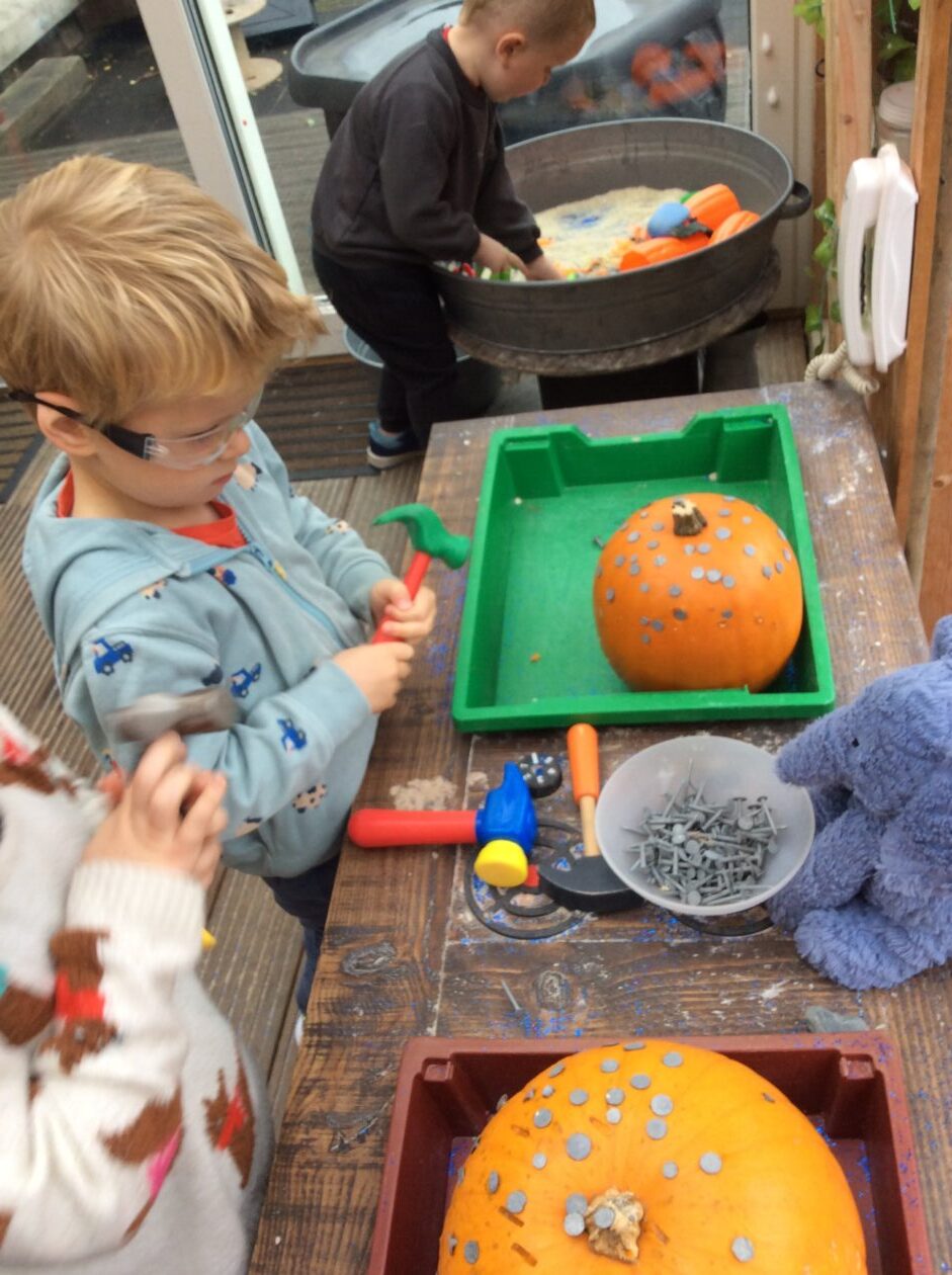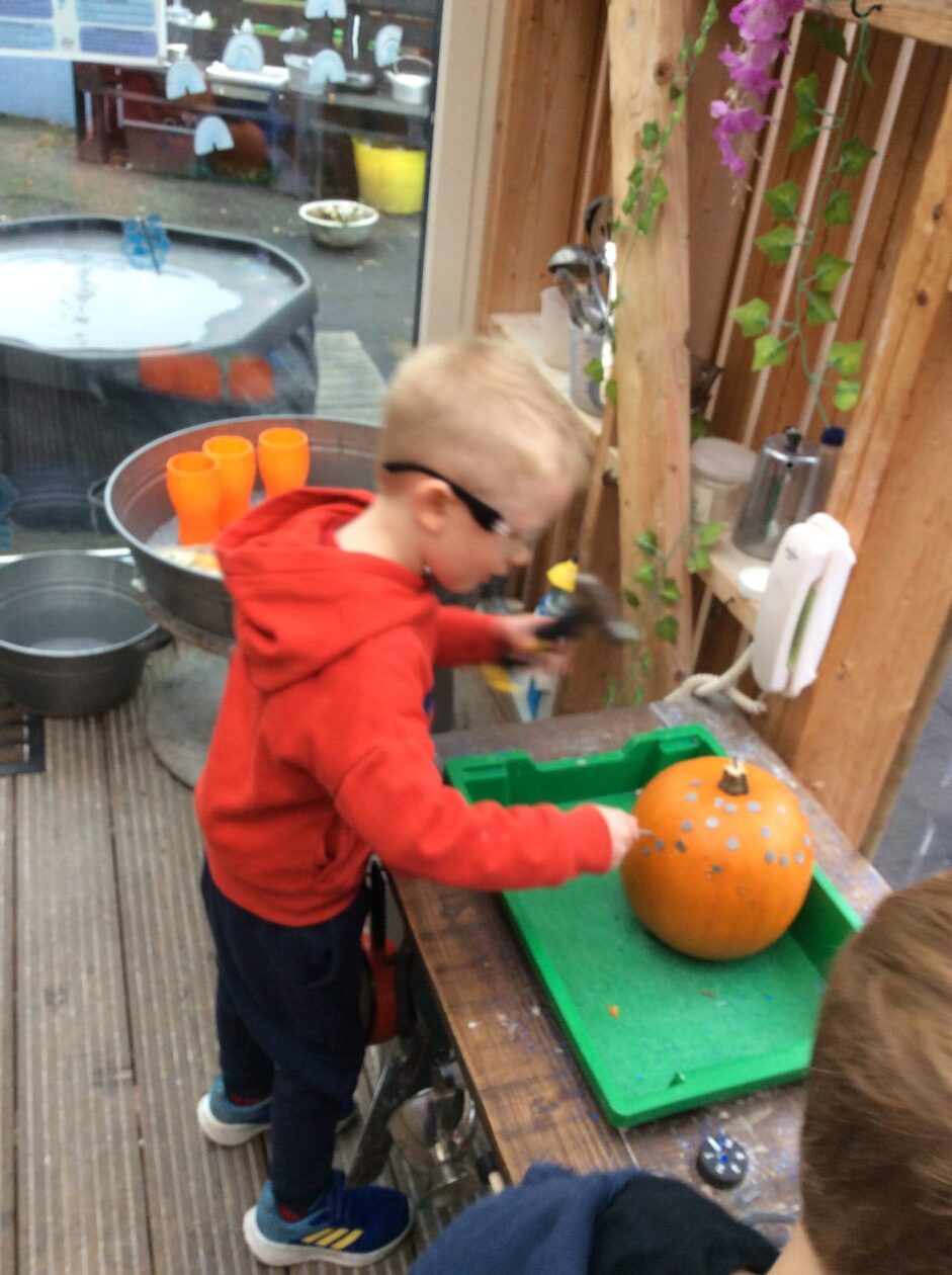 Today we have been getting Halloween ready. Drawing some spooky pictures and making some potions in the sensory trays. The children went around trick or treating with the cauldrons. We were also practicing our fine motor skills, hammering the nails into the pumpkins. SIMOA was reminding us to stay safe by wearing our safety goggles when we were using the nails and hammer.
