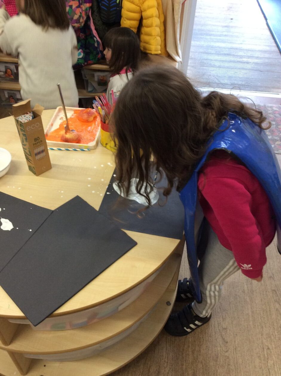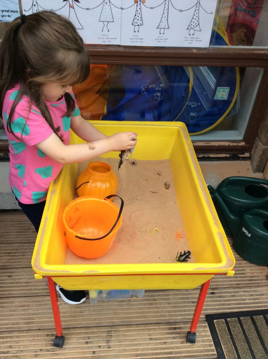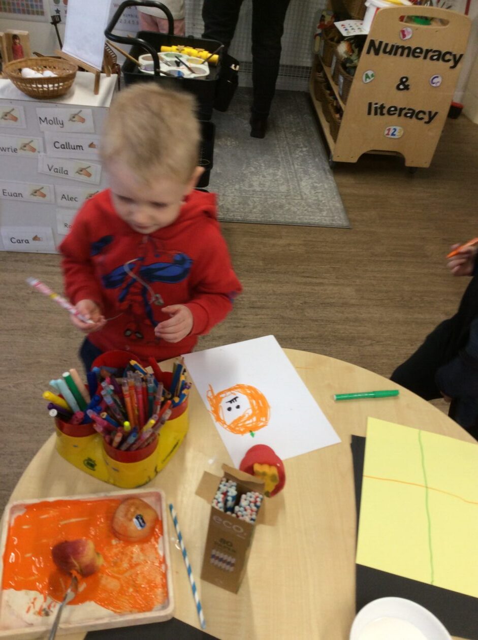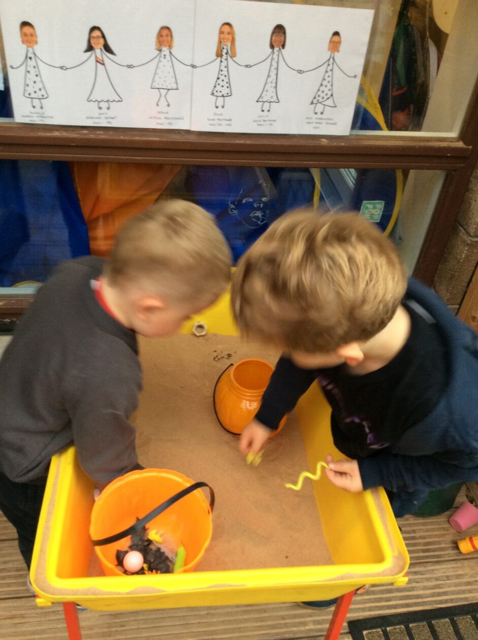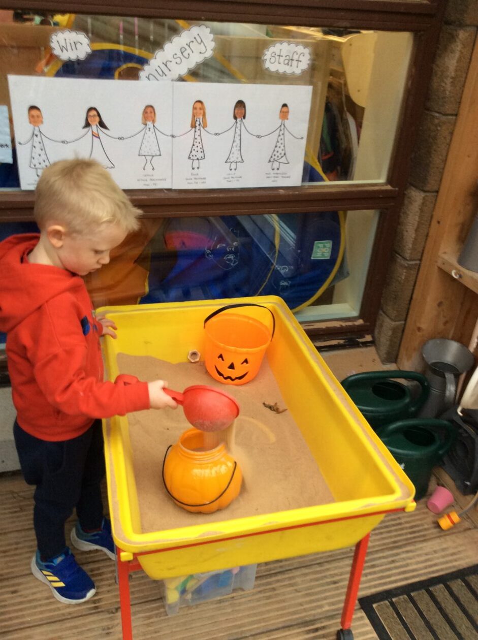 Today we have been getting Halloween ready. Drawing some spooky pictures and making some potions in the sensory trays. The children went around trick or treating with the cauldrons. We were also practicing our fine motor skills, hammering the nails into the pumpkins. SIMOA was reminding us to stay safe by wearing our safety goggles when we were using the nails and hammer.