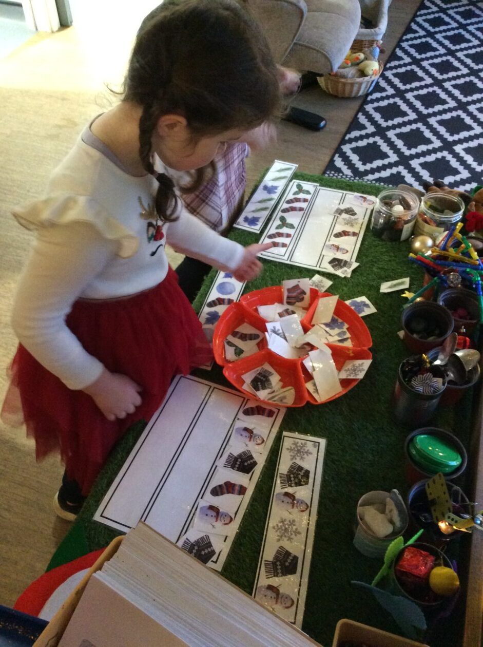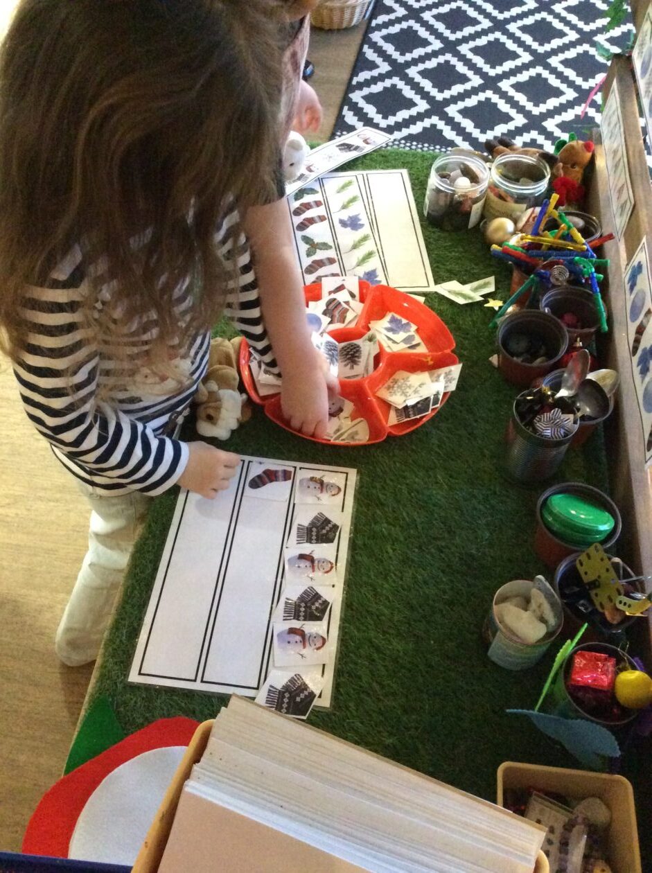 Today we set up some winter pattern making activities at the tinkering table. Some of the children chose to copy some of the pattern examples, while others decided to create their own repeating patterns. There was lots of careful thinking and sorting as they experimented with what came next in their patterns.