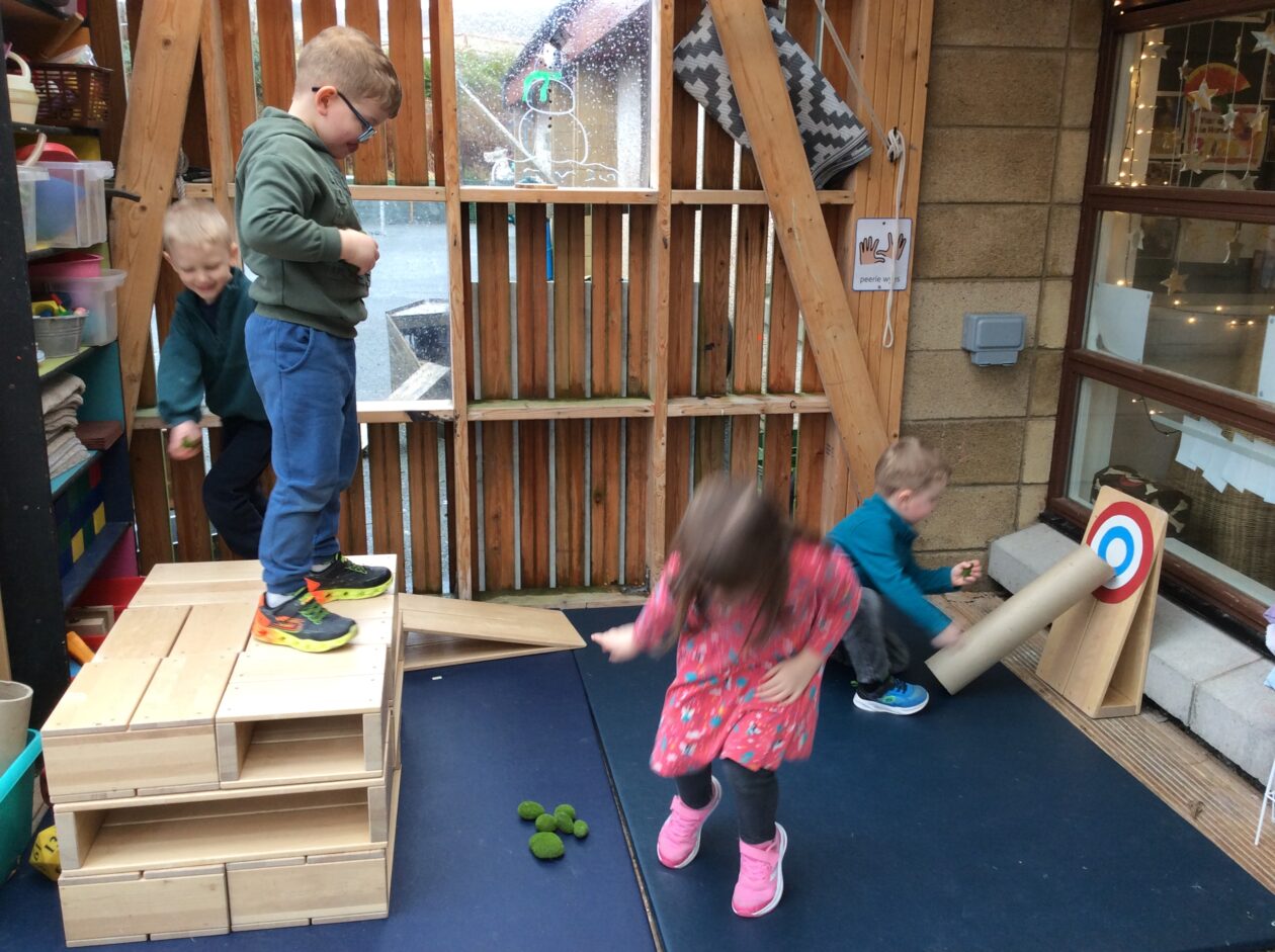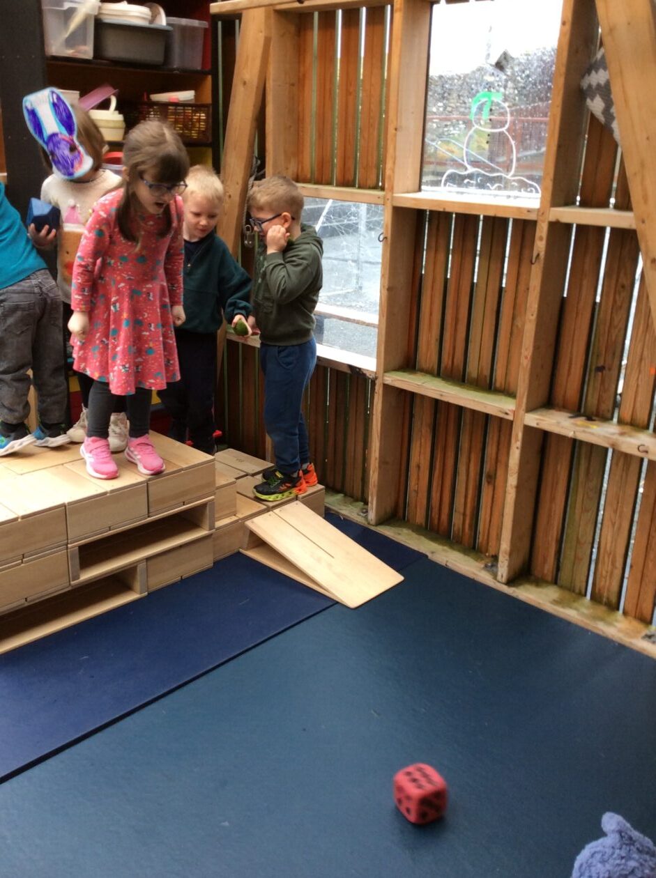 The children have all been very keen to jump in the porch, so today we carefully built a platform.   As we were building we talked about making sure we built a stable base so that it wouldn’t wobble and fall over.   We also talked about how to stay safe when jumping – taking turns, going one at a time, not jumping too far out and not jumping with our hands in our pockets.