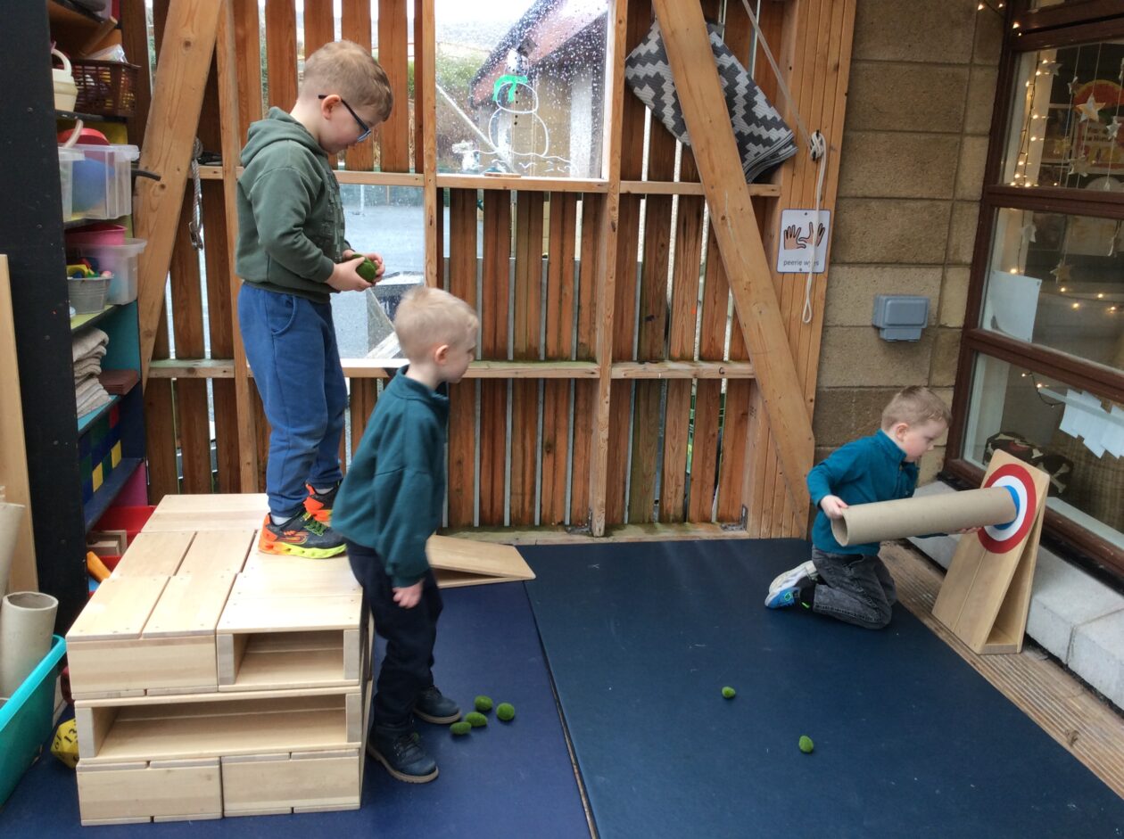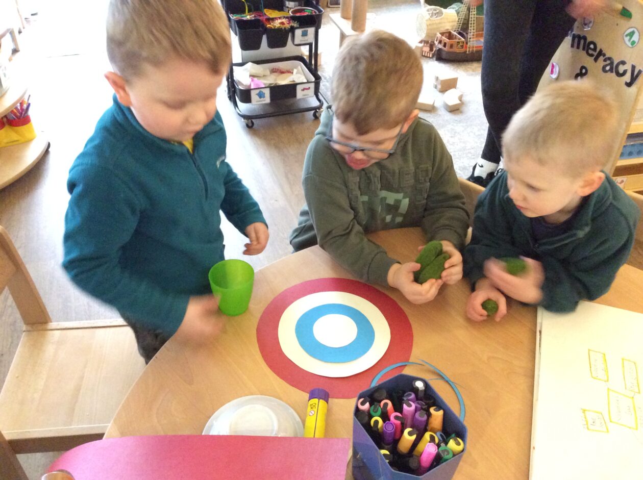 This later developed into wanting to throw objects at a block for a target.  One child thought it would be good to have a target so together we went on the laptop to see what a target could look like.  We then found the colours and together glued them together.   There was then lots of good aiming practice.  What a good idea!