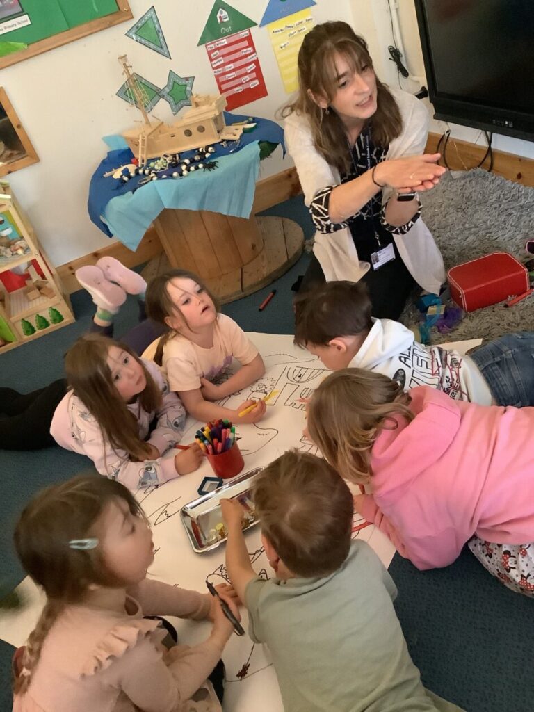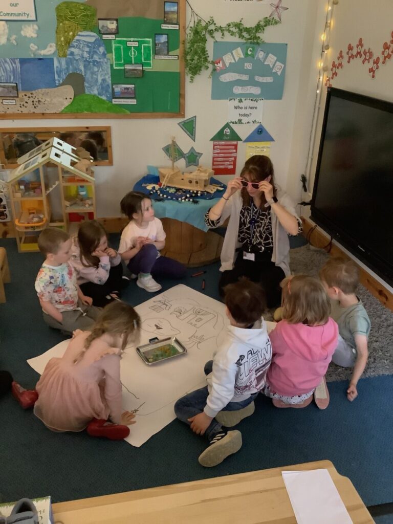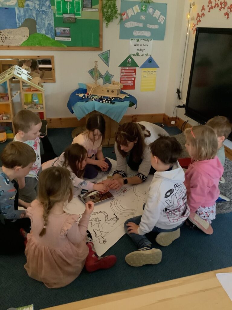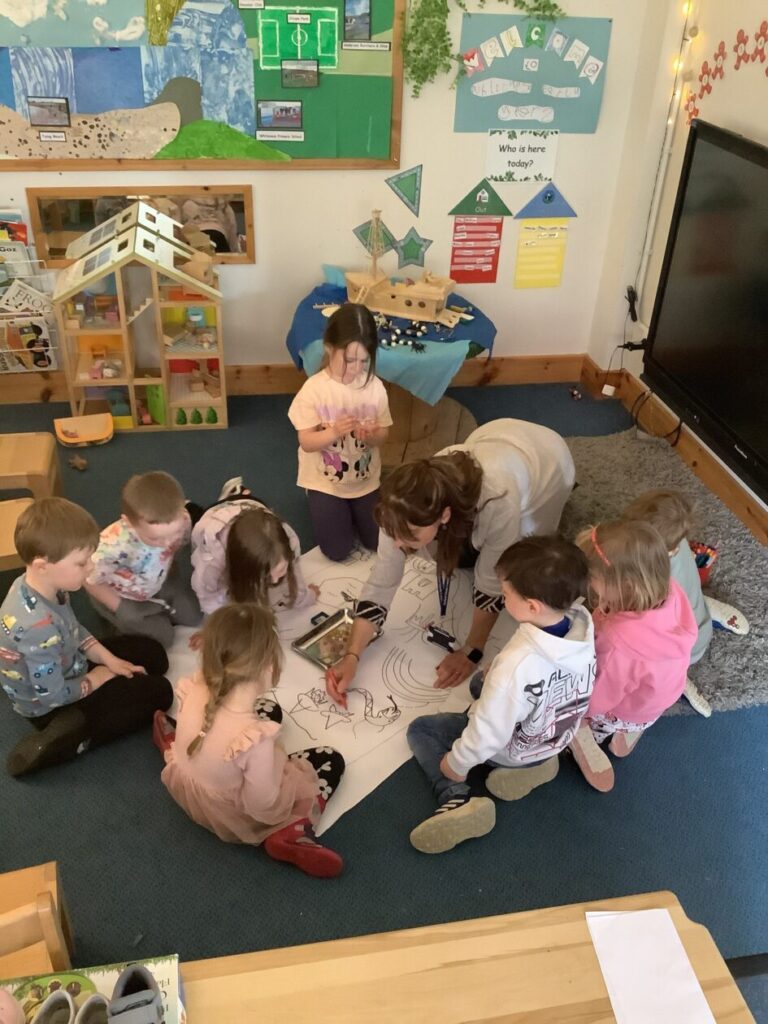 The children were so engaged and listened really well. They joined in with their own ideas and loved sharing their knowledge about different creatures too. They all helped to draw and colour the mind map and add a few more exciting parts to the journey.
