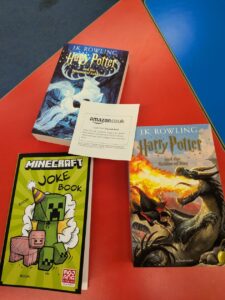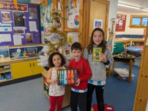 Secondly, we met a lovely teacher in the Summer Holidays called Mr Shields, who works at Eton College in England. Eton is a very different school to ours and we had fun exploring the differences. But, what unites us is a love of reading. Eton asked us if we would like some books as they often have fundraisers and send books to other schools as well as their own. We looked through our own library and put together a wishlist. Very kindly and generously, funds were raised to buy the whole list! Here are some pictures of us with some of the books, with a whole ferry-load to follow in January.