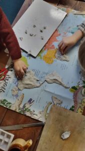 Interest in the Earth (P3) and mapping (ELC) led us to create our own world map with clay, adding in mountain ranges. We are starting to investigate blanket bog habitats with Foula Heritage Rangers this term. We observed the peat bogs and different types of sphagnum moss up the hills on our way to visit a new landslide on da Sneug .