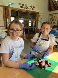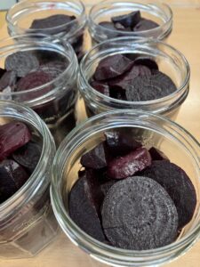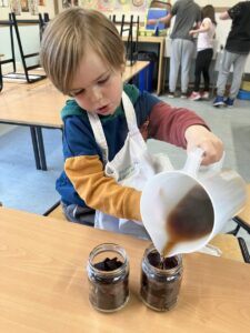 Making pickled beetroot. We learned how to sterilise jars and then had lots of messy fun chopping up the beetroot and making the vinegar and sugar mix. We all got to take a jar of pickled beetroot home.