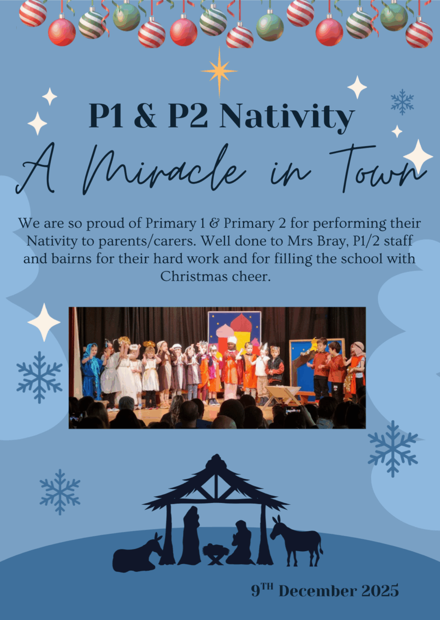All the P1 and P2 pupils came together to put on a fantastic Nativity this term. It was called Miracle in Town and was produced by Out of the Ark Music.