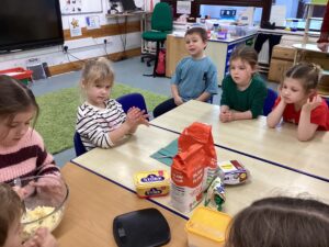 P1/2 decided to make biscuits to sell at the Christmas Fayre on 5th December. We learned about food hygiene, ingredients, measuring and taking turns.