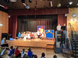 Here we are in our dress rehearsal which we invited the Primary classes to come and see. Thank you to Michael and Sanna, our confident volunteer narrators.