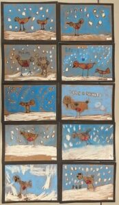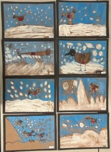 In art P1/2 have been learning about shape and combining materials to create these winter robins.  We first looked at shape and how we combine them to create an image of a robin and add a background.