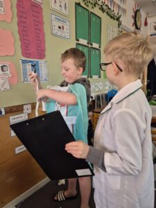 She brought the hand hygiene unit so we could see the difference between dirty hands and clean hands. She demonstrated how far germs can be spread when people cough or sneeze. We discussed common diseases that can be spread. Gemma also showed us some items that nurses would use in their job such as a thermometer, stethoscope and pulse monitor.
