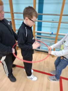 Here we are doing a team work exercise.  The group had to move around, but the middle person wasn’t allowed to touch the hoop.