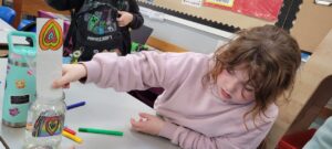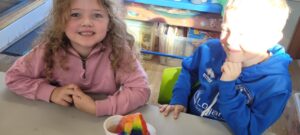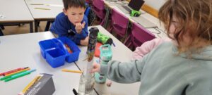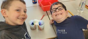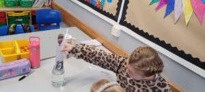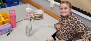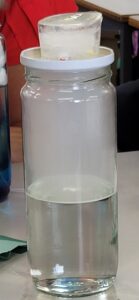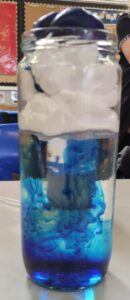 Next we created a cloud in a jar using hot water and ice to show us how the water cycle works. We found that warm, moist air meets cold air and voila – a cloud forms in a jar!