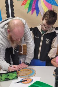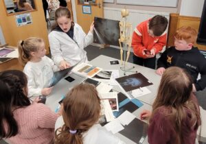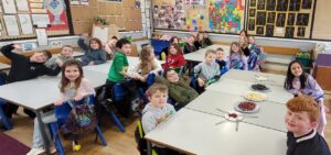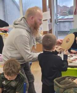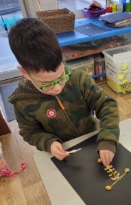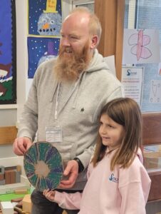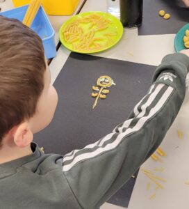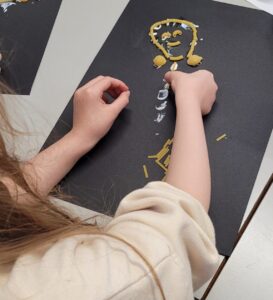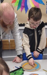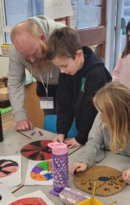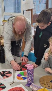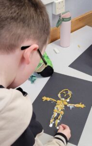 Using hot colours for the heart and cold colours for the background we explored printing by painting on one half of the paper and folding it over to take a print.  Once we finished them and they’d had a chance to dry we used chalk to create an outline and add highlights.