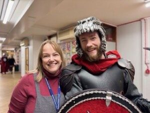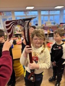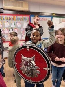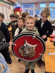 The weather was kind so we managed to walk to the street to see the Jarl Squad morning procession.  We loved seeing the galley and the guizers.  In the afternoon we had a visit from the Jarl squad and even got a chance to try the helmets, axes and shields.  They were impressed with the Shields we made.