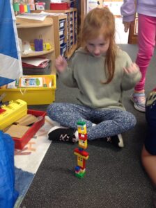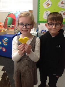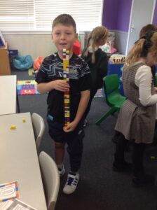 We chose lego challenges today, as part of Maths Week Scotland. We worked together on building something in a minute or the tallest tower. In addition, we could build a heart, numerals, shapes or a symmetrical design. There’s lots of challenges to try and we hope to re-visit these later in the week. We used our creativity meta skills as well as collaboration. We had fun!