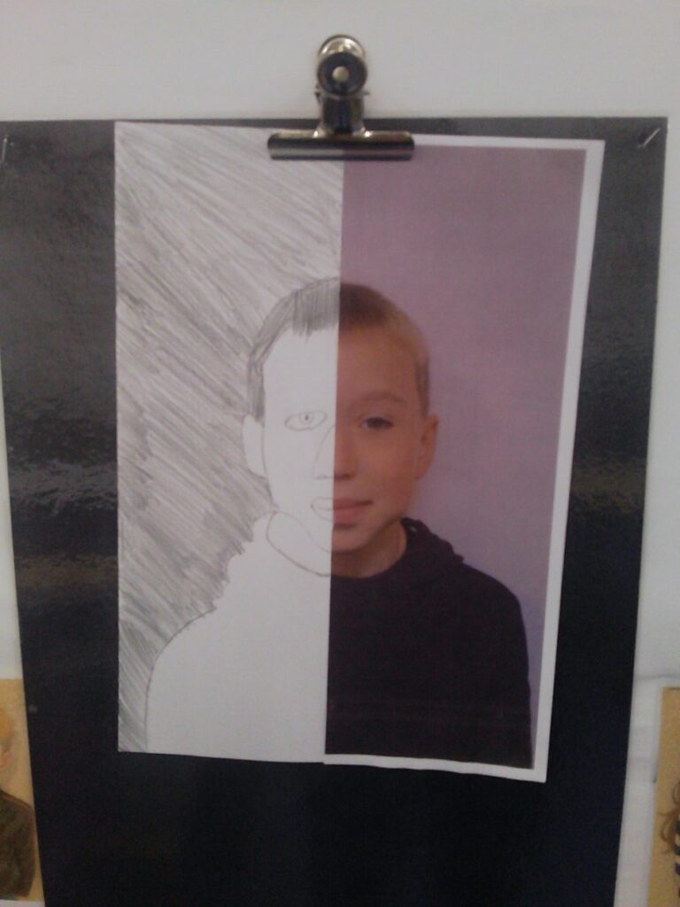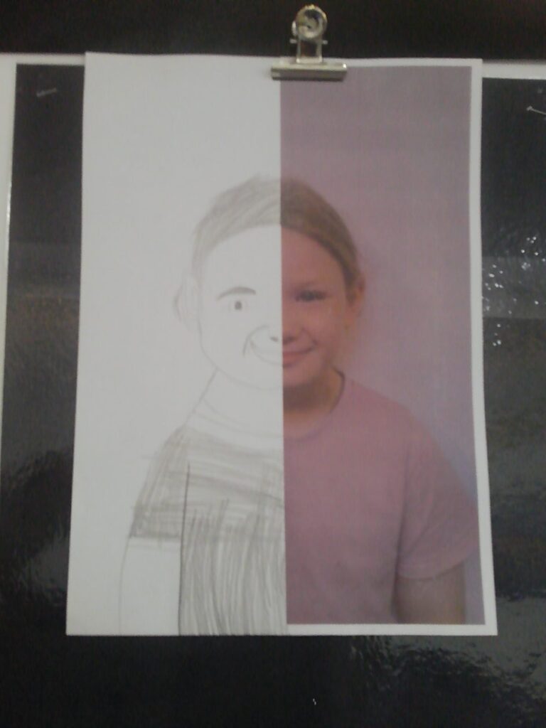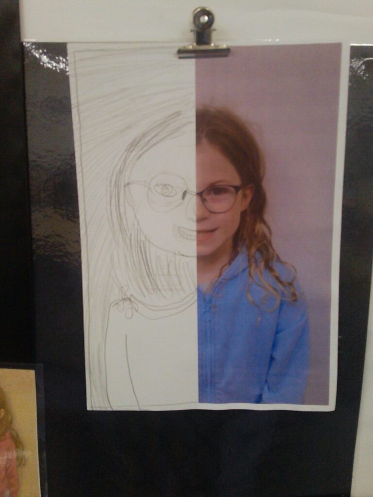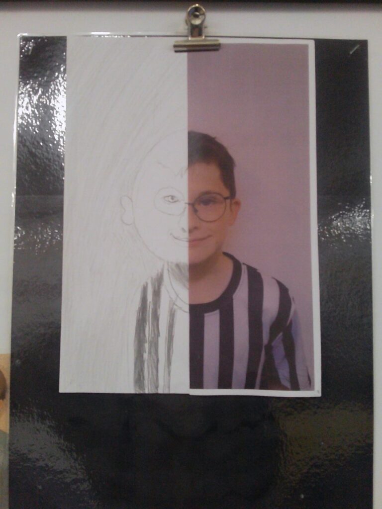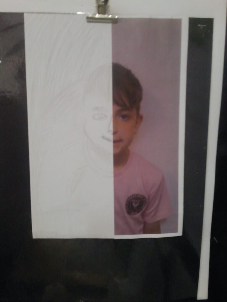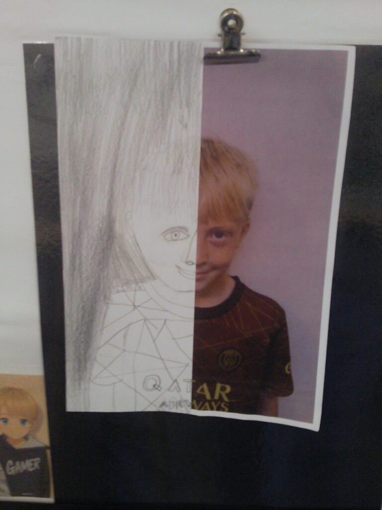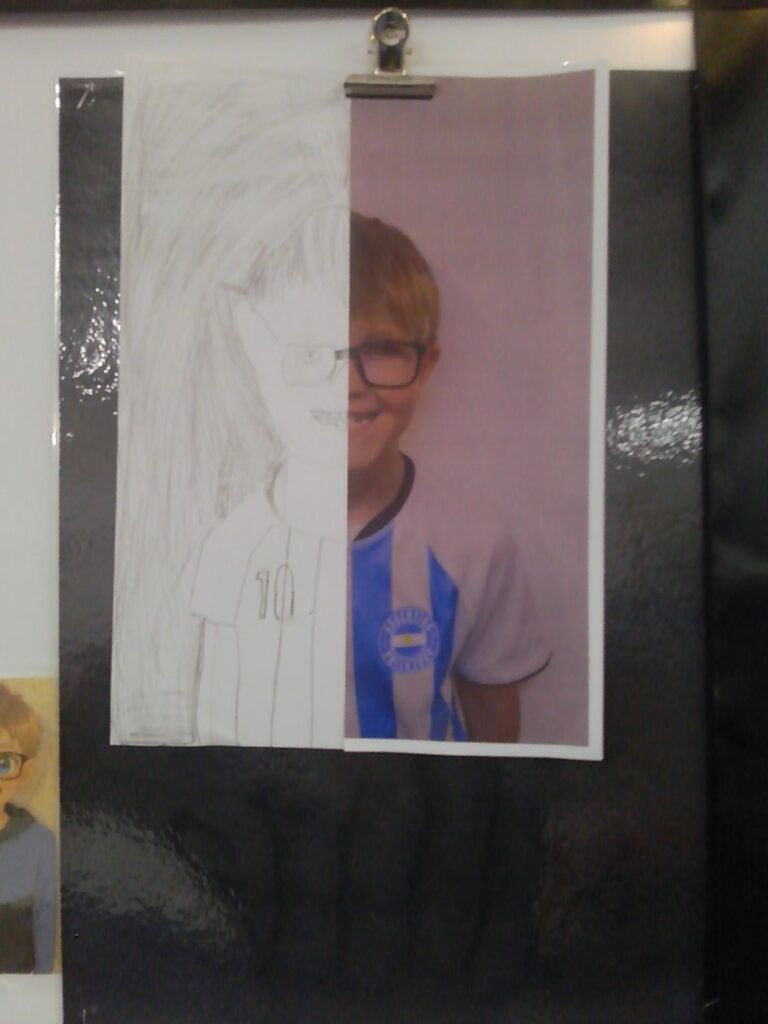 The children we given a photograph of half of their face. They then drew and shaded the other half in pencil.